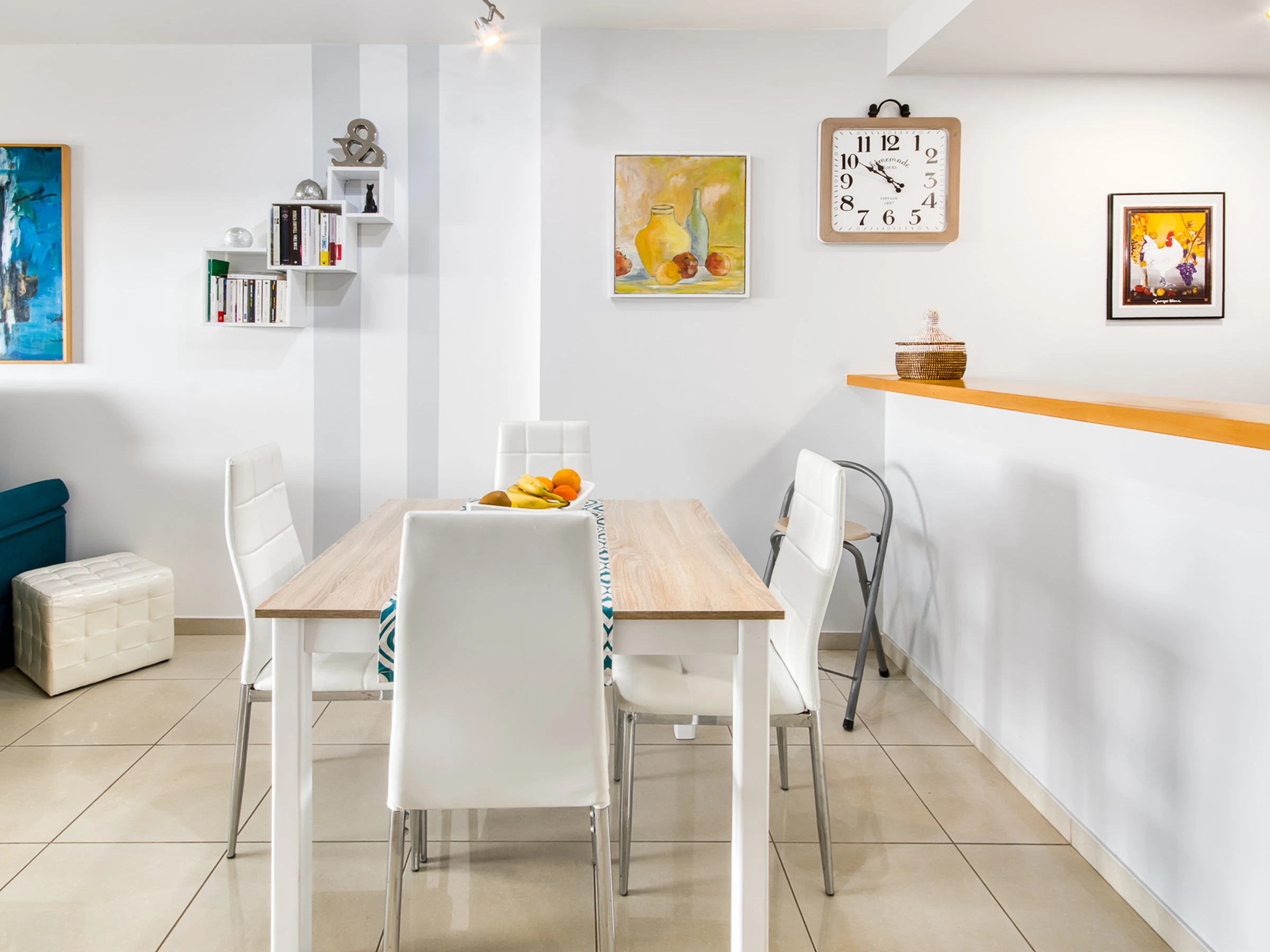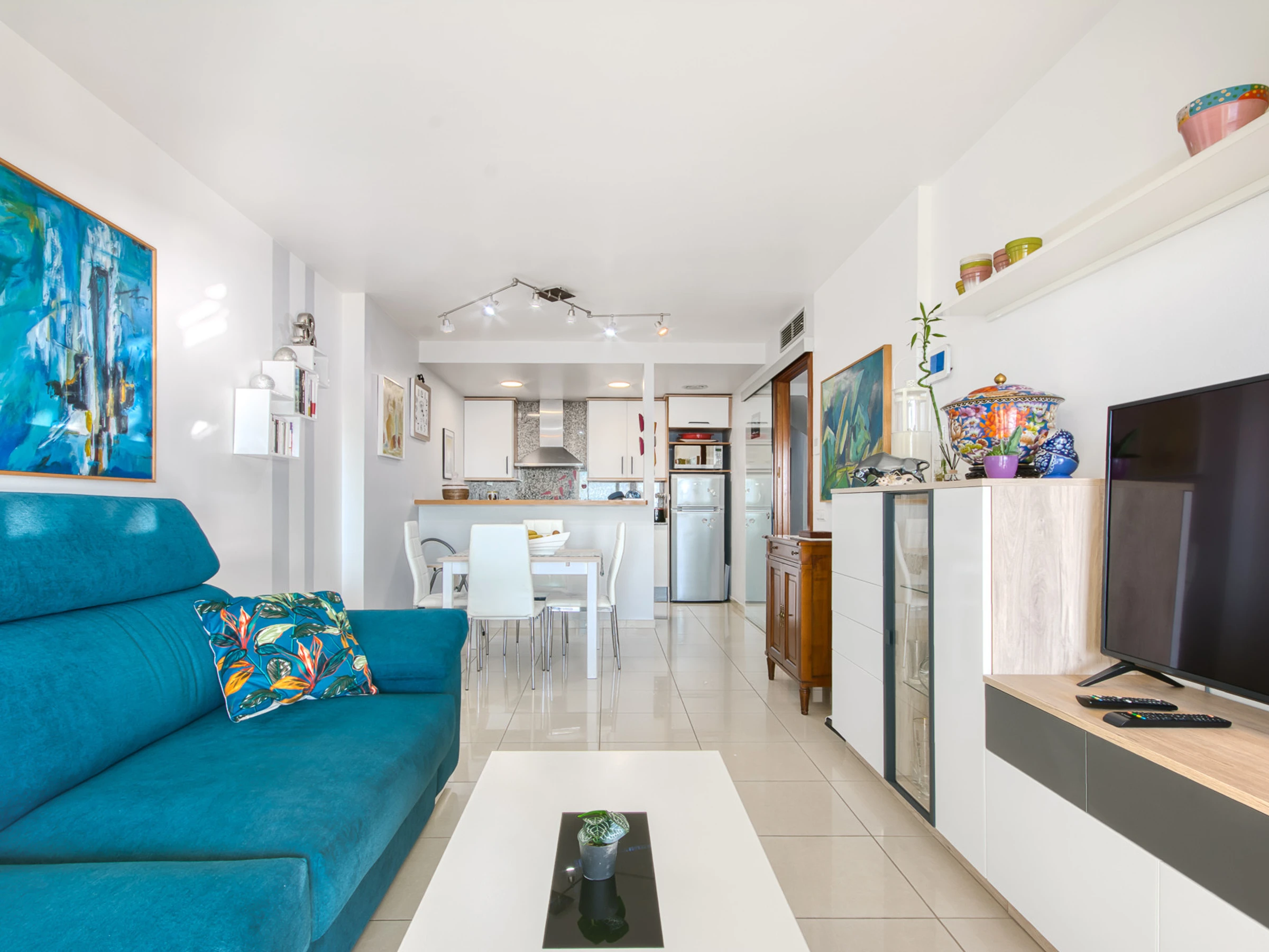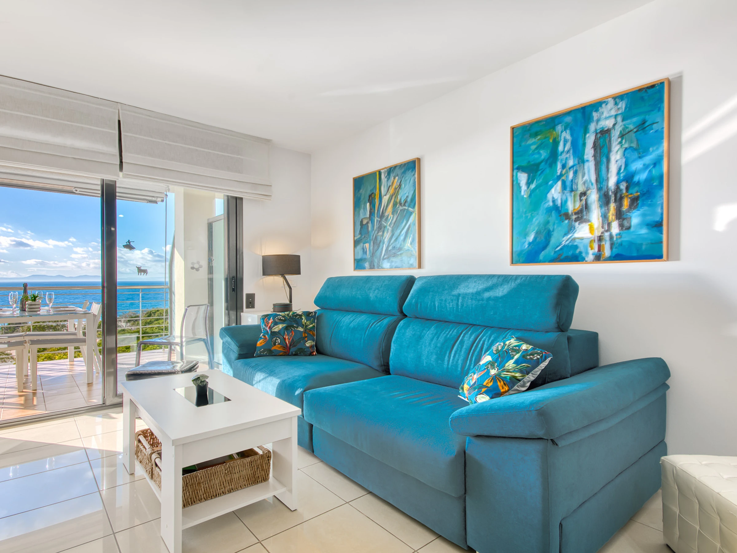 • Grand salon-salle à manger avec de grandes baies vitrées s'ouvrant sur une terrasse privée de 10m2 avec vue sur la mer. Équipé d'un canapé confortable, table pour 4 personnes, TV satellite (chaînes internationales).