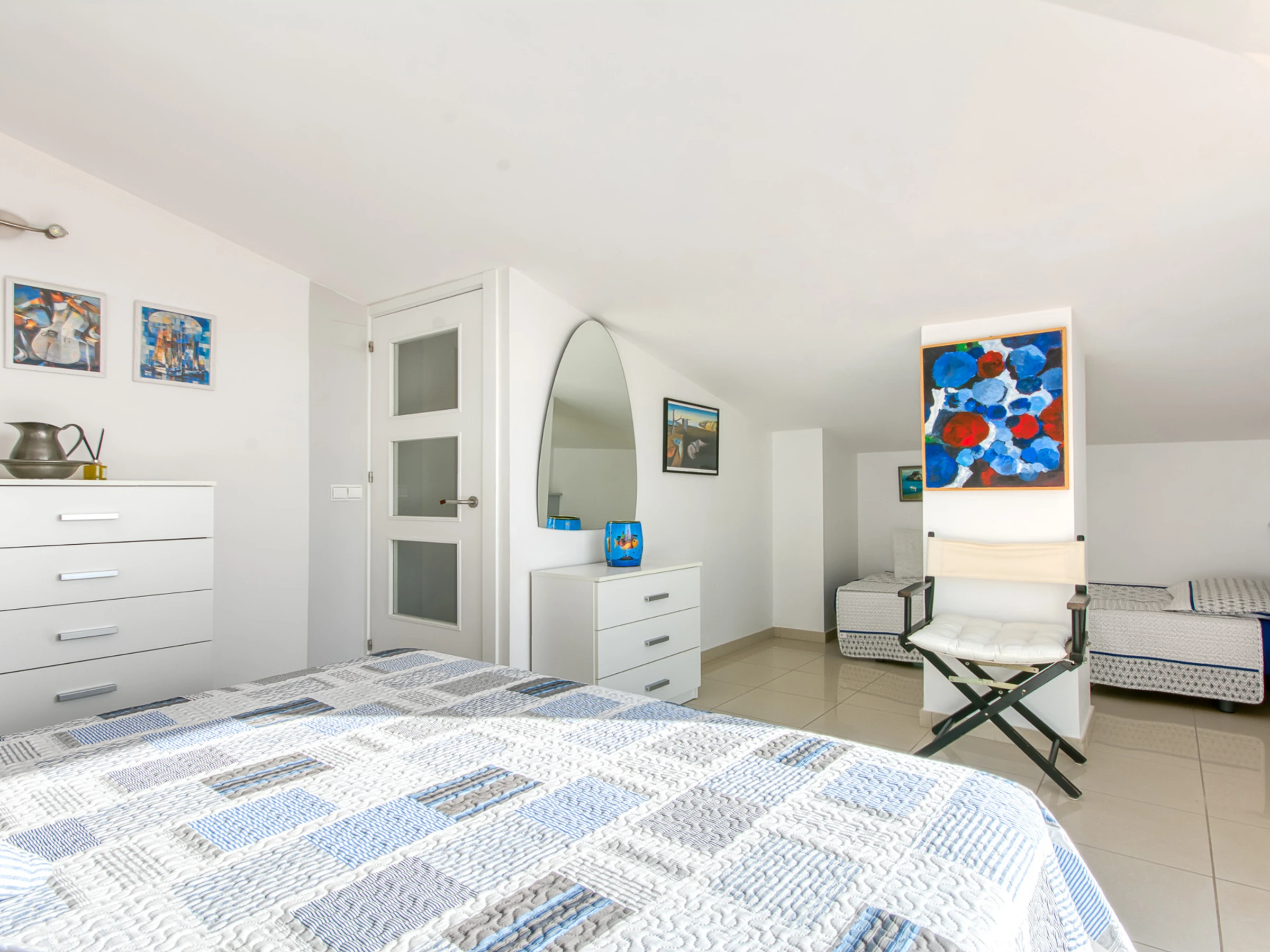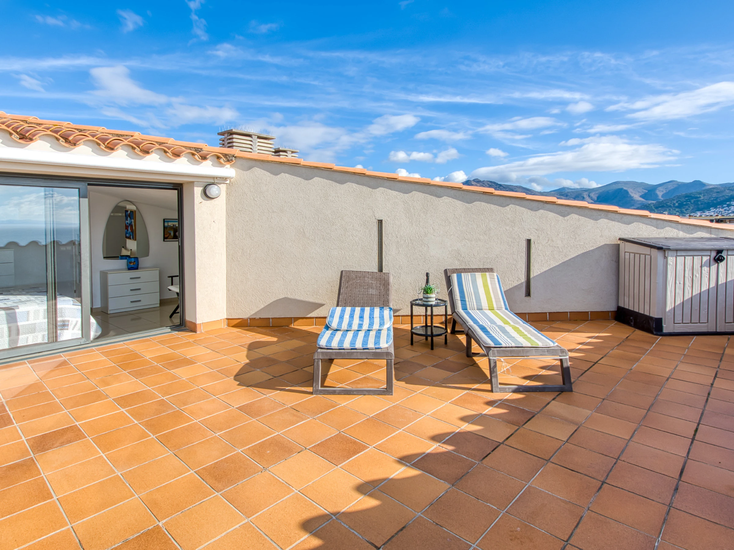• Terrasse/solarium privée de 20 m2 à l'étage supérieur avec vue panoramique sur la mer et deux chaises longues idéales pour se détendre.