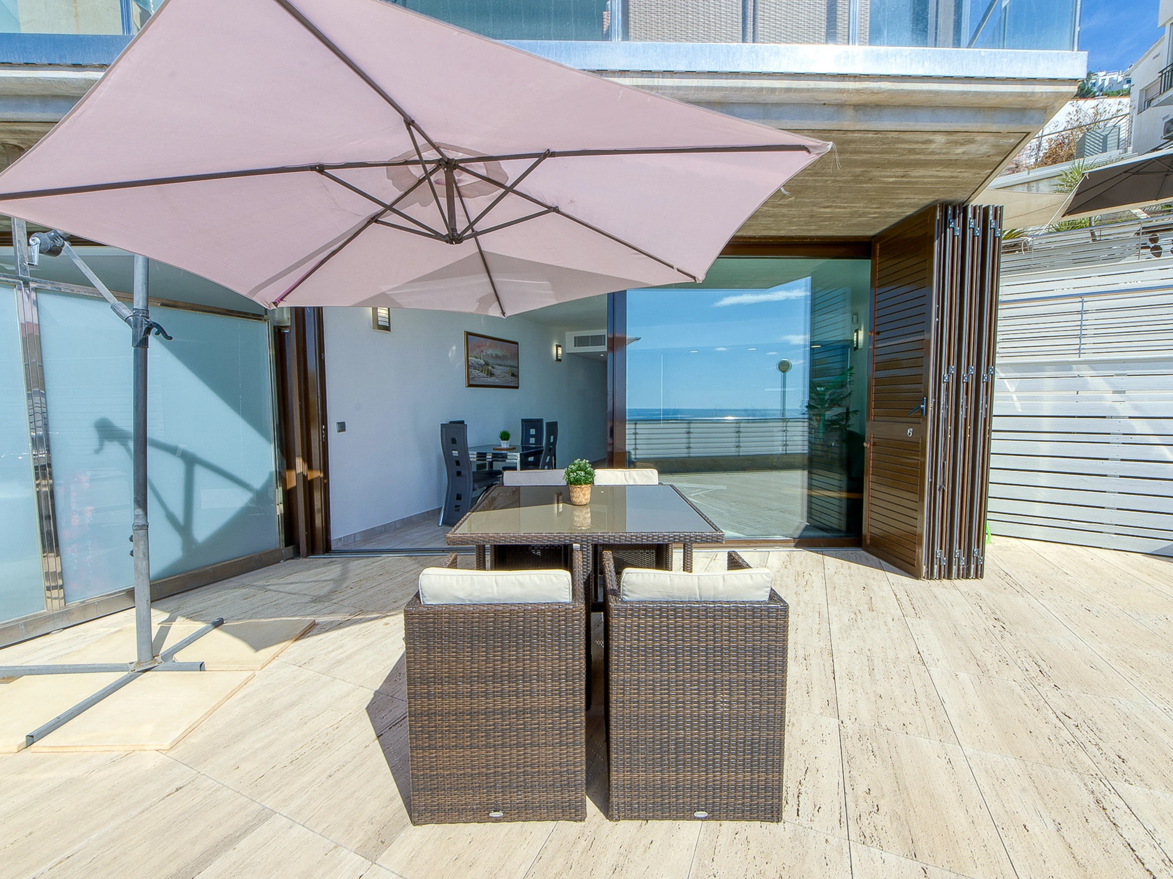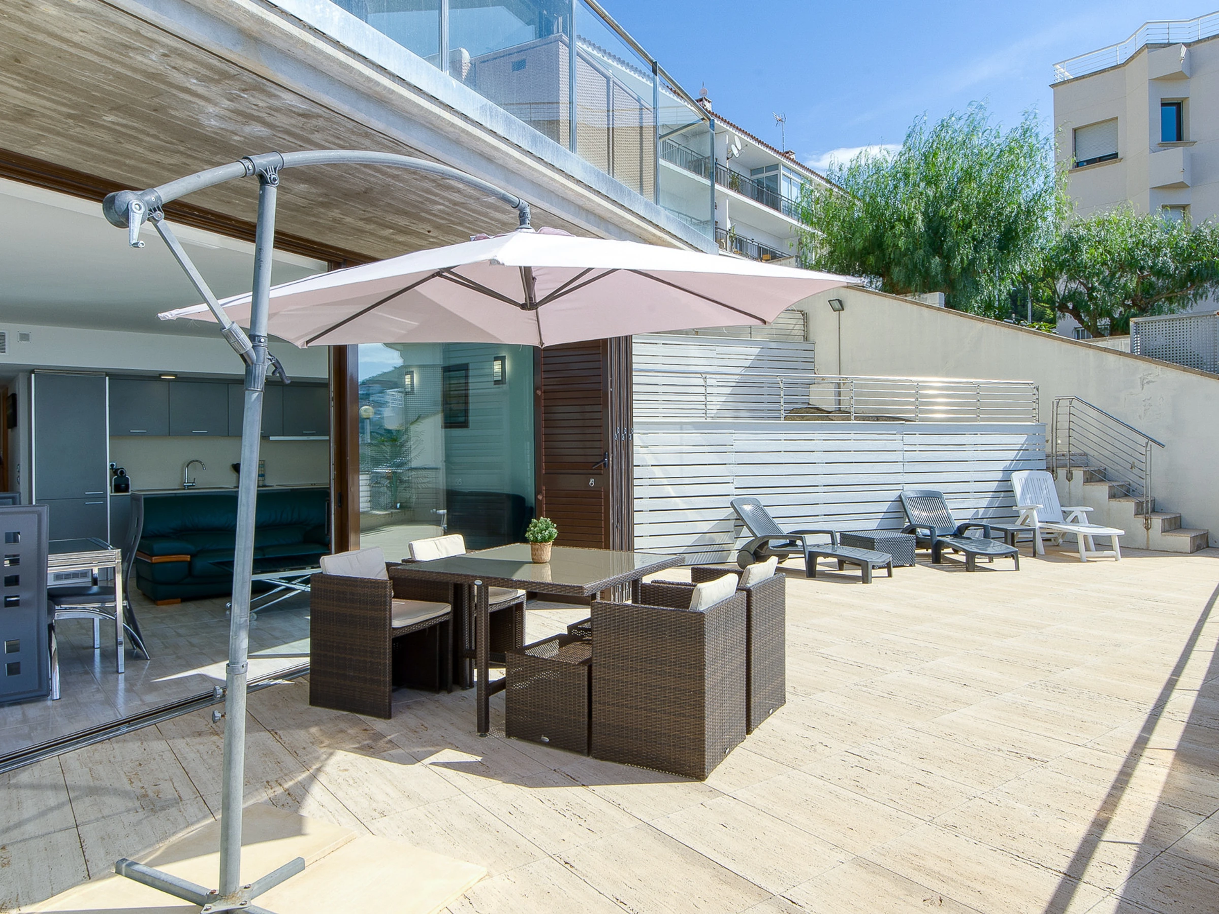 Ce logement offre une large gamme de commodités premium : mobilier de terrasse, climatisation, connexion wifi, piscine communautaire et parking privé dans le même immeuble. Il dispose également d'un lave-linge, d'un sèche-linge et d'une télévision avec chaînes par satellite pour un séjour totalement confortable.