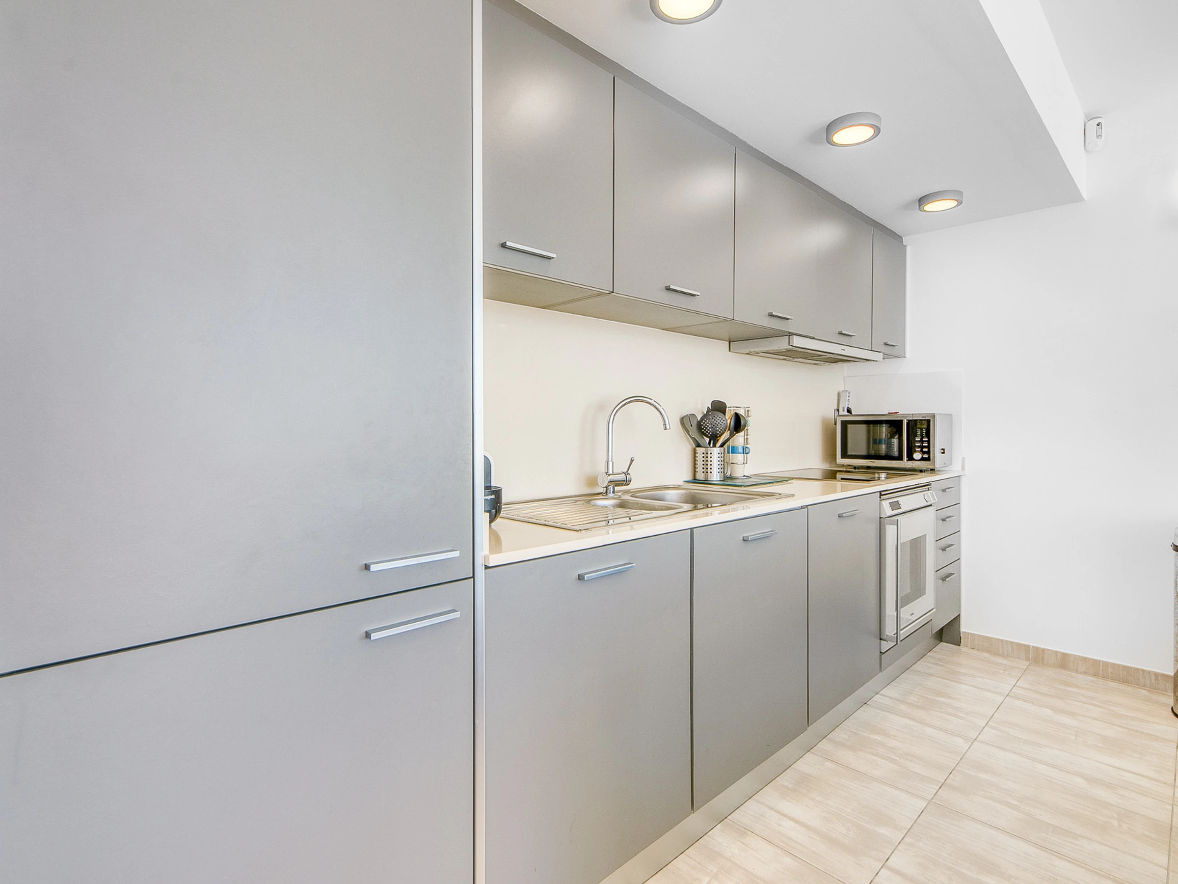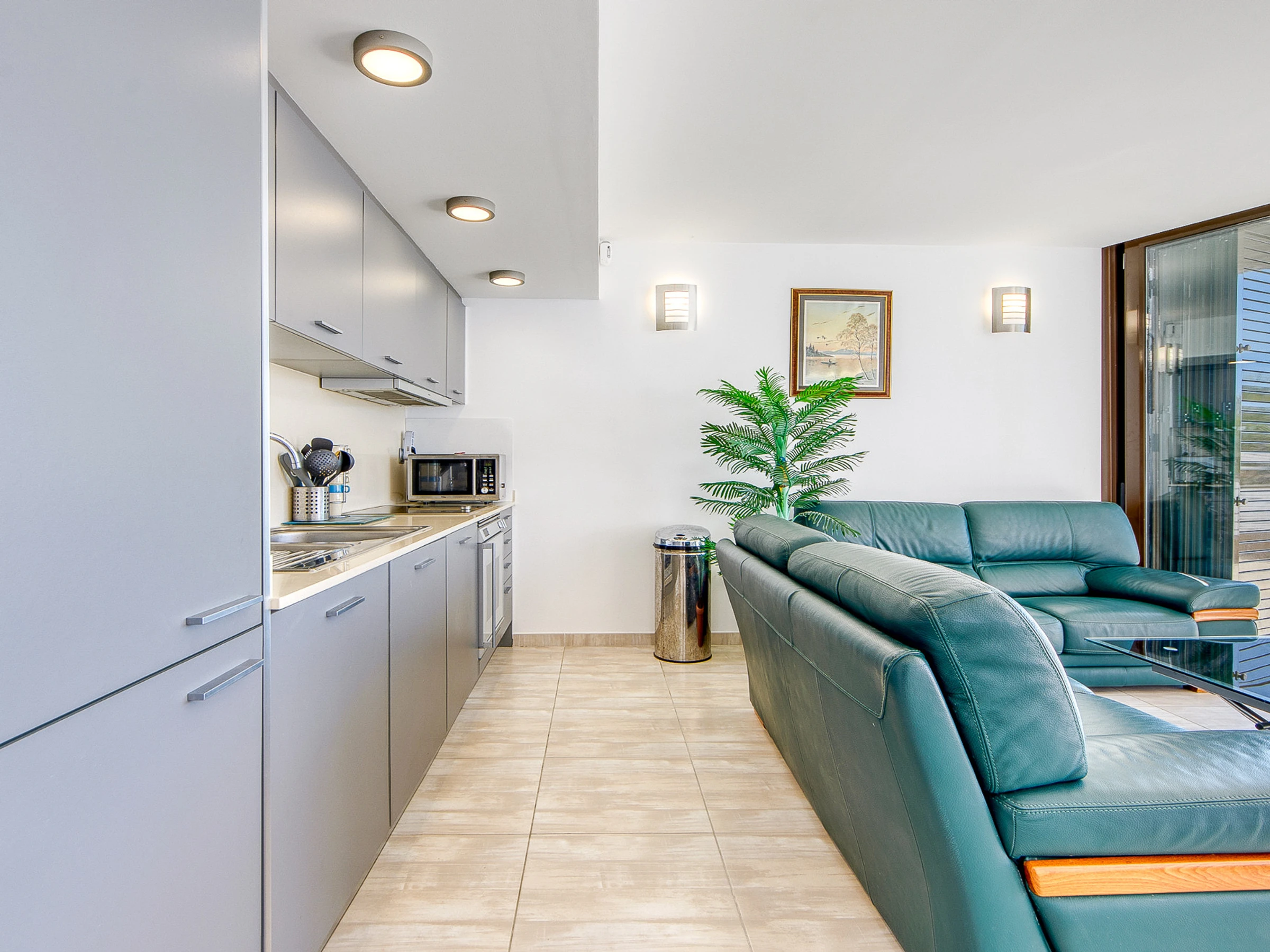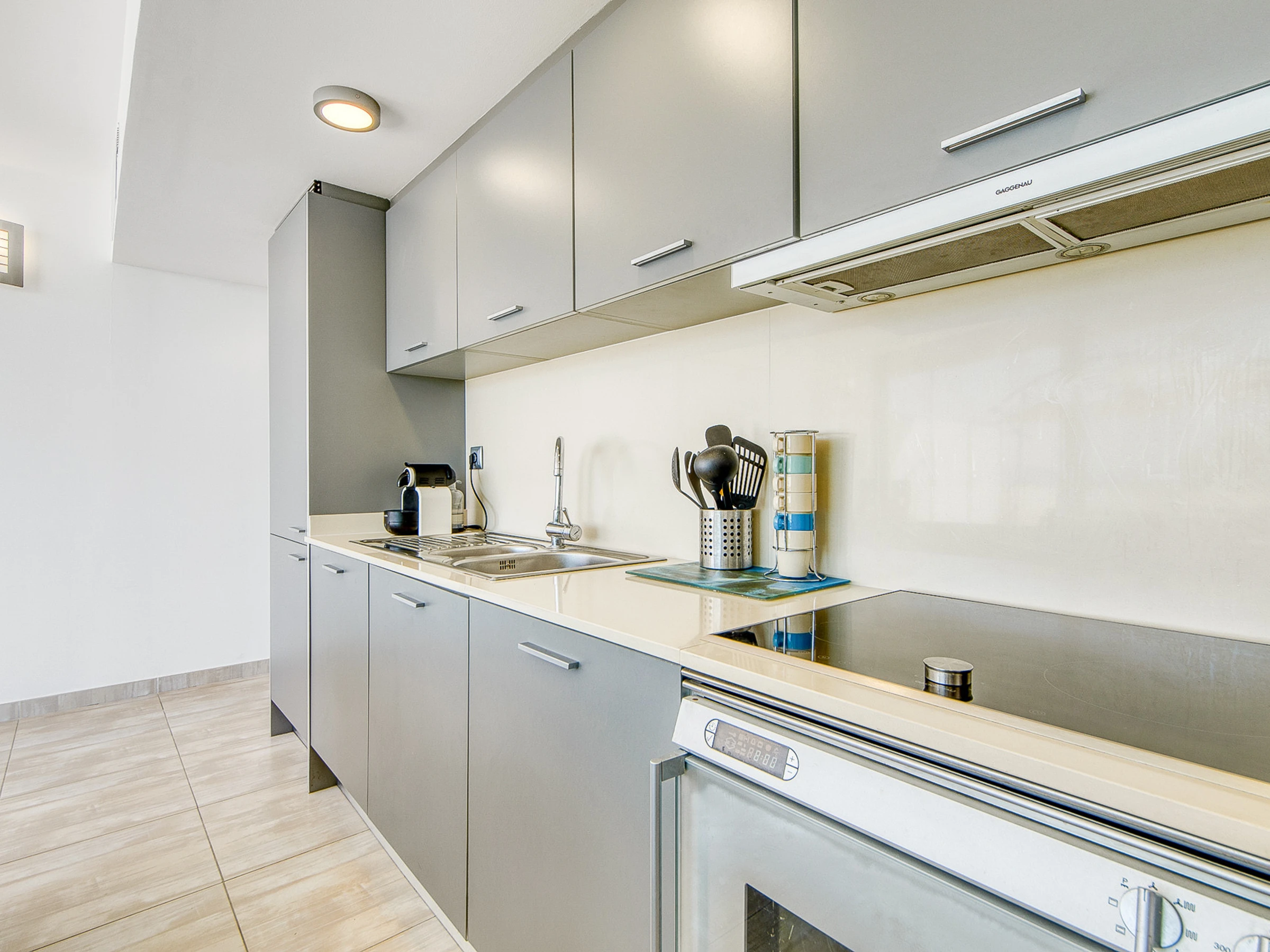 La cuisine indépendante, moderne et entièrement équipée, comprend une plaque à induction, un réfrigérateur, un congélateur, un micro-ondes, un four, un lave-vaisselle, une cafetière, un grille-pain et un bouilloire, idéal pour préparer confortablement tous les repas pendant votre séjour.