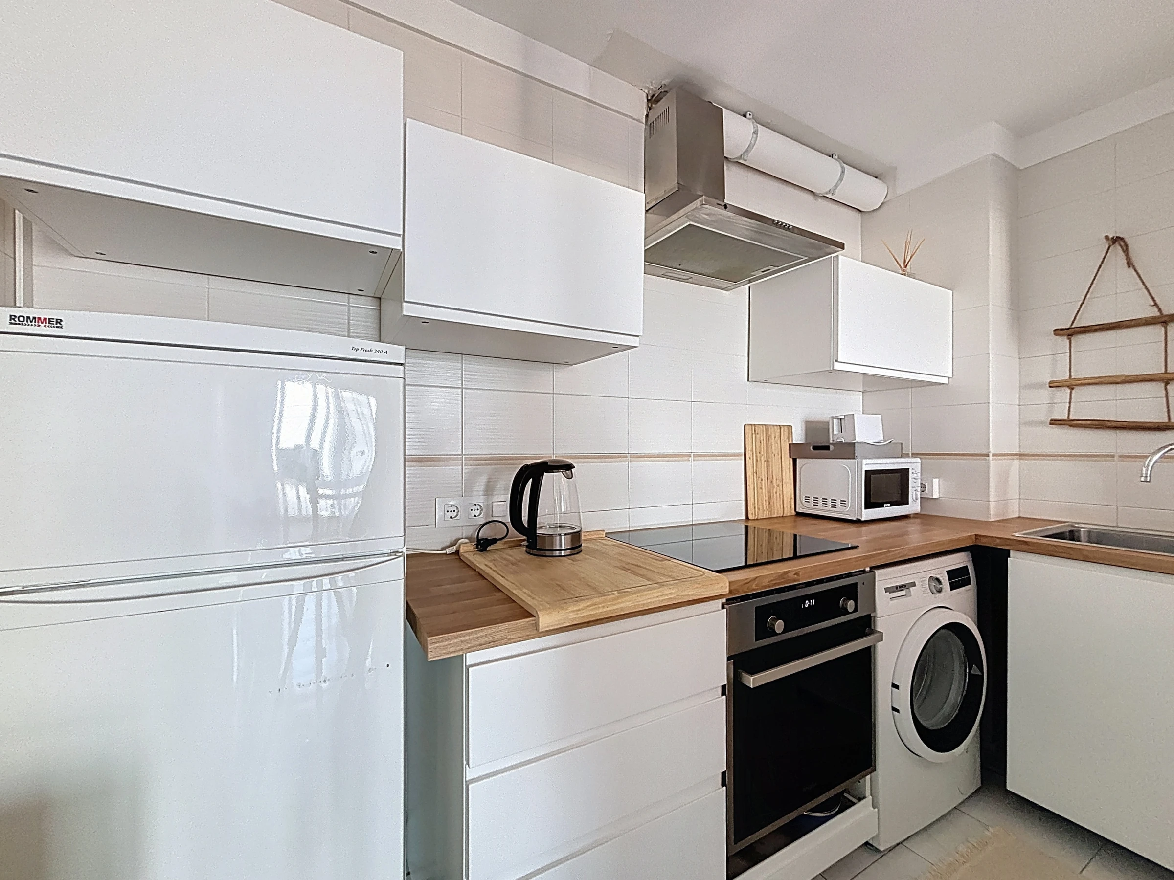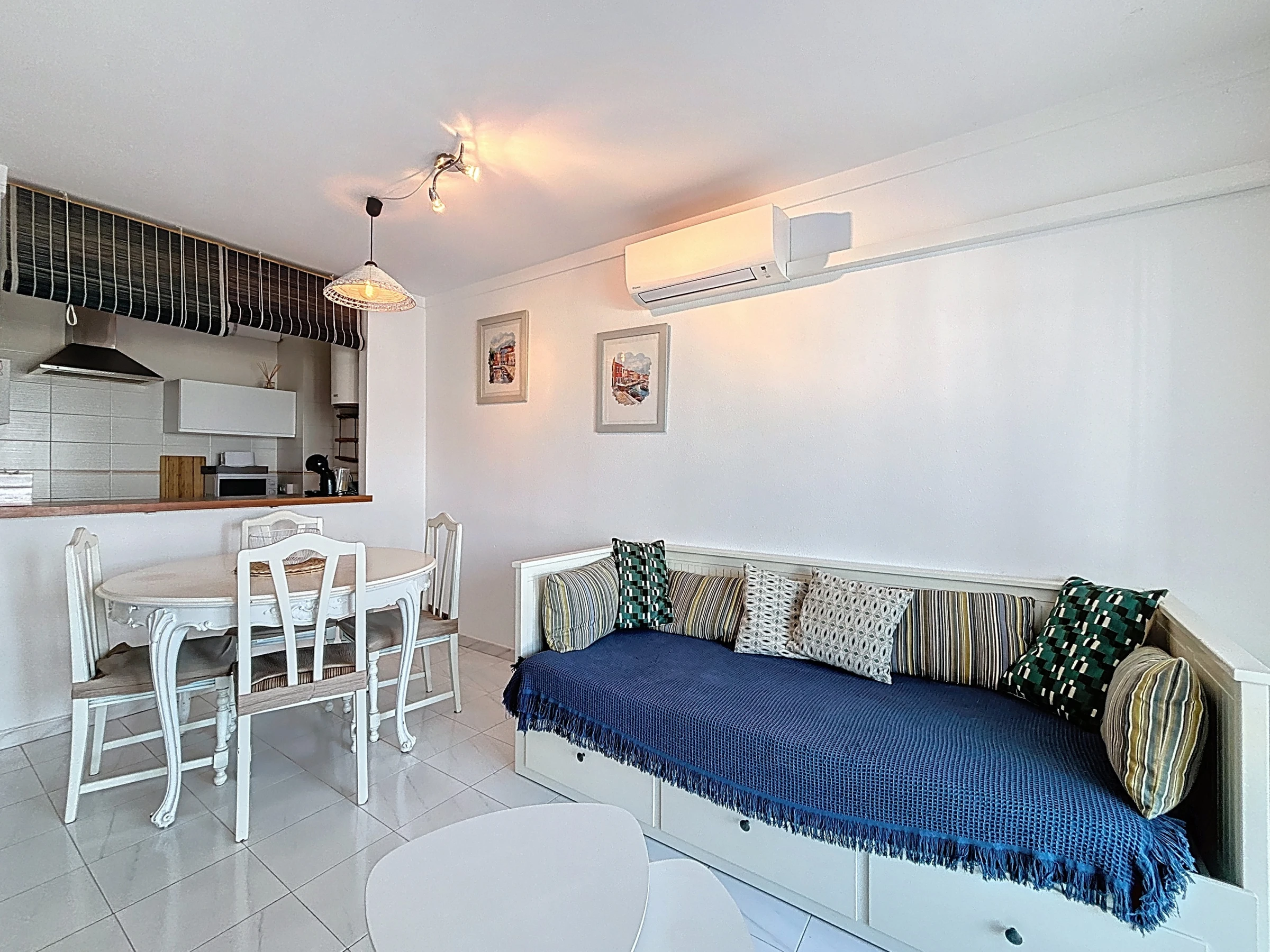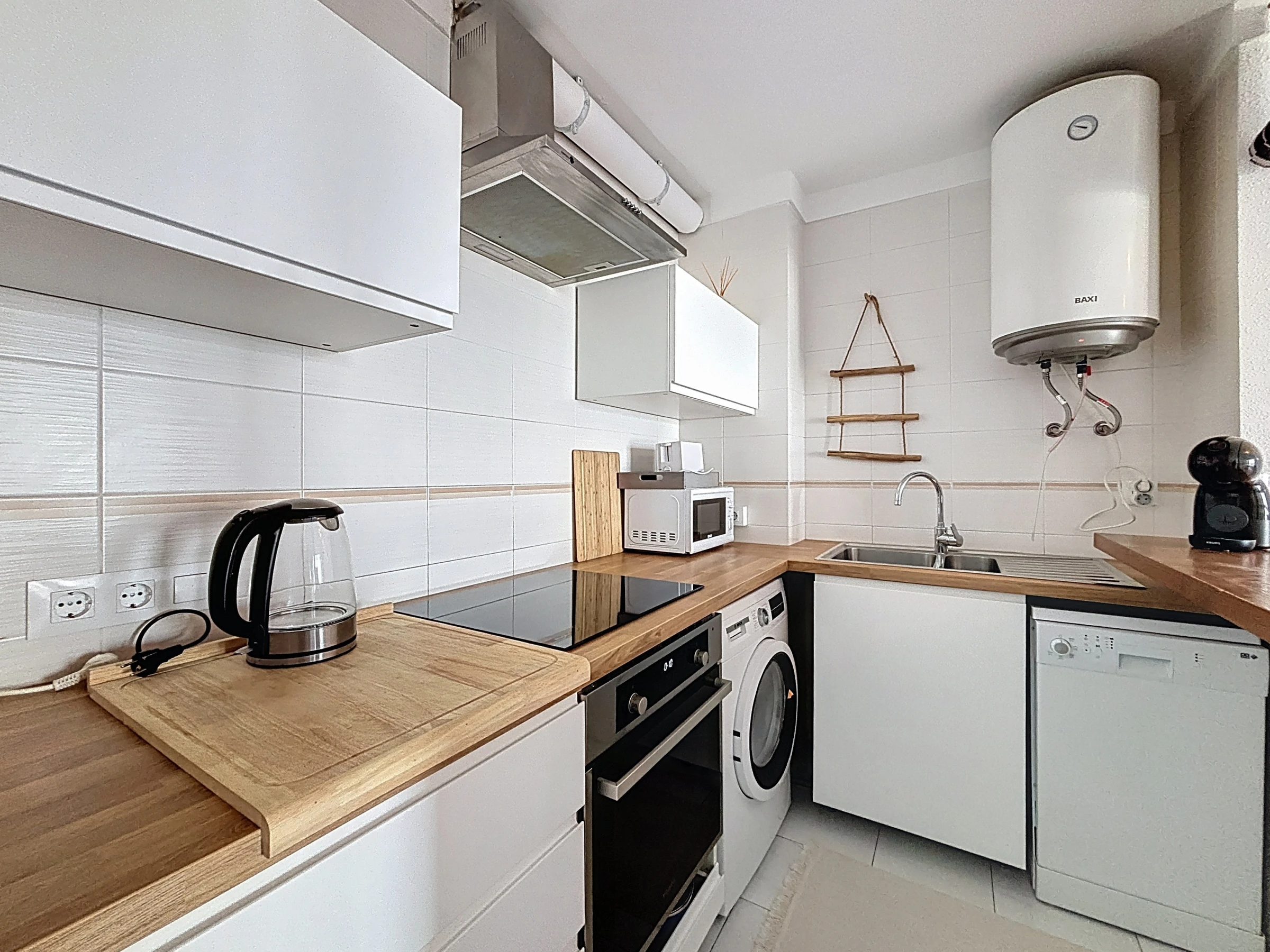 L’appartement dispose d’une cuisine américaine moderne et entièrement équipée : réfrigérateur, micro-ondes, congélateur, machine à laver, vaisselle, ustensiles de cuisine, cafetière et grille-pain. Pour un confort optimal, il est également climatisé.