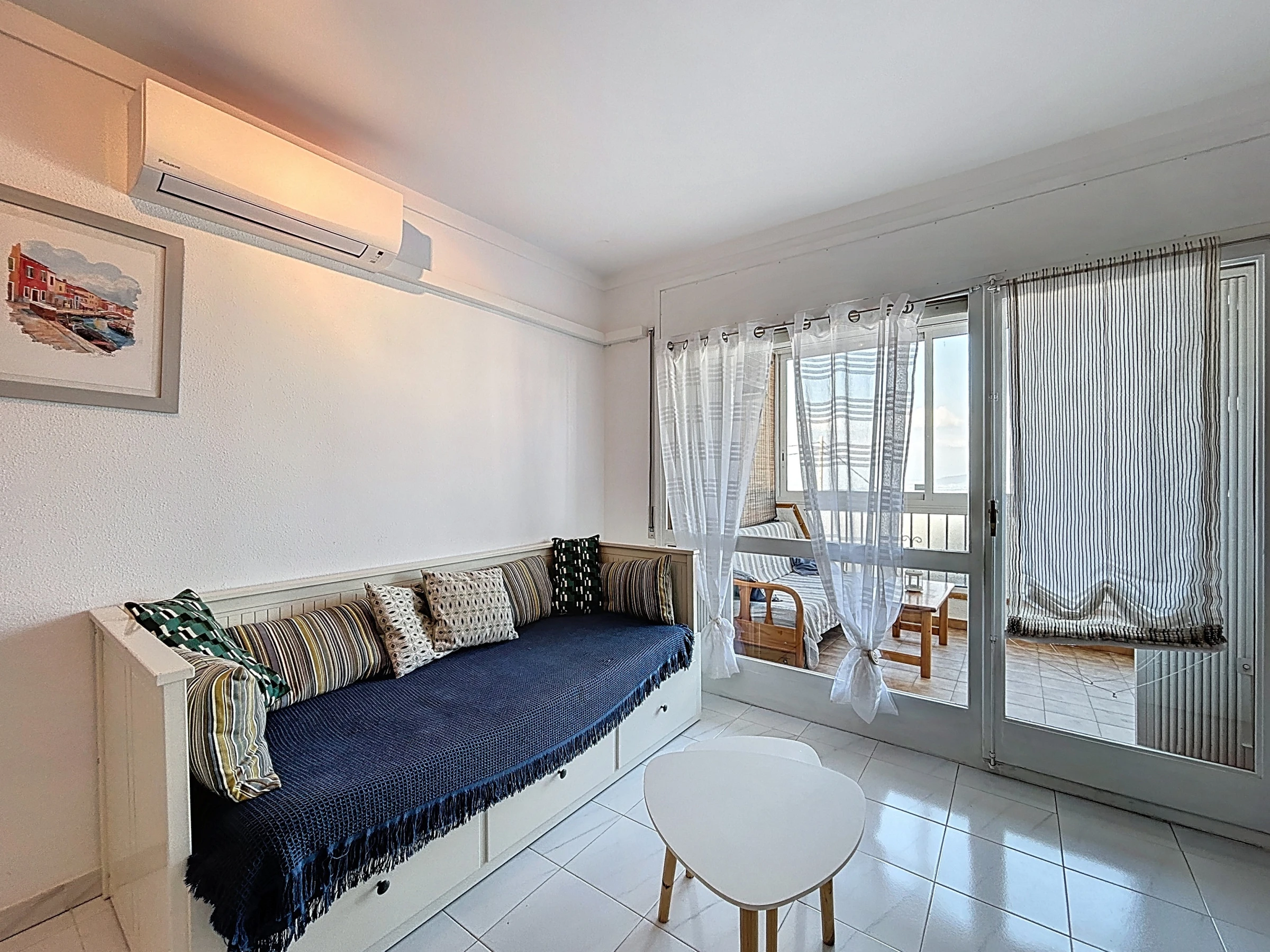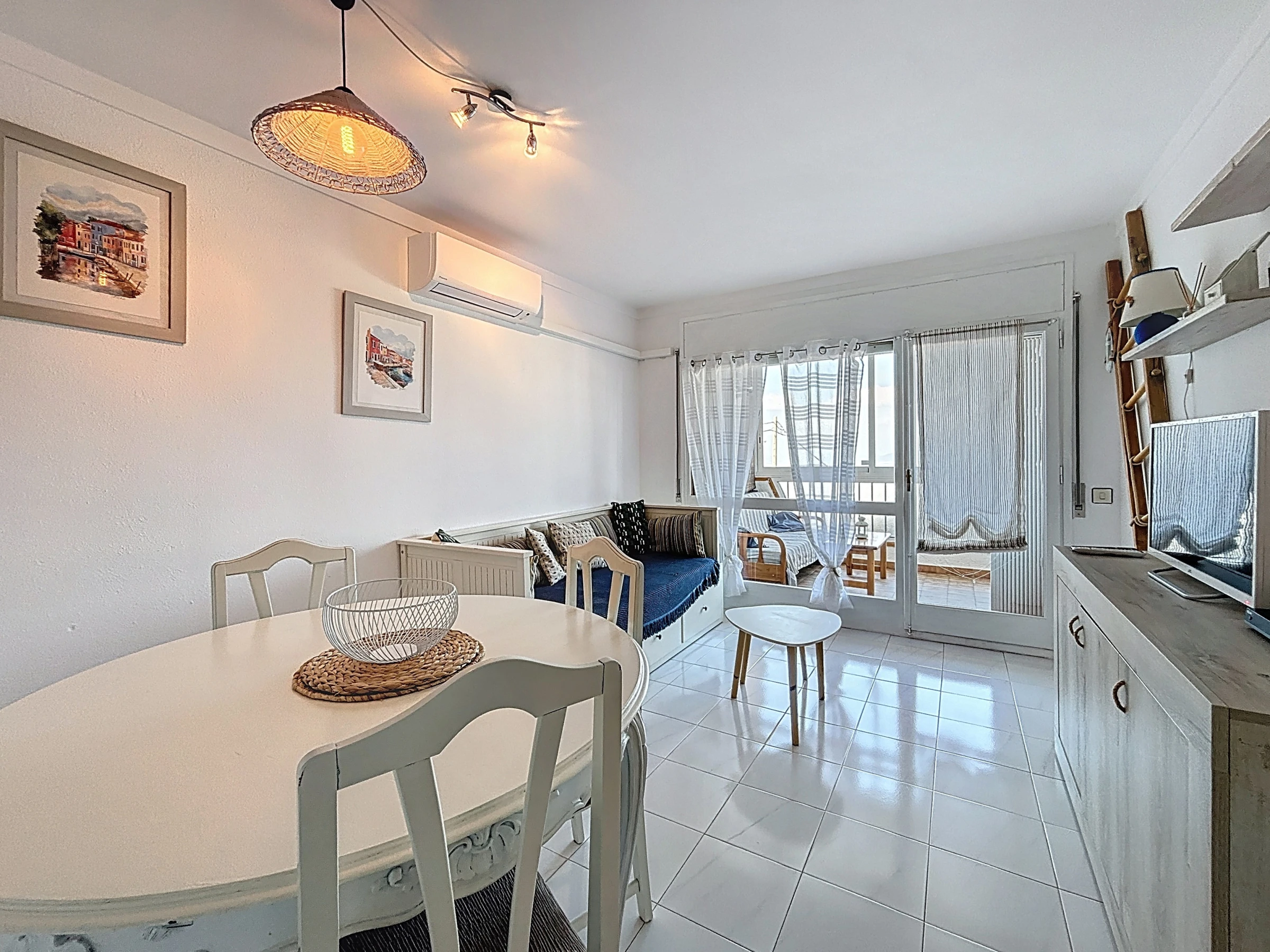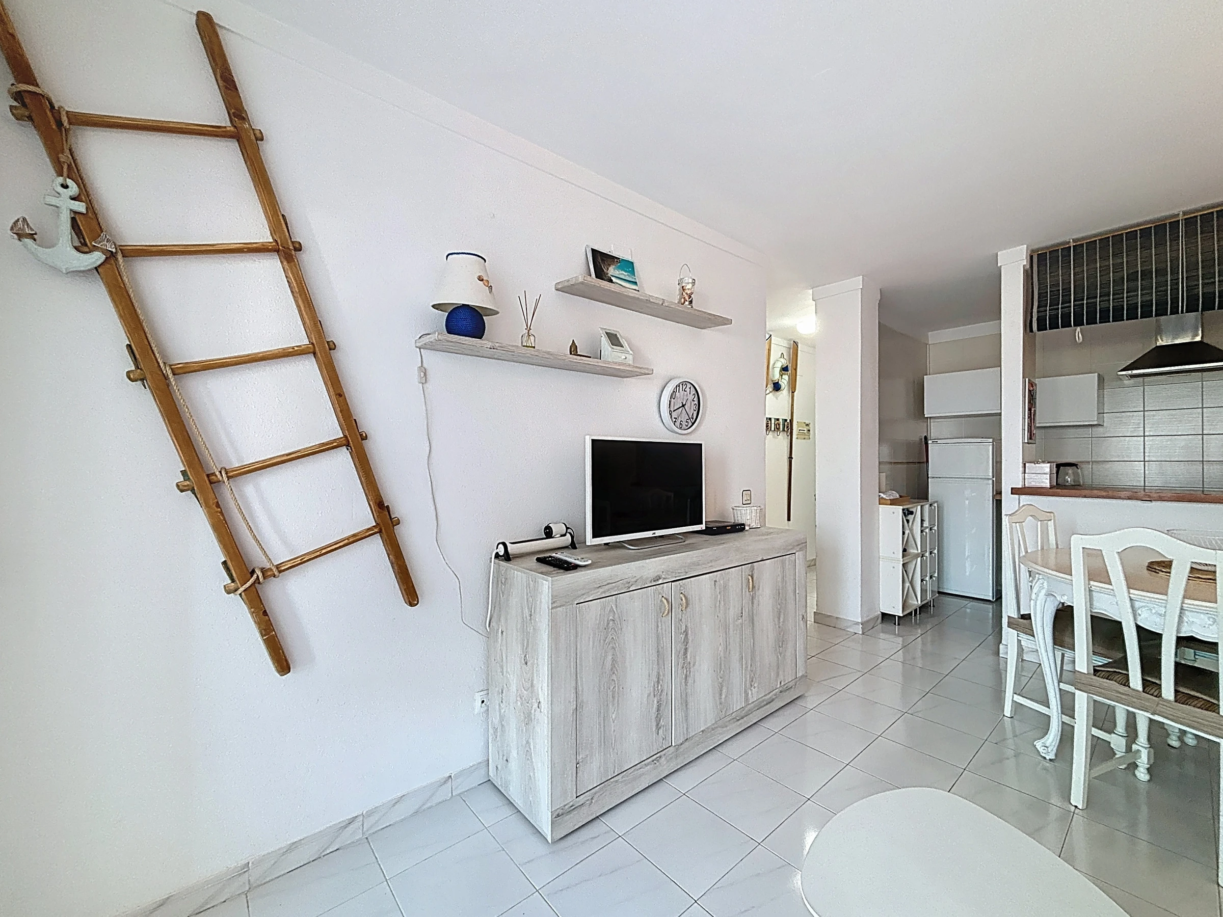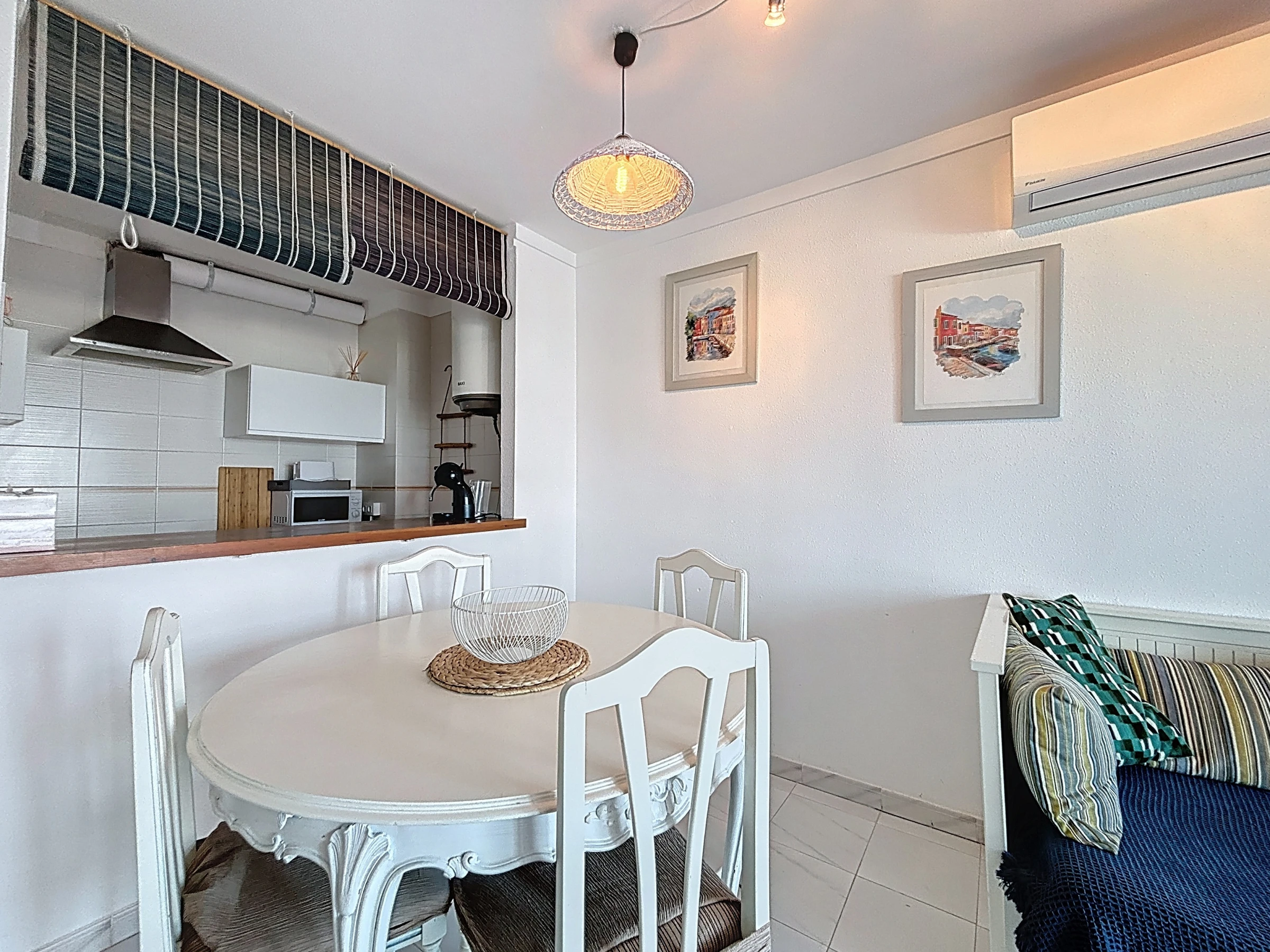 L’appartement dispose d’une cuisine américaine moderne et entièrement équipée : réfrigérateur, micro-ondes, congélateur, machine à laver, vaisselle, ustensiles de cuisine, cafetière et grille-pain. Pour un confort optimal, il est également climatisé.