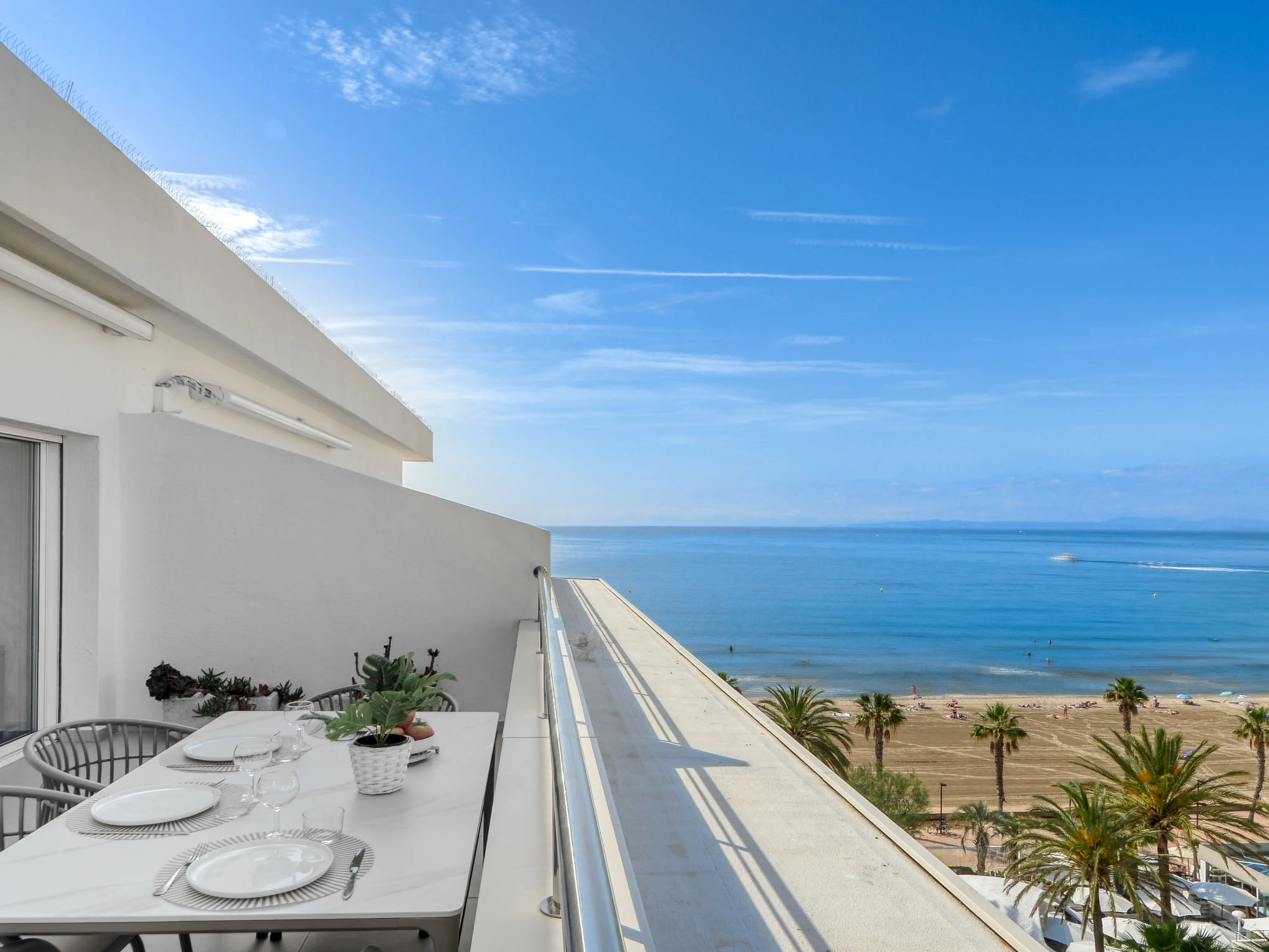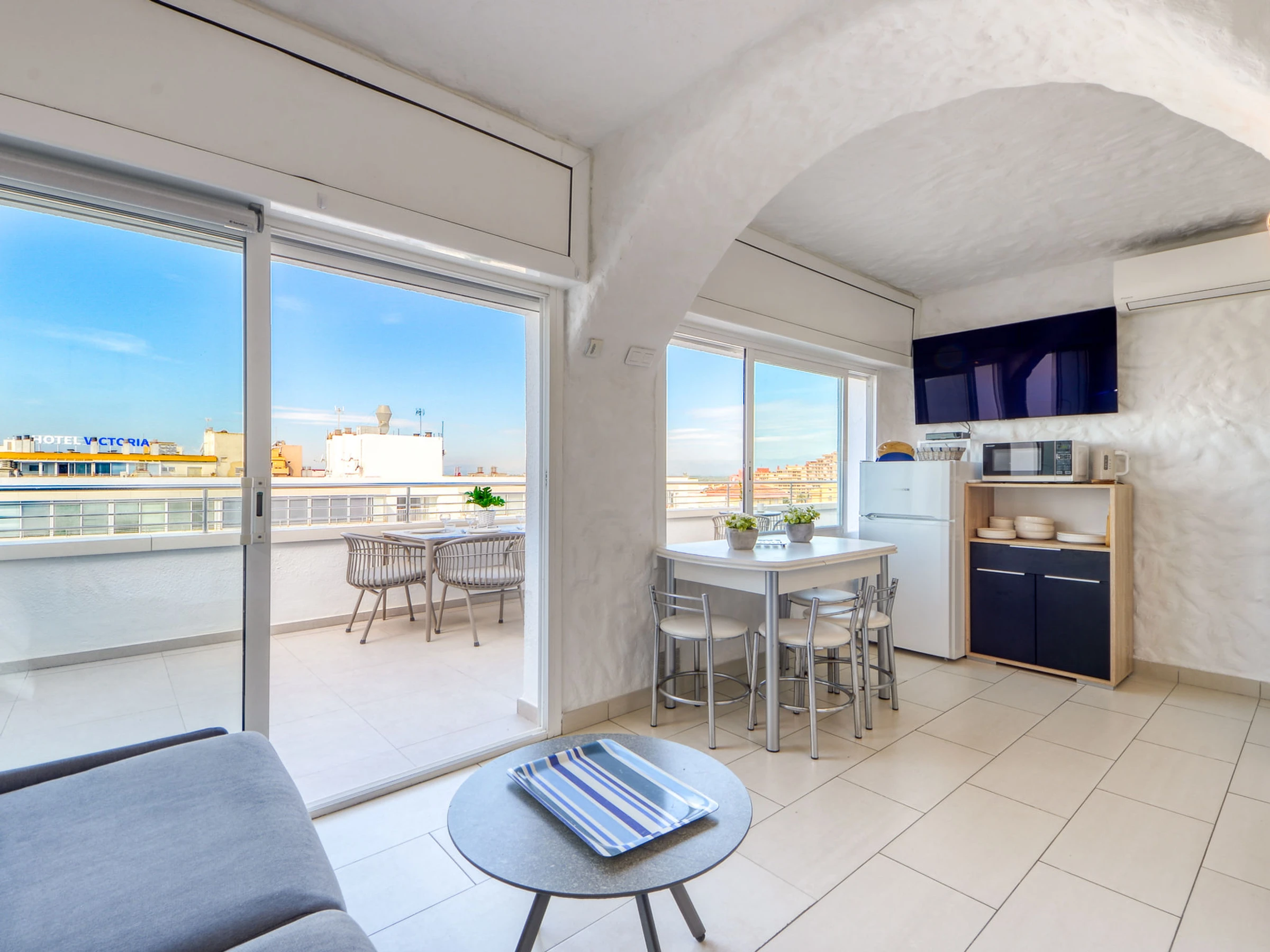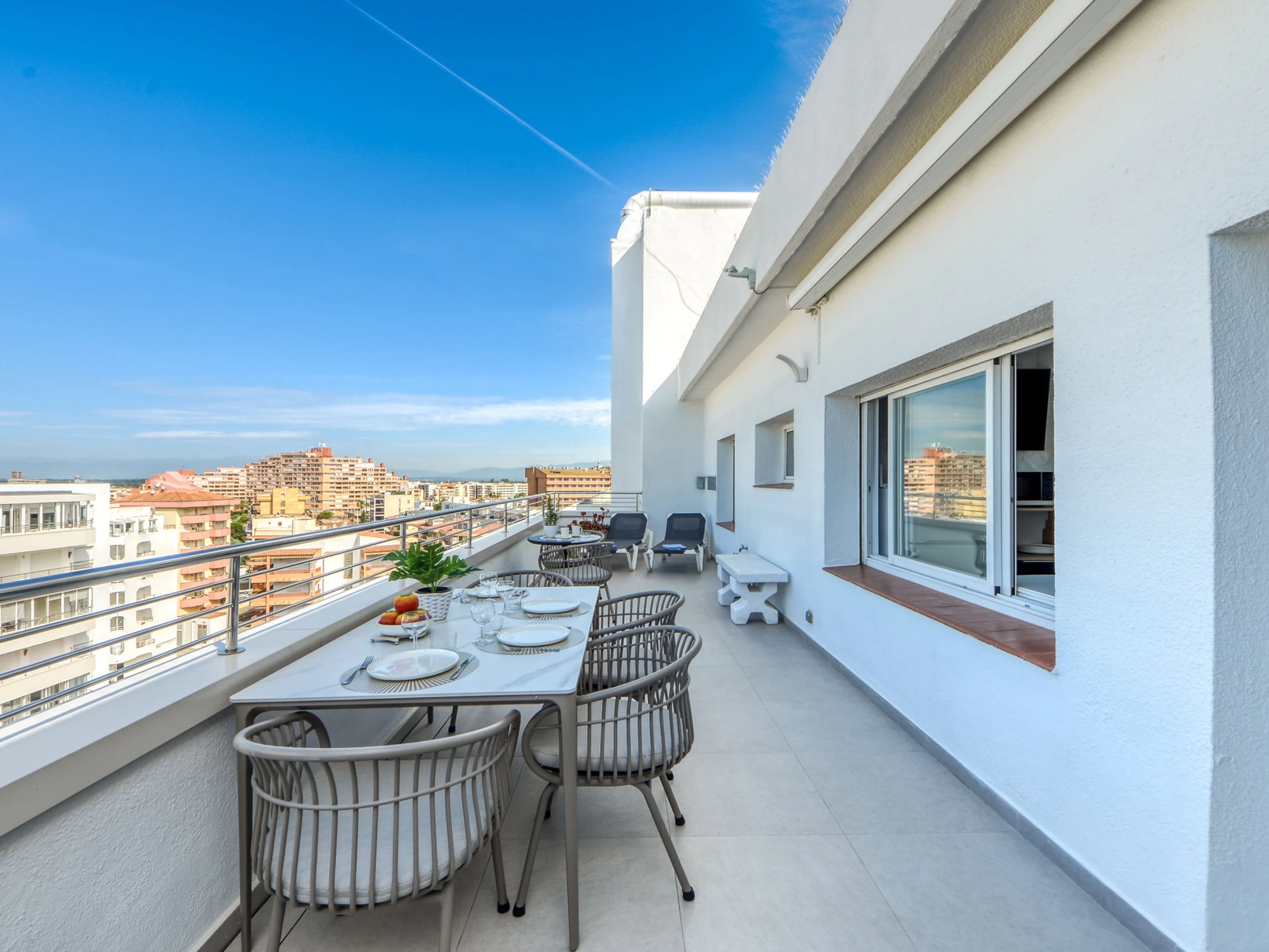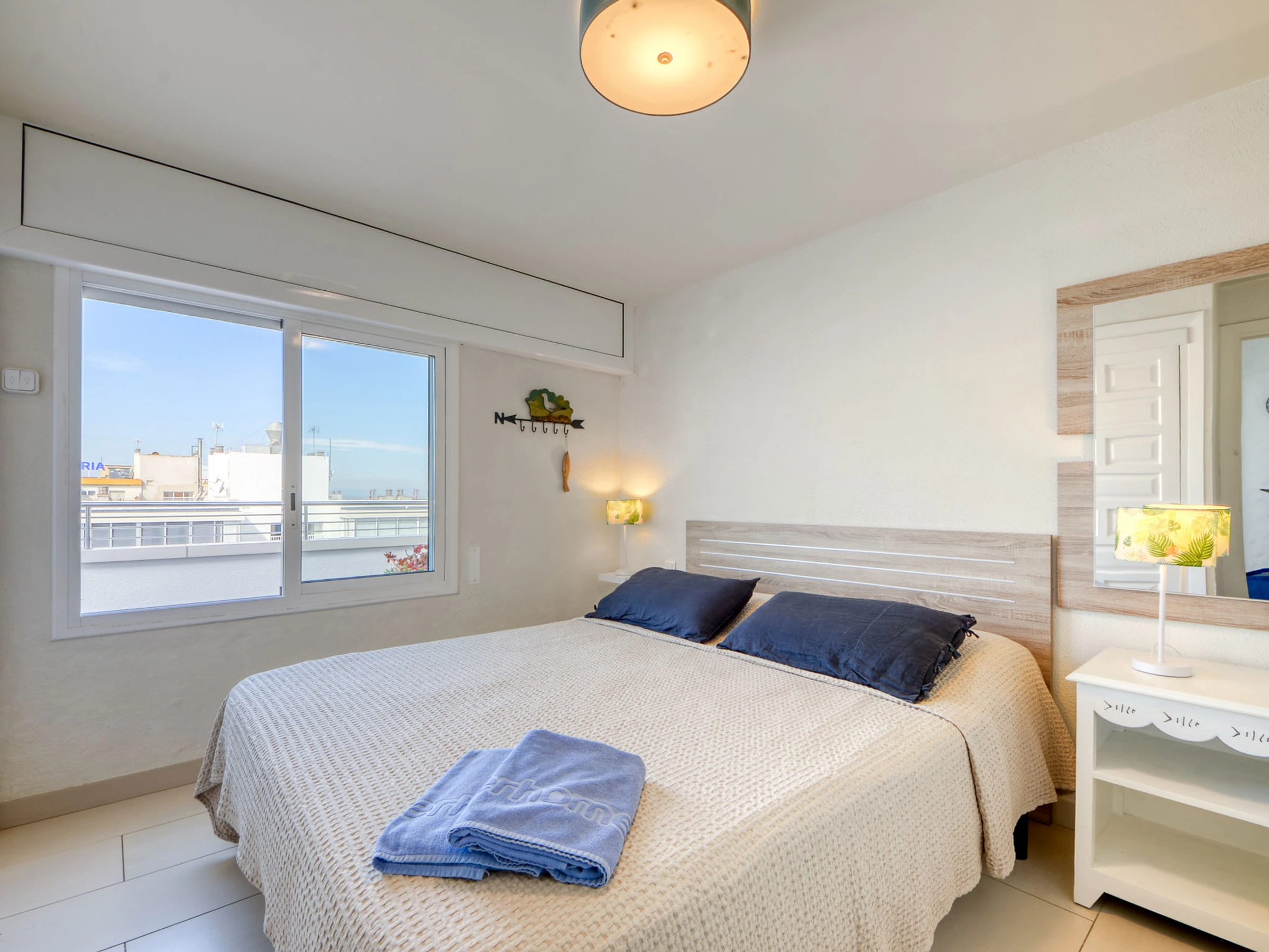 Apt 2 pièces 30 m2 au 8ème étage. Aménagement fonctionnel et agréable: séjour/chambre à coucher ouvert avec 1 x 2 lits superposés, TV (satellite) (écran plat), air-conditionné et volet roulant électrique. Sortie sur la terrasse. 1 chambre avec 1 grand-lit et volet roulant électrique. Cuisine ouverte (2 plaques vitrocéramiques, micro-ondes, congélateur). Douche/WC. Pas de chauffage. Terrasse 27 m2. Meubles de terrasse. Superbe vue sur la mer. A disposition: lave-linge. Internet (Connexion WIFI, gratuit). Veuillez noter: maison non-fumeur. TV seulement FR, DE, ES. La maison a un store électrique avec capteurs de vent. [hidden] // Reg. Nr.: ESFCTU00001701900000440600000000000000000HUTG-[hidden]