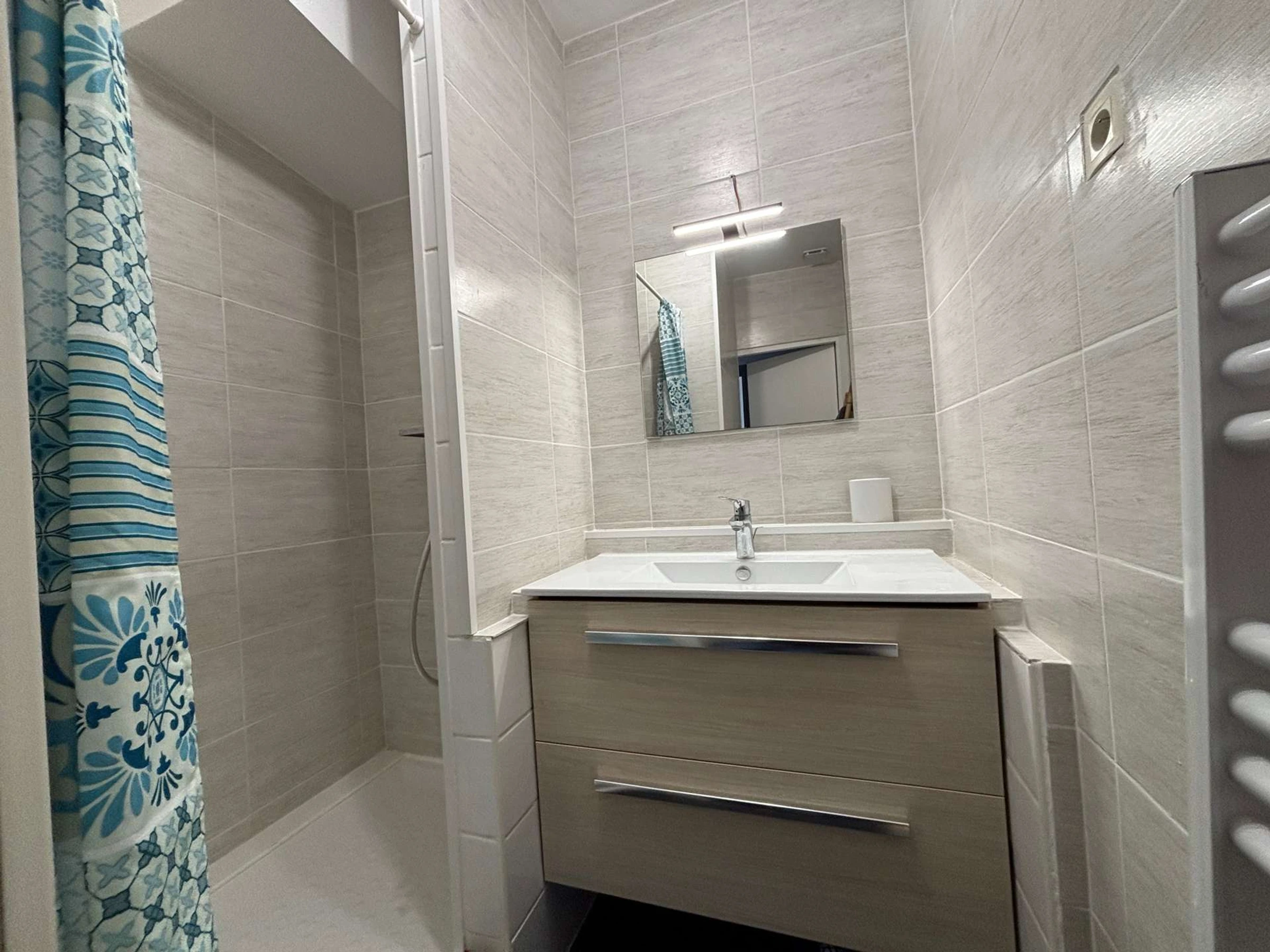 Pour finir, vous pourrais profiter d'une salle d'eau neuve, avec une grand douche, un serviette serviette une belle vasque.