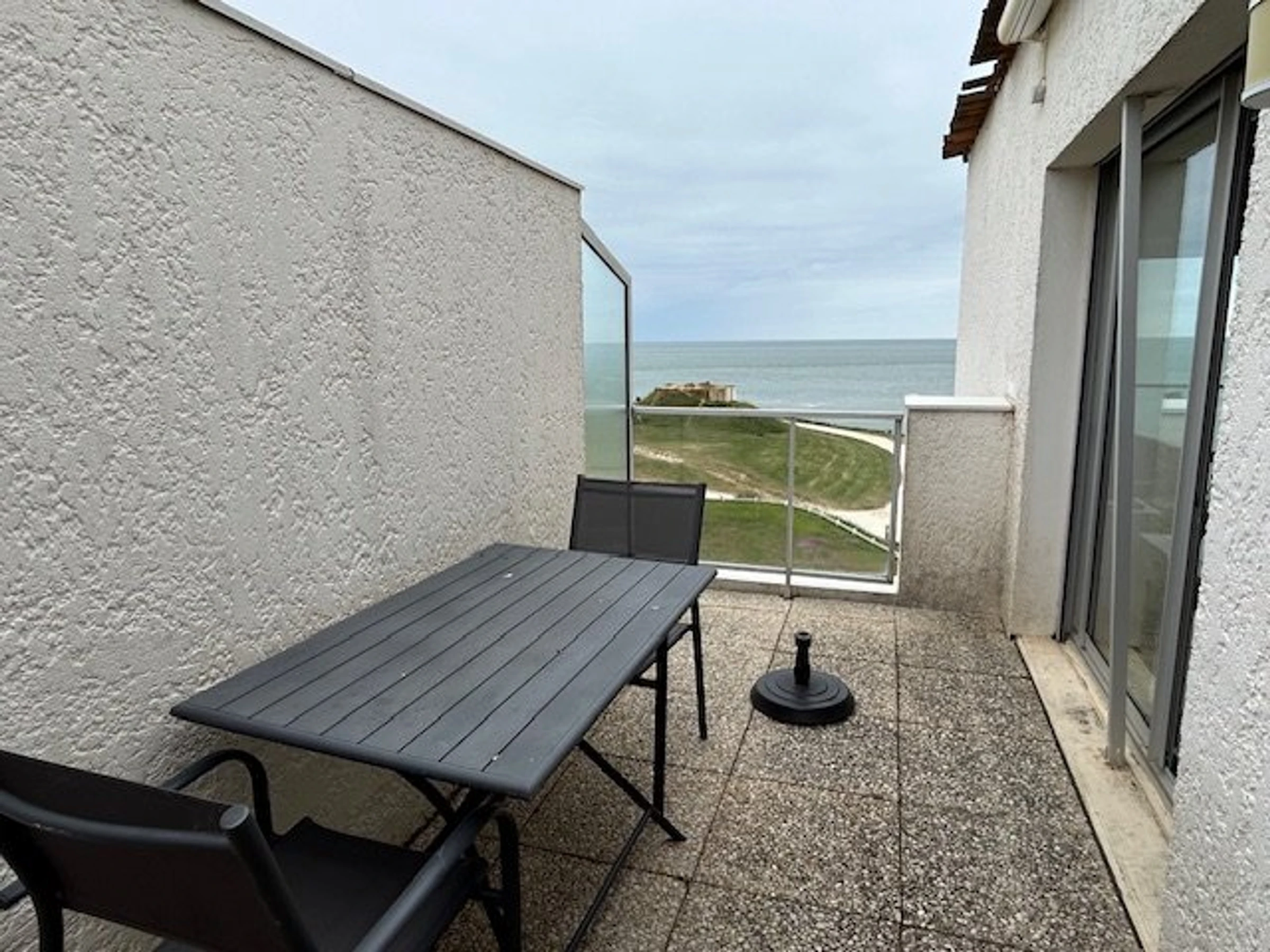 Appartement VUE MER situé sur la Résidence Fort du Chay, proche de la plage, comprenant une cuisine américaine avec feux électriques, une hotte, un four, un micro-ondes, un réfrigérateur table top/freezeur, un lave-vaisselle ; un séjour/salle à manger avec une vue panoramique sur l'Atlantique.