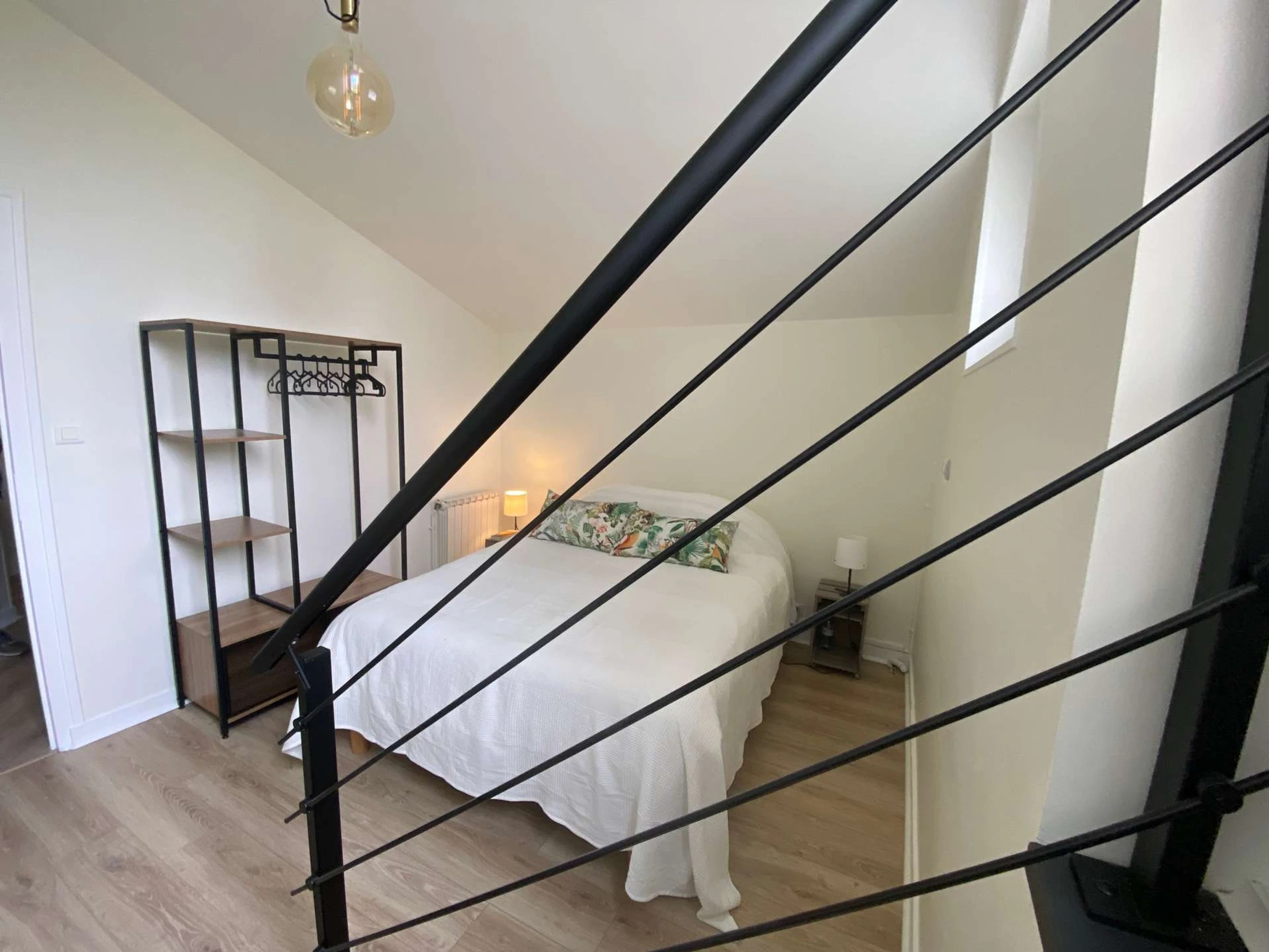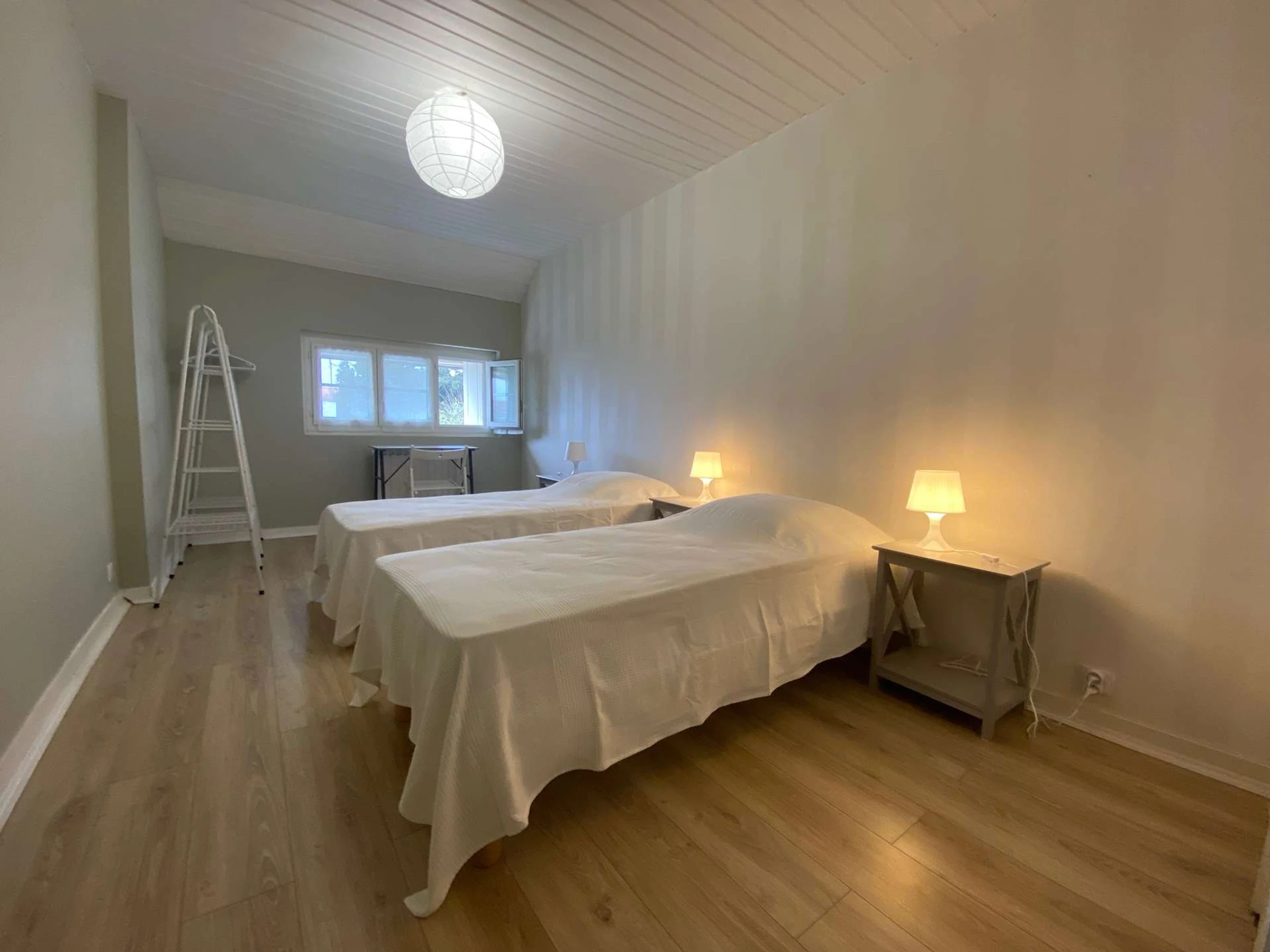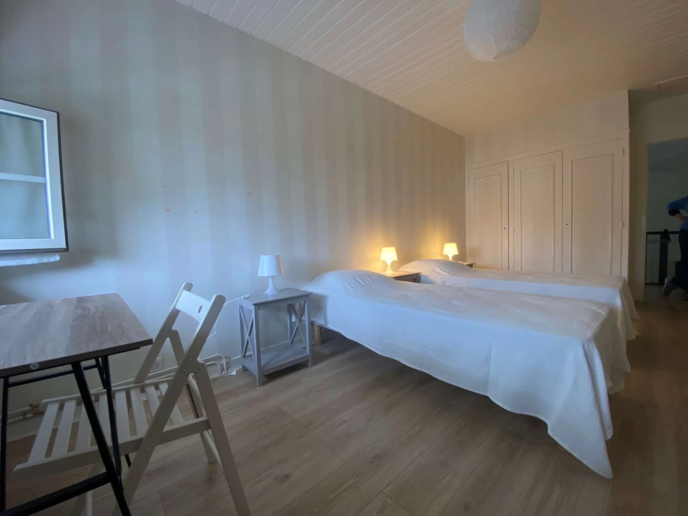 A l'étage deux chambres l'une avec un lit 140 cm et un accès particulier à un solarium et l'autre avec une chambre avec deux lit en 80 cm. pour 1 personnes et un lit pliant adulte, une salle d'eau avec douche, lavabo rangement et lave linge.