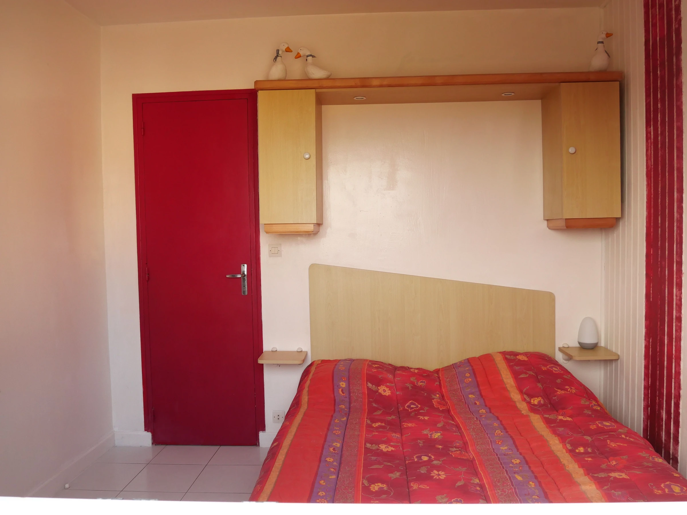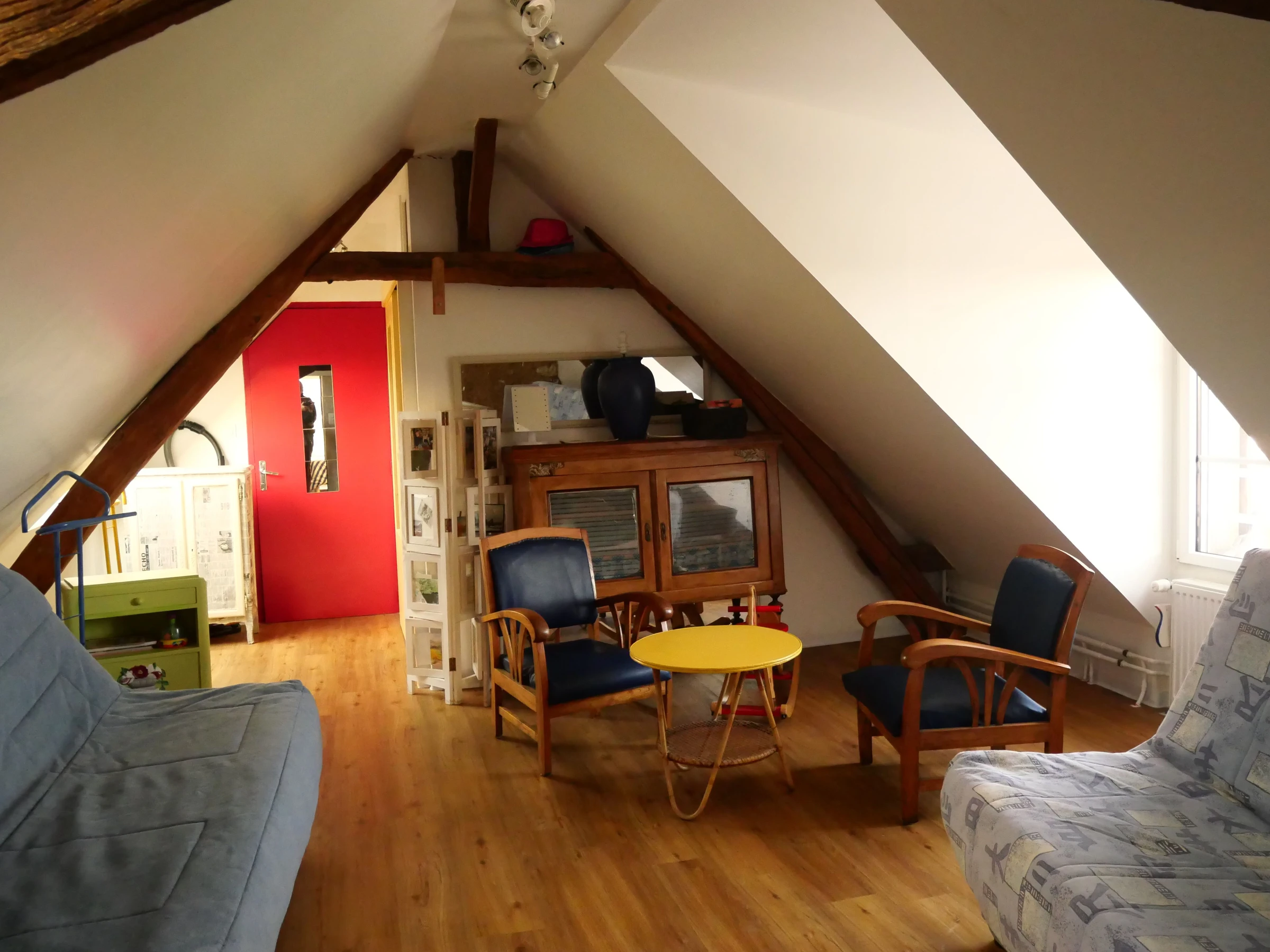 A l'étage: 1 palier avec 2 clic-clac chacun pour 2 pers, salle d'eau et WC. 1 ch avec 2 lits de70cm électrique articulé pouvant faire 1 lit 140cm