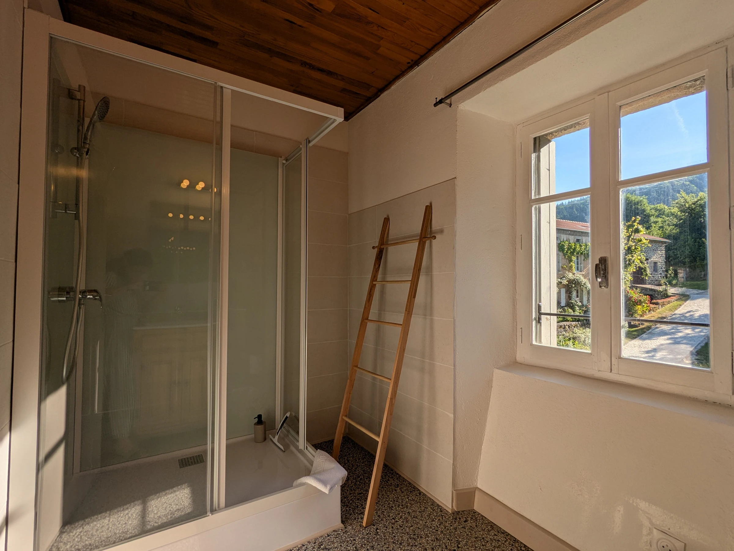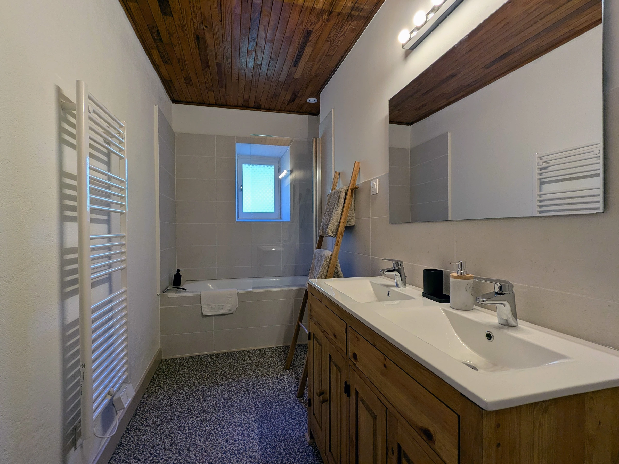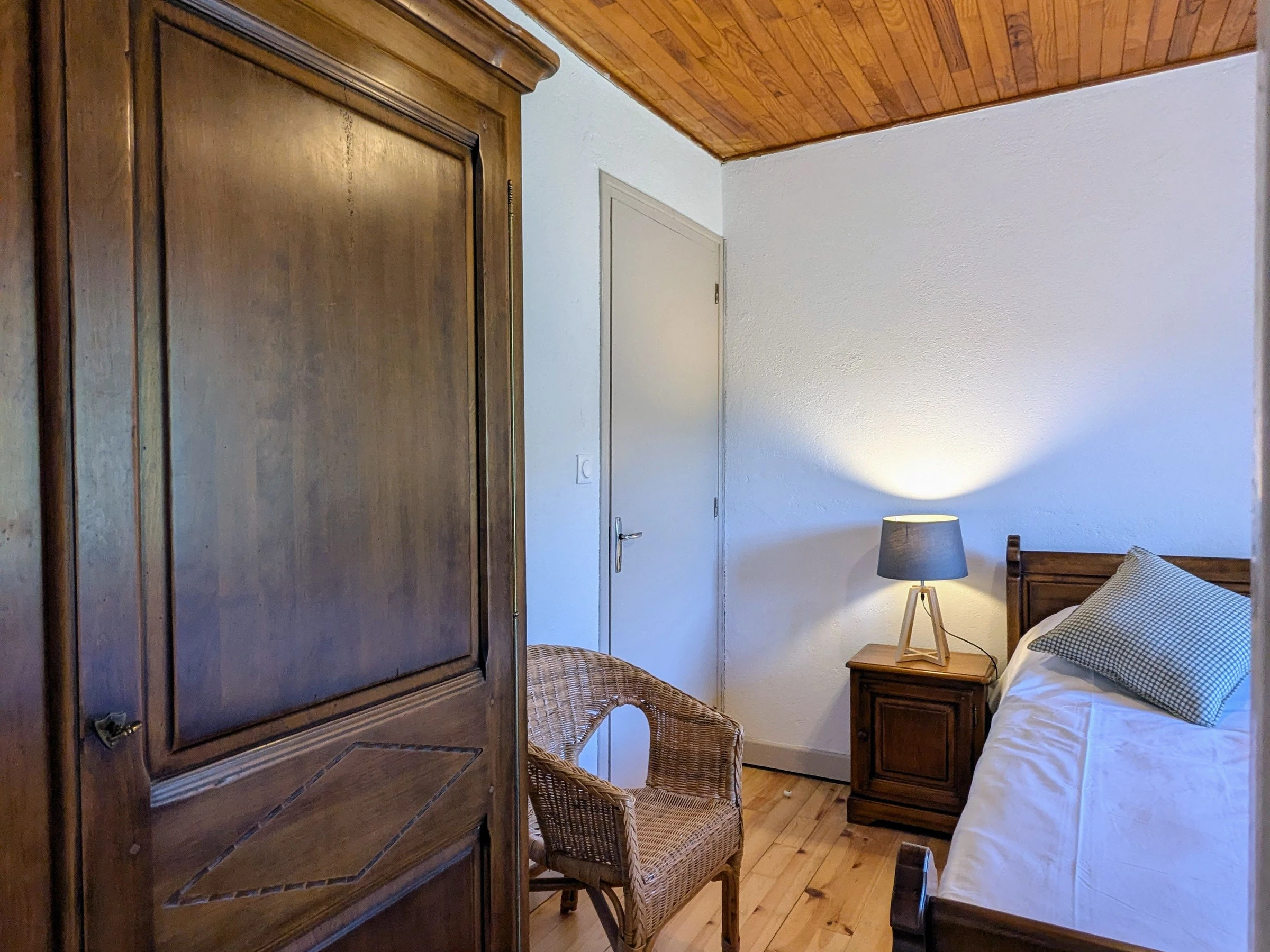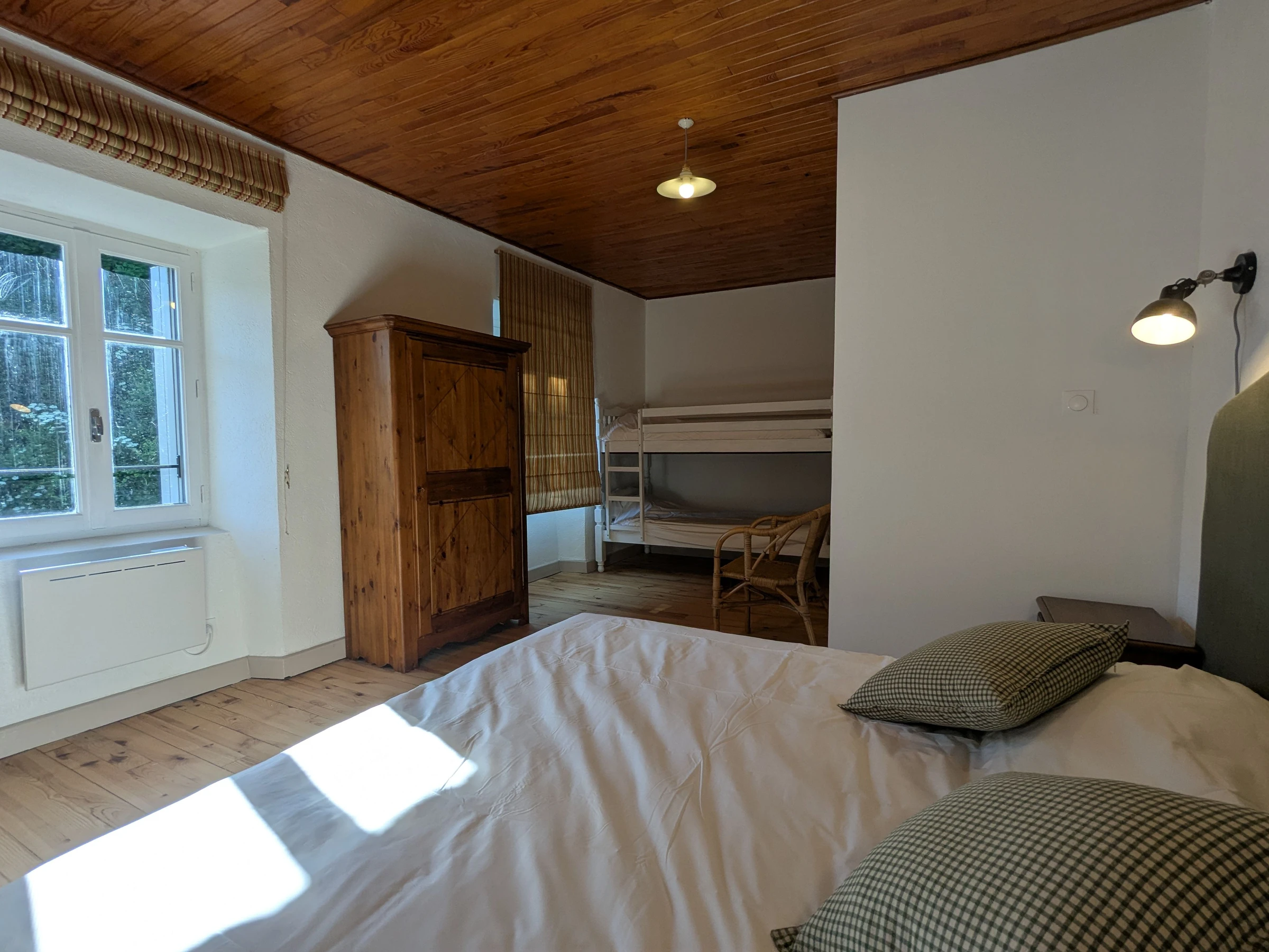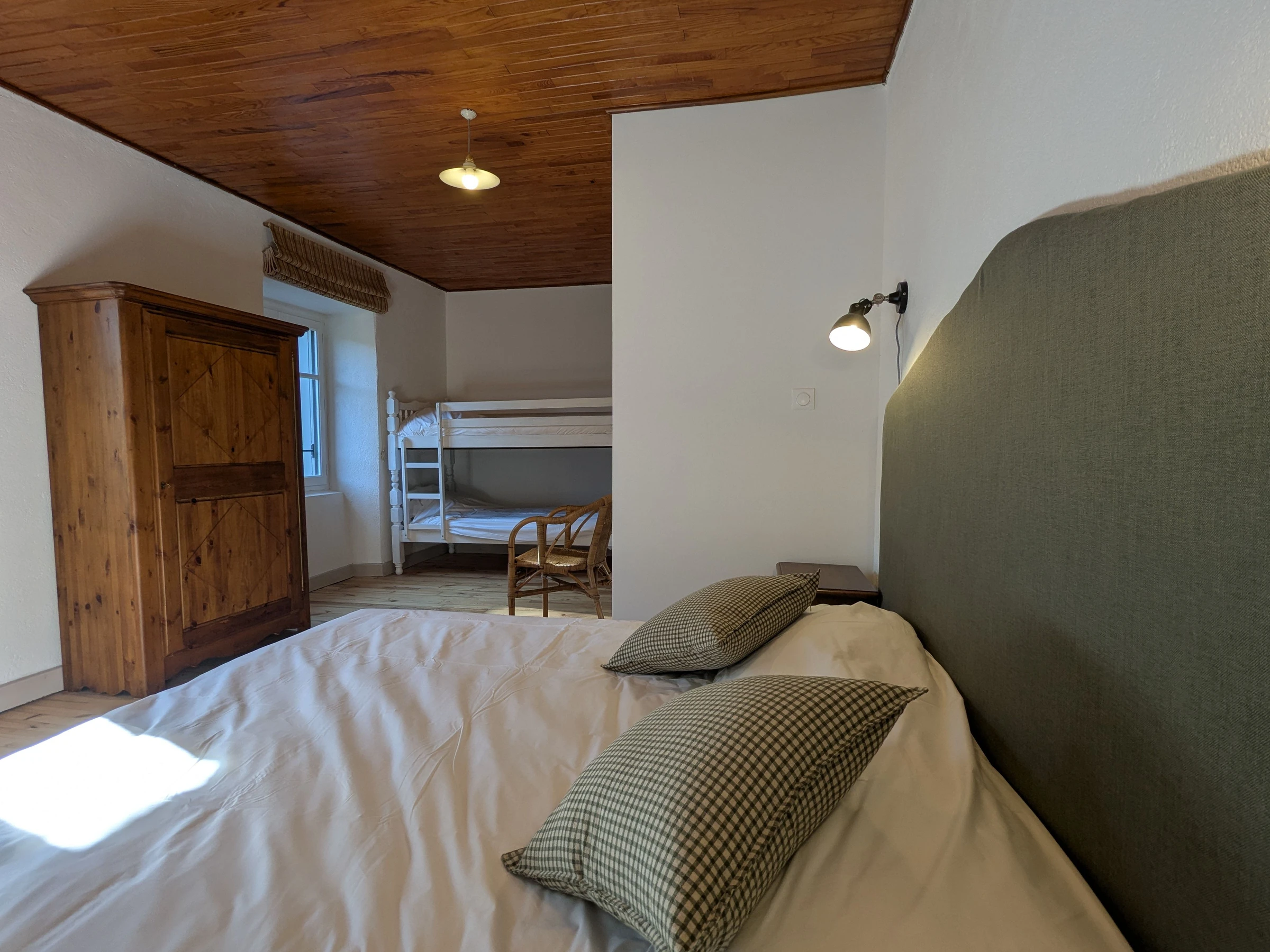• Deux autres chambres indépendantes partagent une deuxième salle d’eau indépendante avec douche: l’une avec un lit double en 140 cm, l’autre avec deux lits simples en 80 cm jumelables et deux lits superposés.