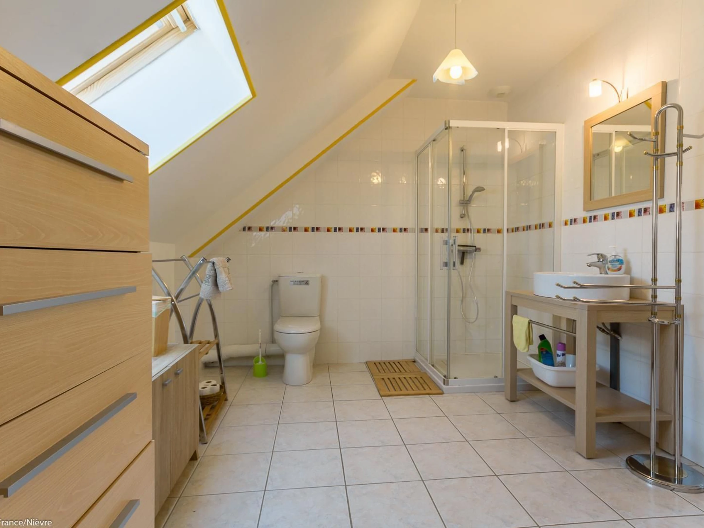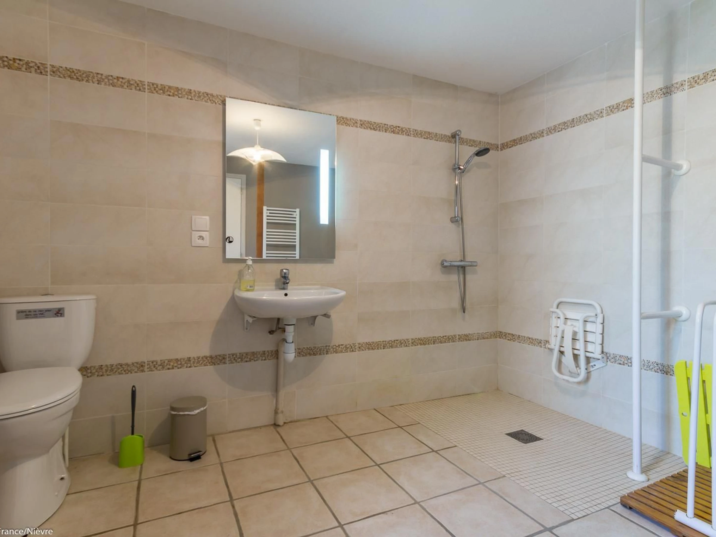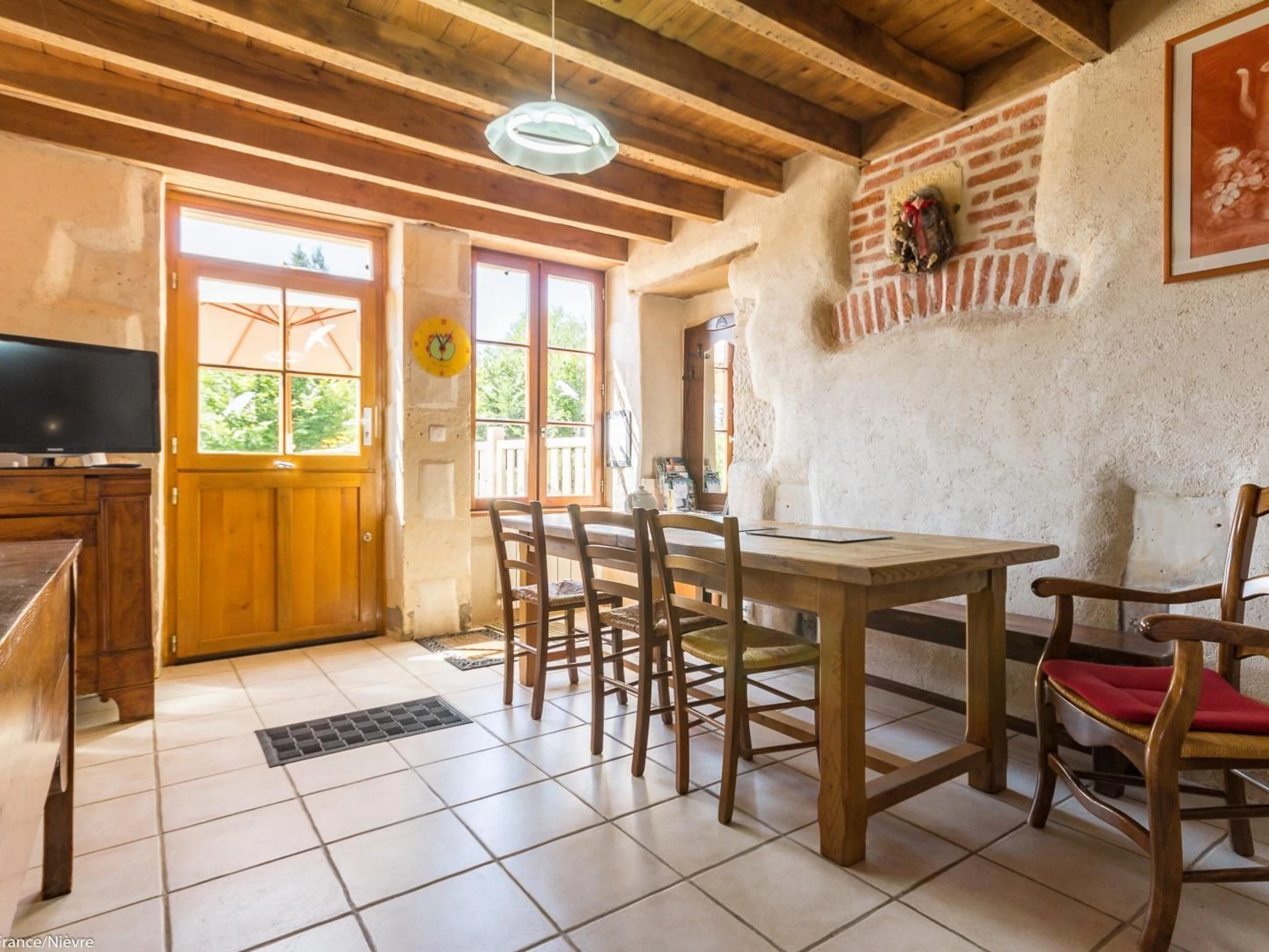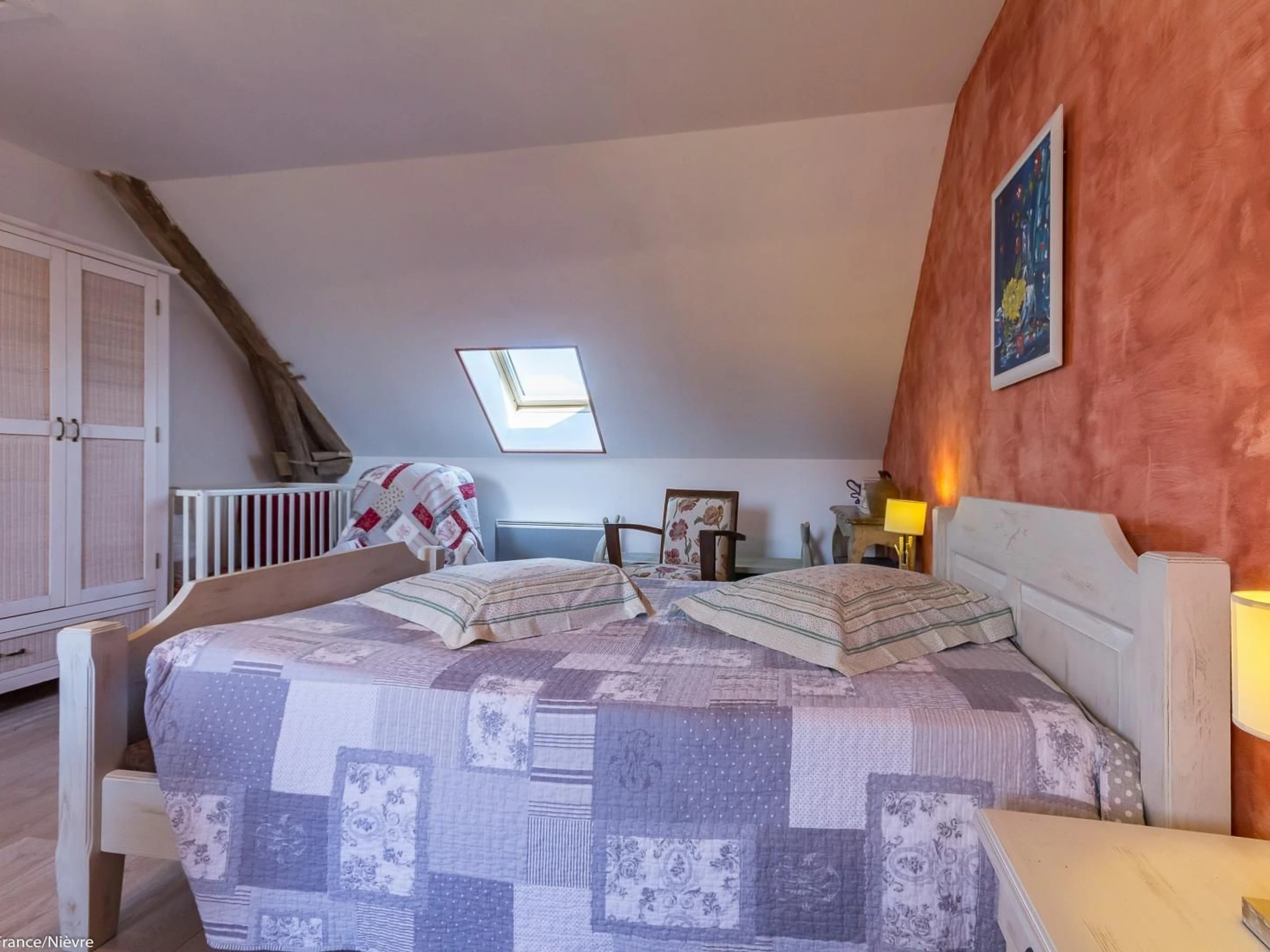 Fermette nivernaise individuelle restaurée offrant une vue dégagée sur la campagne Terrasse , jardin clos fleuri avec terrain de pétanque et un jardin non clos avec toboggan. Au rez-de-chaussée : entrée sur salle à manger avec télé et cuisine ouverte (piano 5 feux), 1 chambre " Hulotte" avec 1 lit 140x190 avec accès direct à une salle d'eau accessible aux personnes à mobilité réduite et fauteuils roulants (grande douche avec chaise, lavabo accessible et wc réhaussé) un lit médicalisé peut être installé.