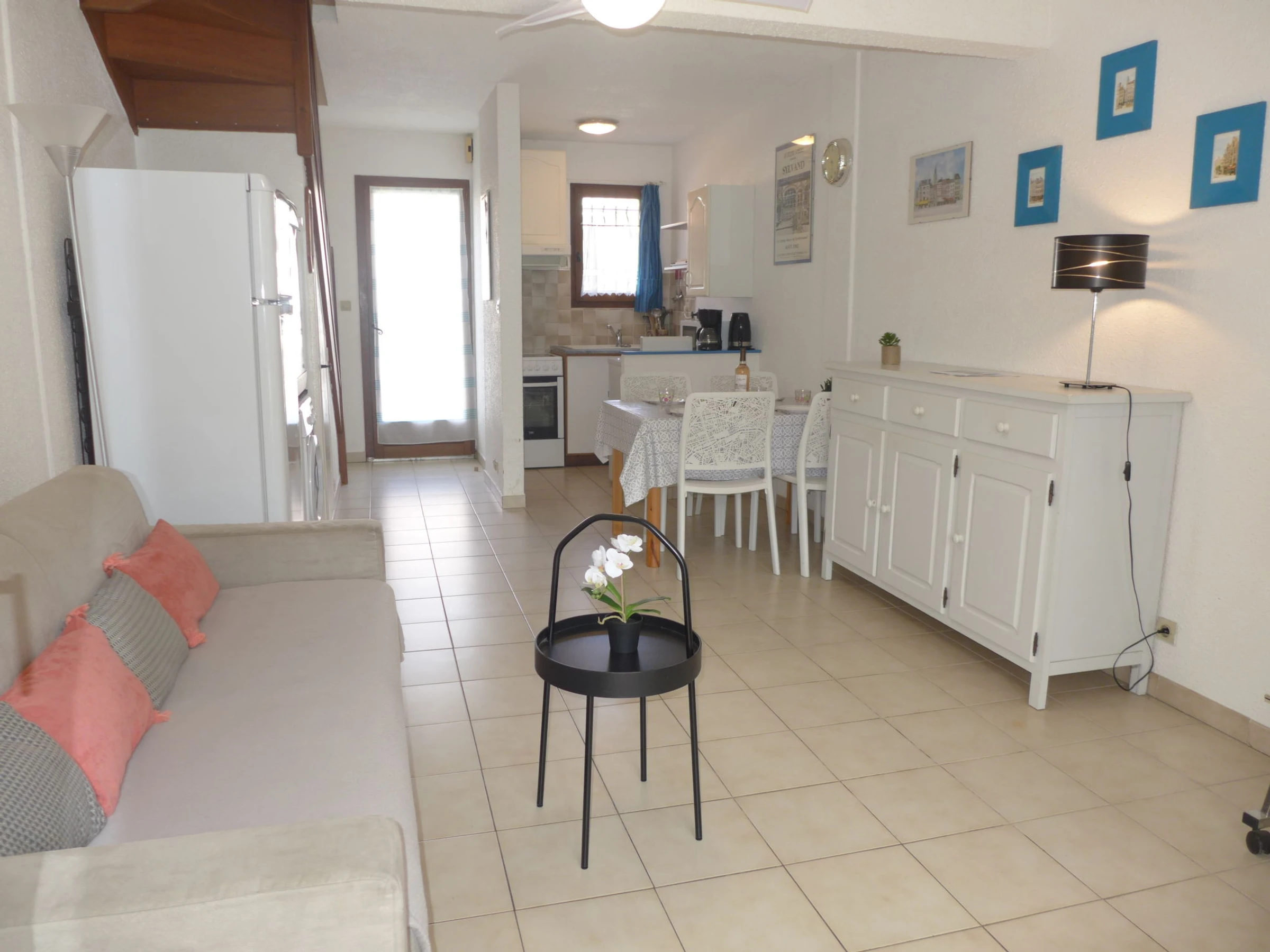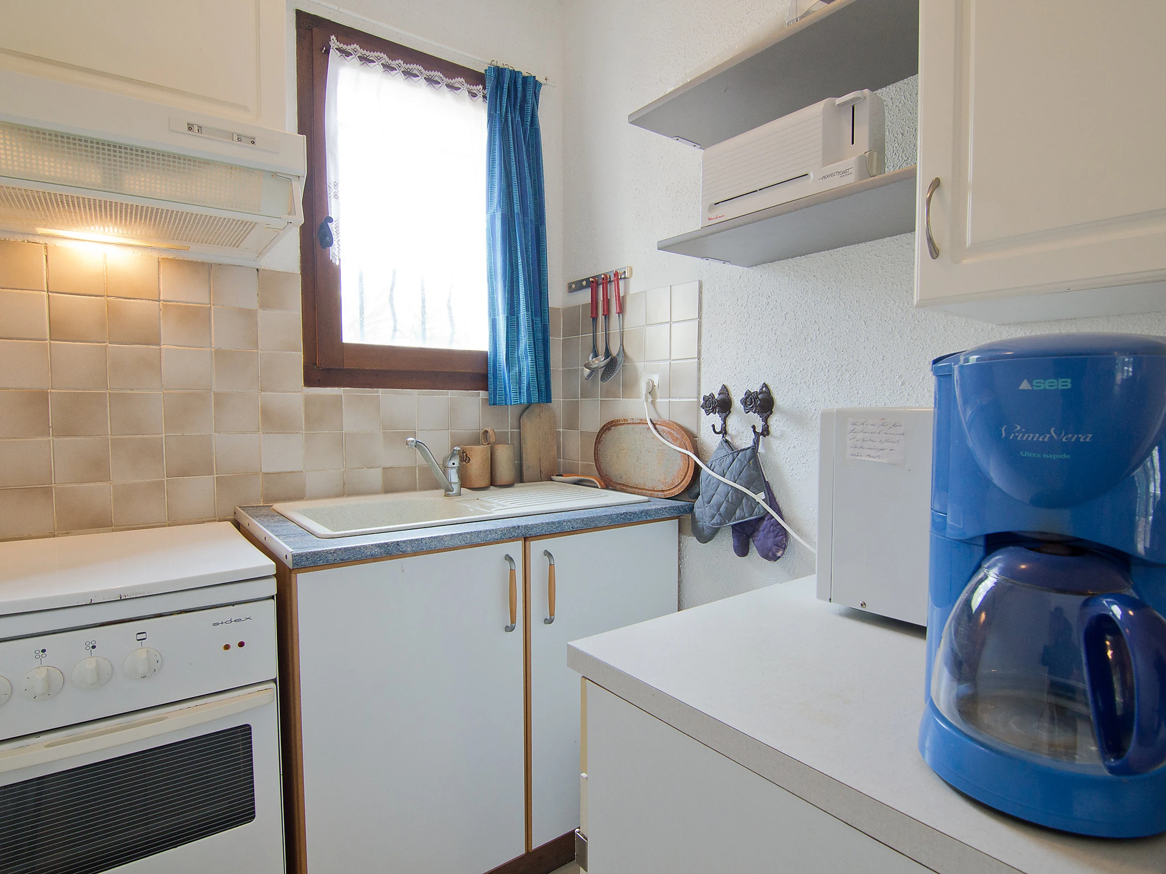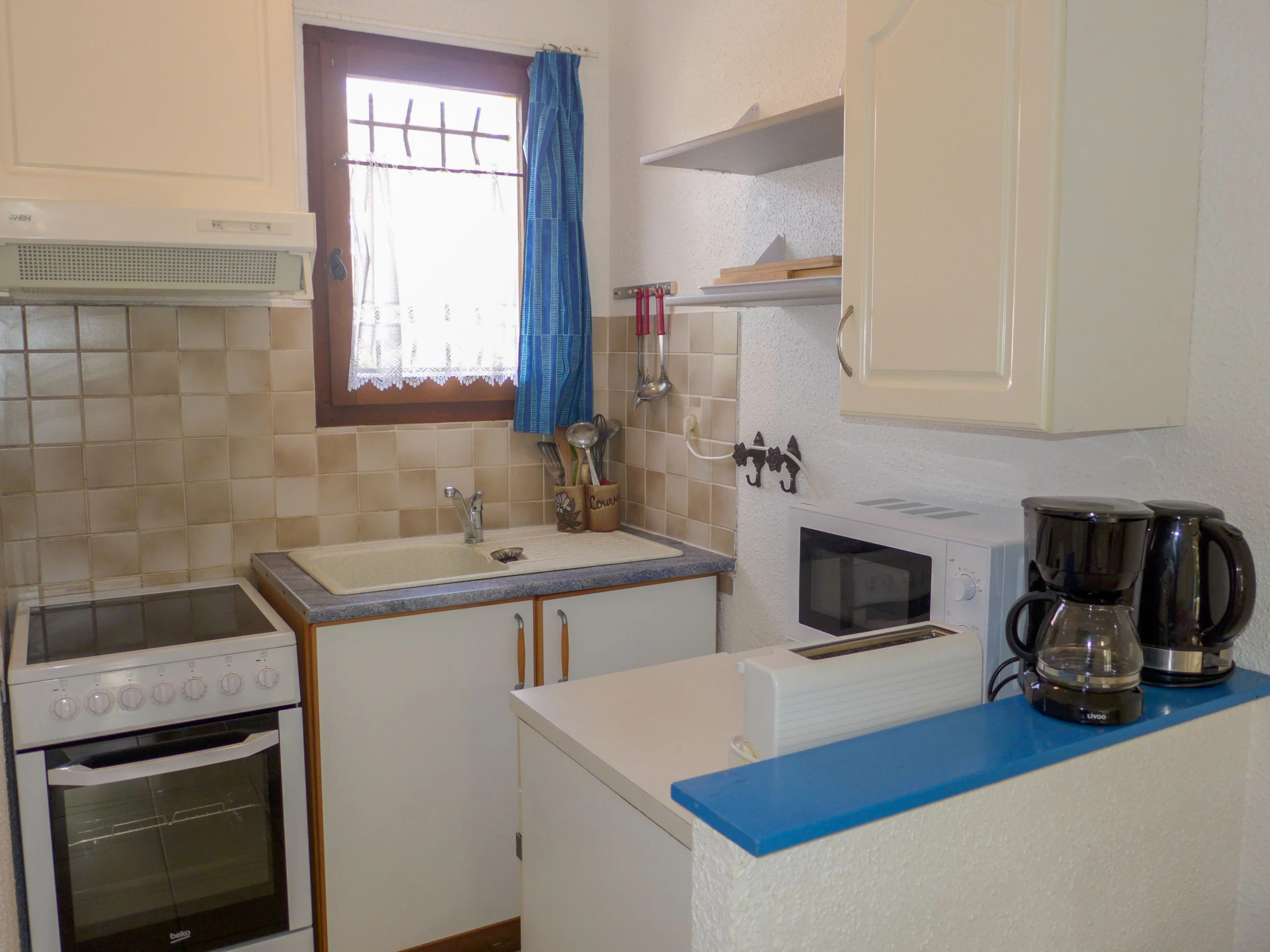 Maison jumelée 3 pièces 60 m2 sur 2 niveaux. Aménagement confortable: séjour/salle à manger avec 1 divan-lit double (1 x 140 cm, longueur 190 cm), TV et ventilateur. Sortie sur la terrasse. Coin cuisine (4 plaques de cuisson, four, lave-vaisselle, grille-pain, bouilloire électrique, four micro-ondes, congélateur, cafetière électrique). À l'étage supérieur: 2 chambres, chaque chambre avec: 1 grand-lit (1 x 140 cm, longueur 190 cm), ventilateur. Douche, WC séparé. Chauffage électrique. Balcon 6 m2, situation sud, terrasse 50 m2, situation sud. Meubles de terrasse. A disposition: lave-linge, fer à repasser, sèche-cheveux. Internet (Connexion WIFI, en sus). Place de parking (2 Voitures). Veuillez noter: 1 animal/ chien de petite taille autorisé. TV seulement FR. Détecteur de fumée.