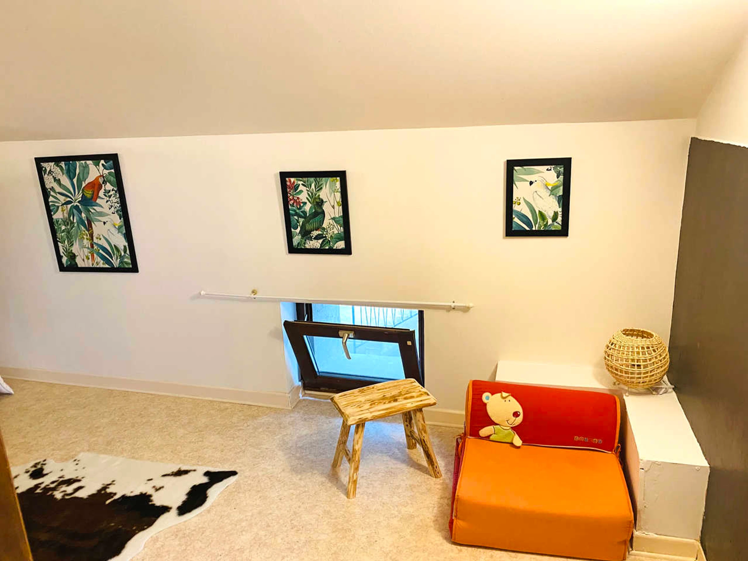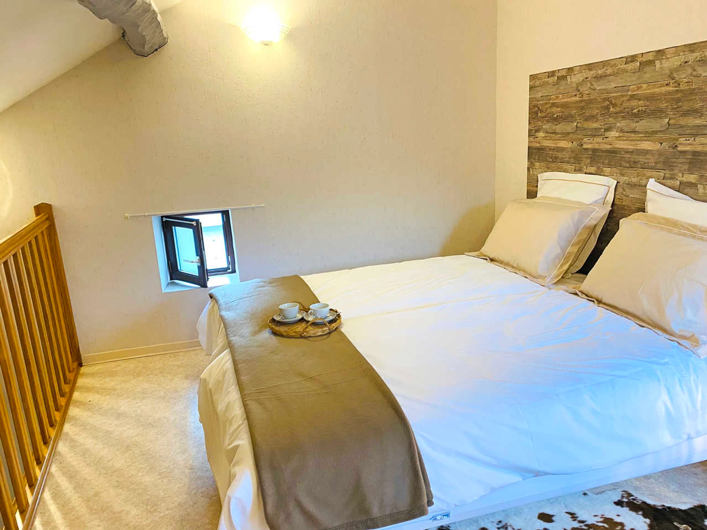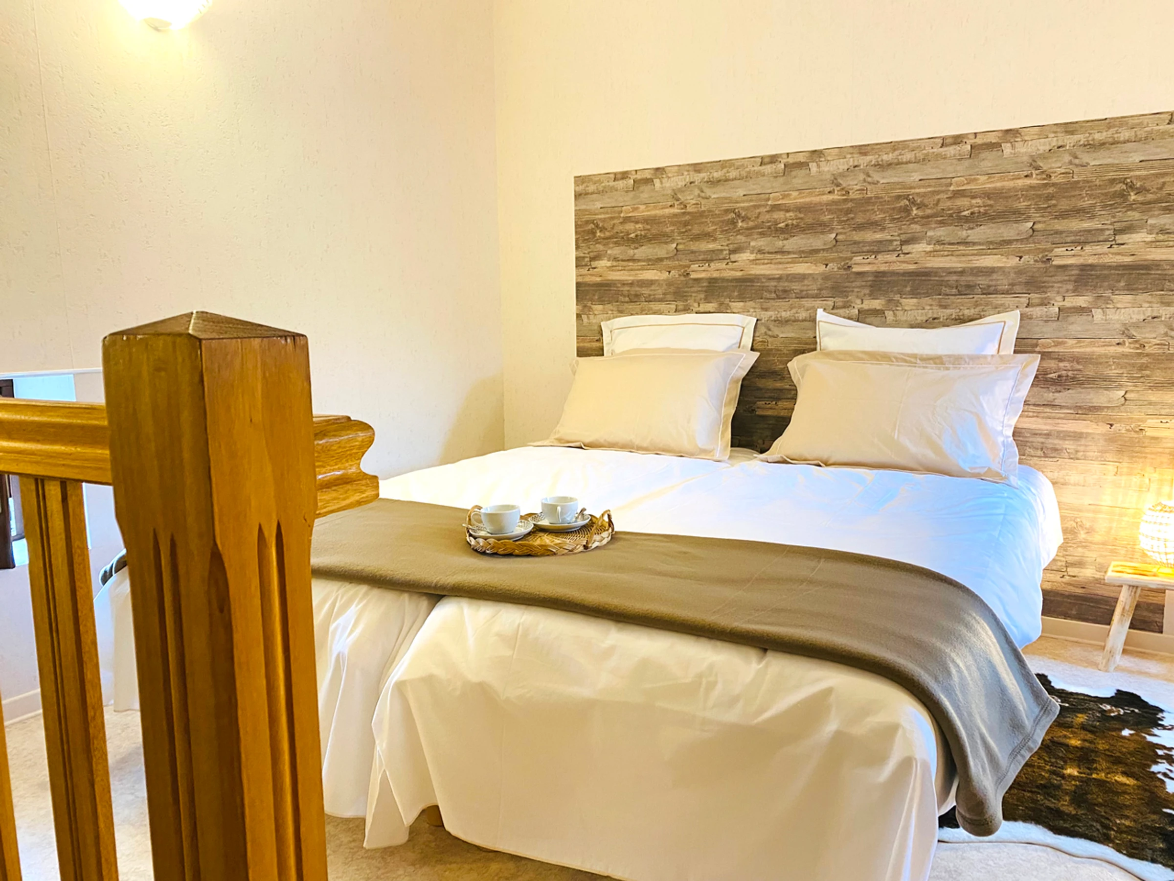 A l'étage, on arrive dans la grande chambre en mezzanine ( 1 lit de 180 x 200 cm ou 2 de 90 cm ). A partir de cette chambre principale, on accède à une petite chambre de 6 m2 (chambre en enfilade - lits superposés 90x200, plus adaptés aux enfants).