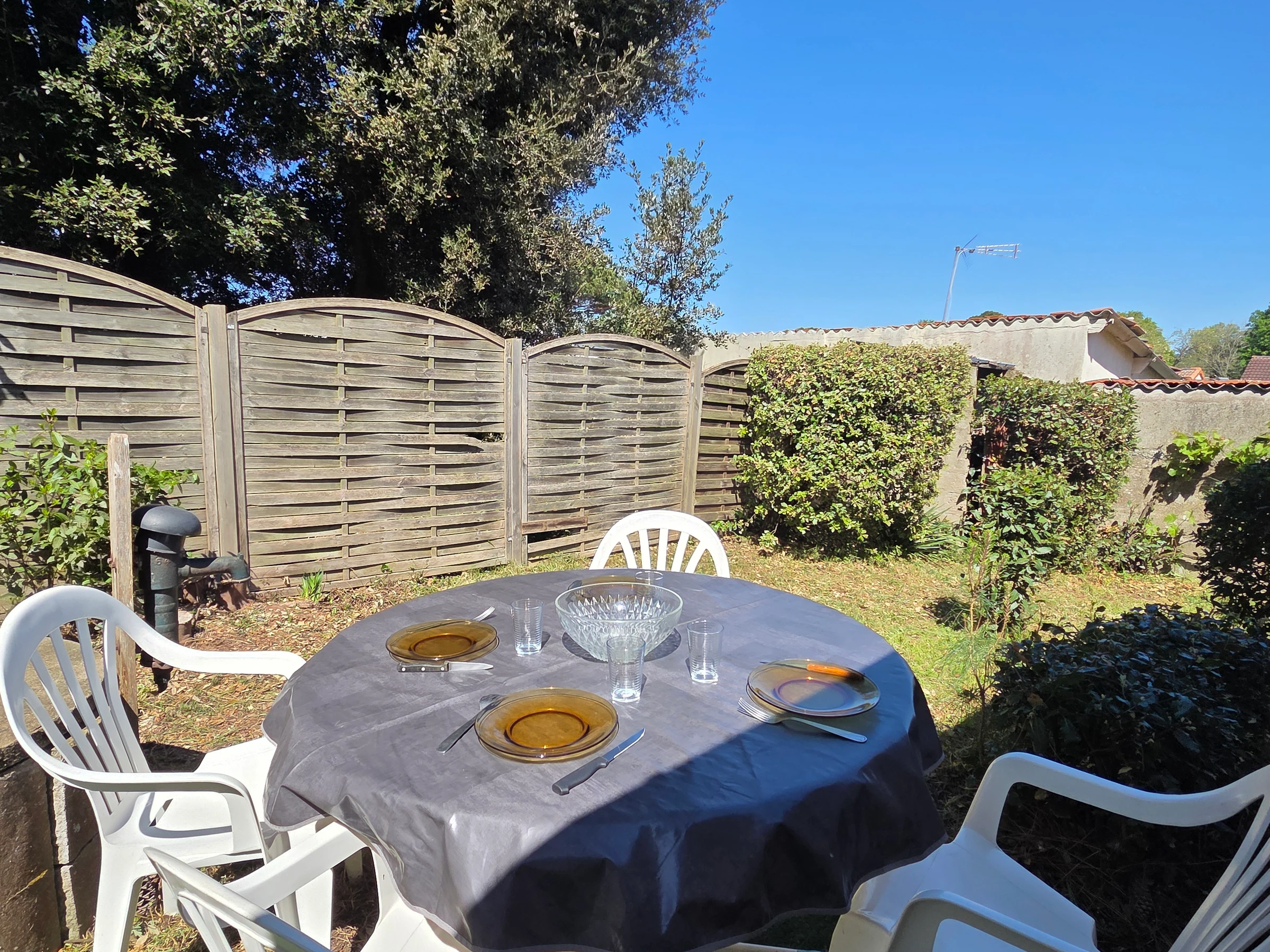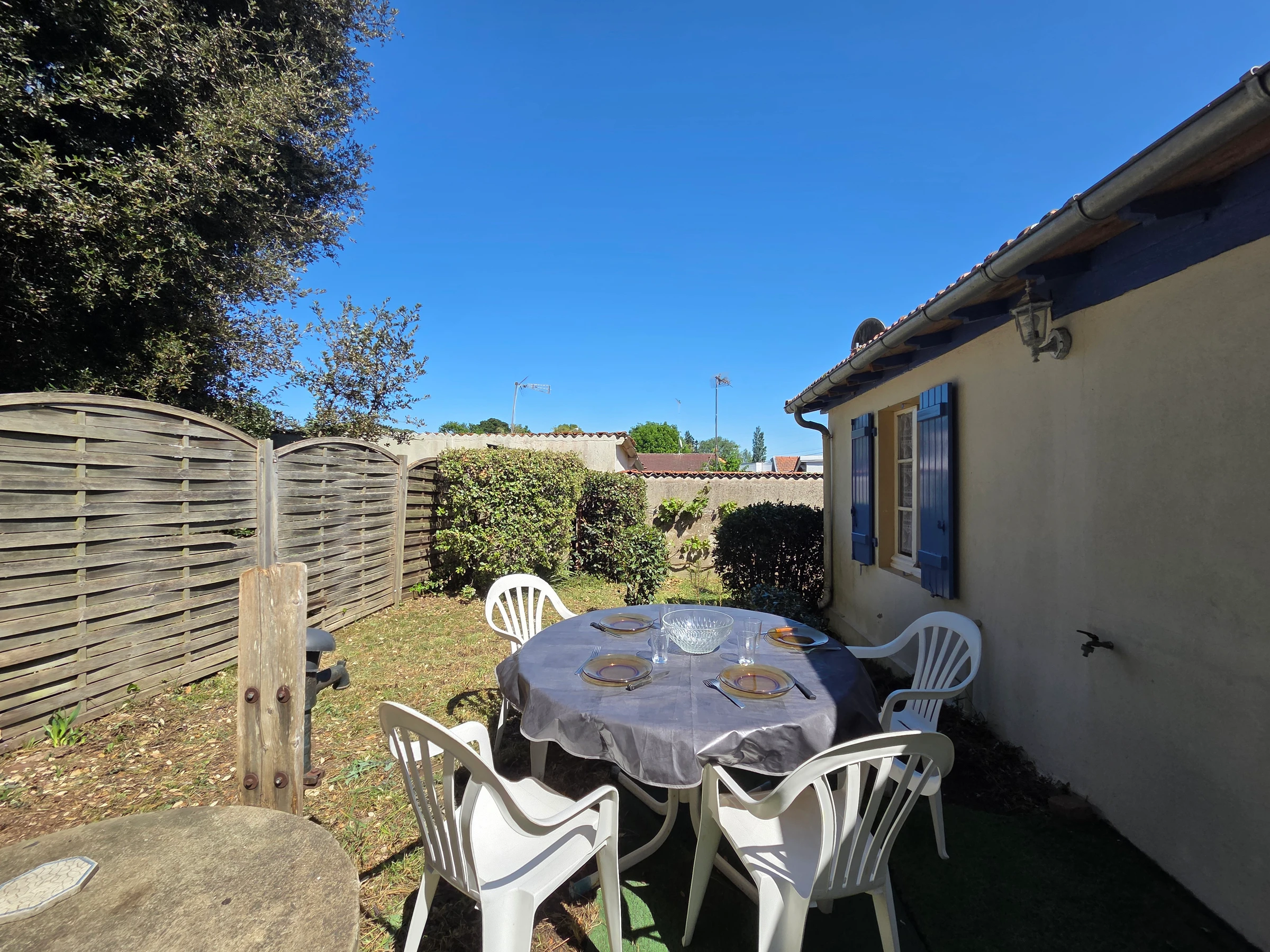 À l'extérieur, le terrain de 300 m², recouvert de sable, est agrémenté d'un chalet en bois pour le rangement, d'un salon de jardin et d'un barbecue, idéal pour profiter du soleil. Une entrée pour voiture est également disponible. Deux vélos sont mis à disposition pour vos déplacements.