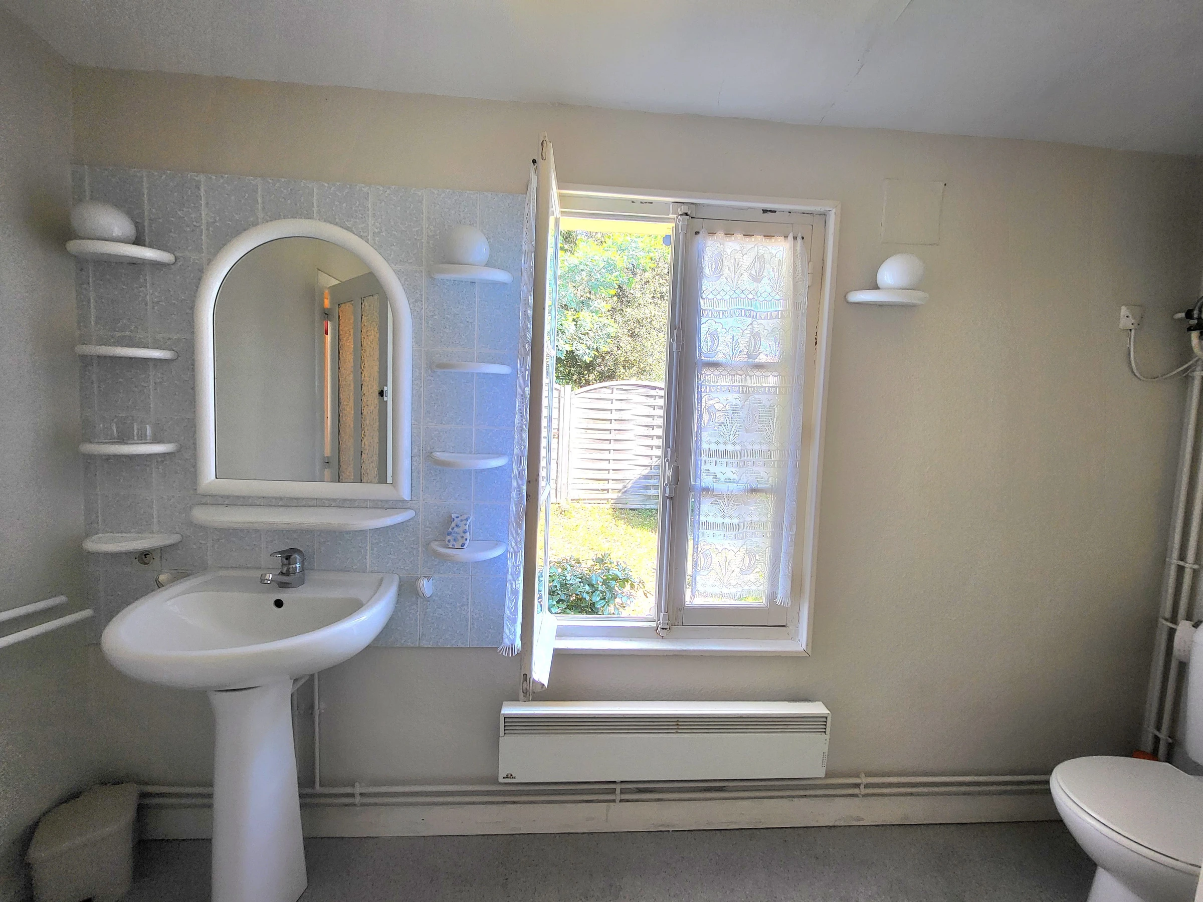 À l'intérieur, vous trouverez une kitchenette équipée d'une gazinière 4 feux, un séjour avec un canapé convertible, une chambre avec un lit de 140 cm et une salle d'eau avec douche et lave-linge. Les aménagements sont simples mais fonctionnels.