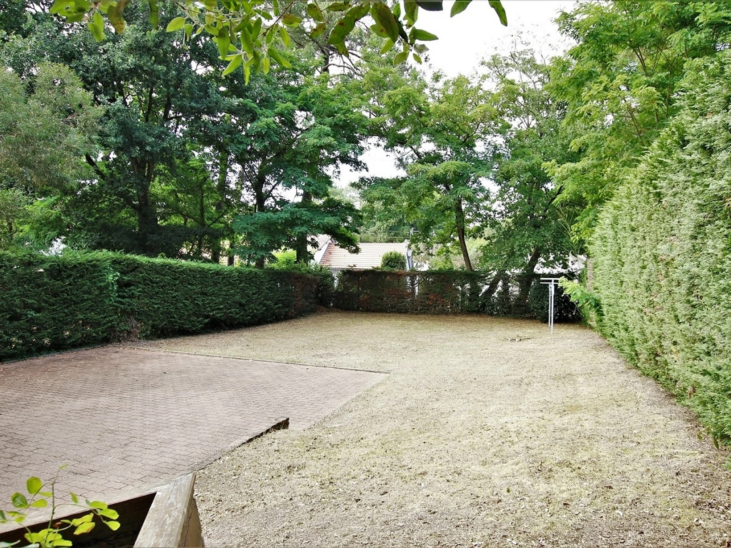 Le terrain clos de 830 m² comprend un espace pavé autour de la maison, un jardin arboré, un terrain de pétanque, ainsi qu’un garage.