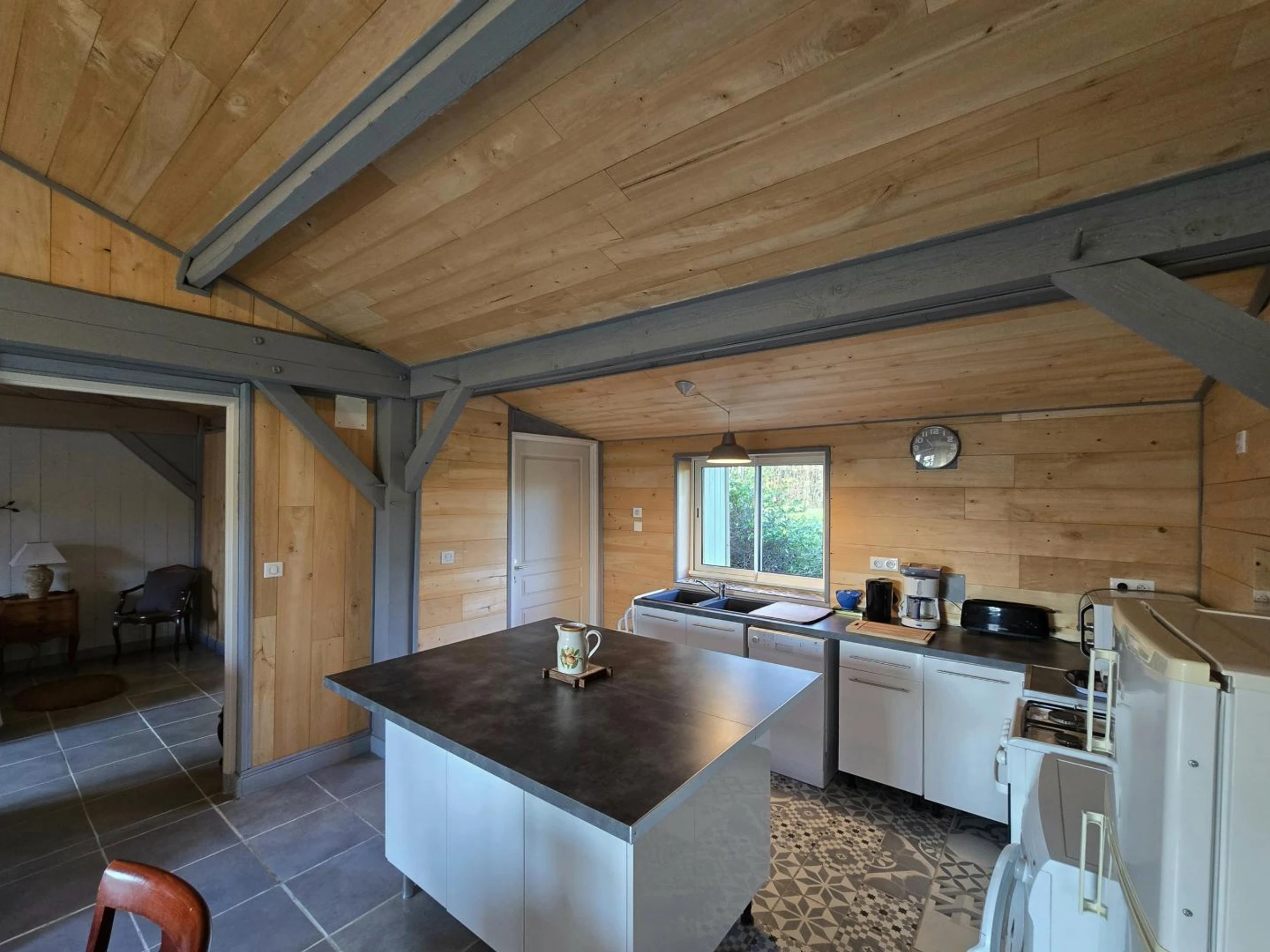 Cuisine équipée avec îlot central (four, gazinière, lave-vaisselle, machine à laver), salon-salle à manger lumineux (TV, Wi-Fi)