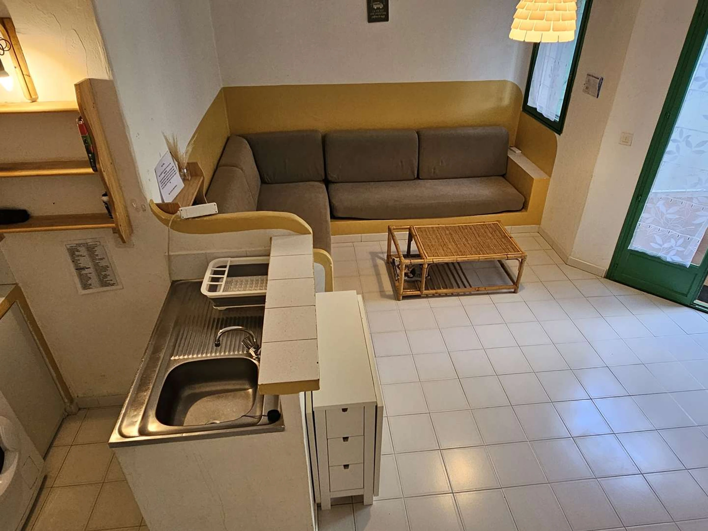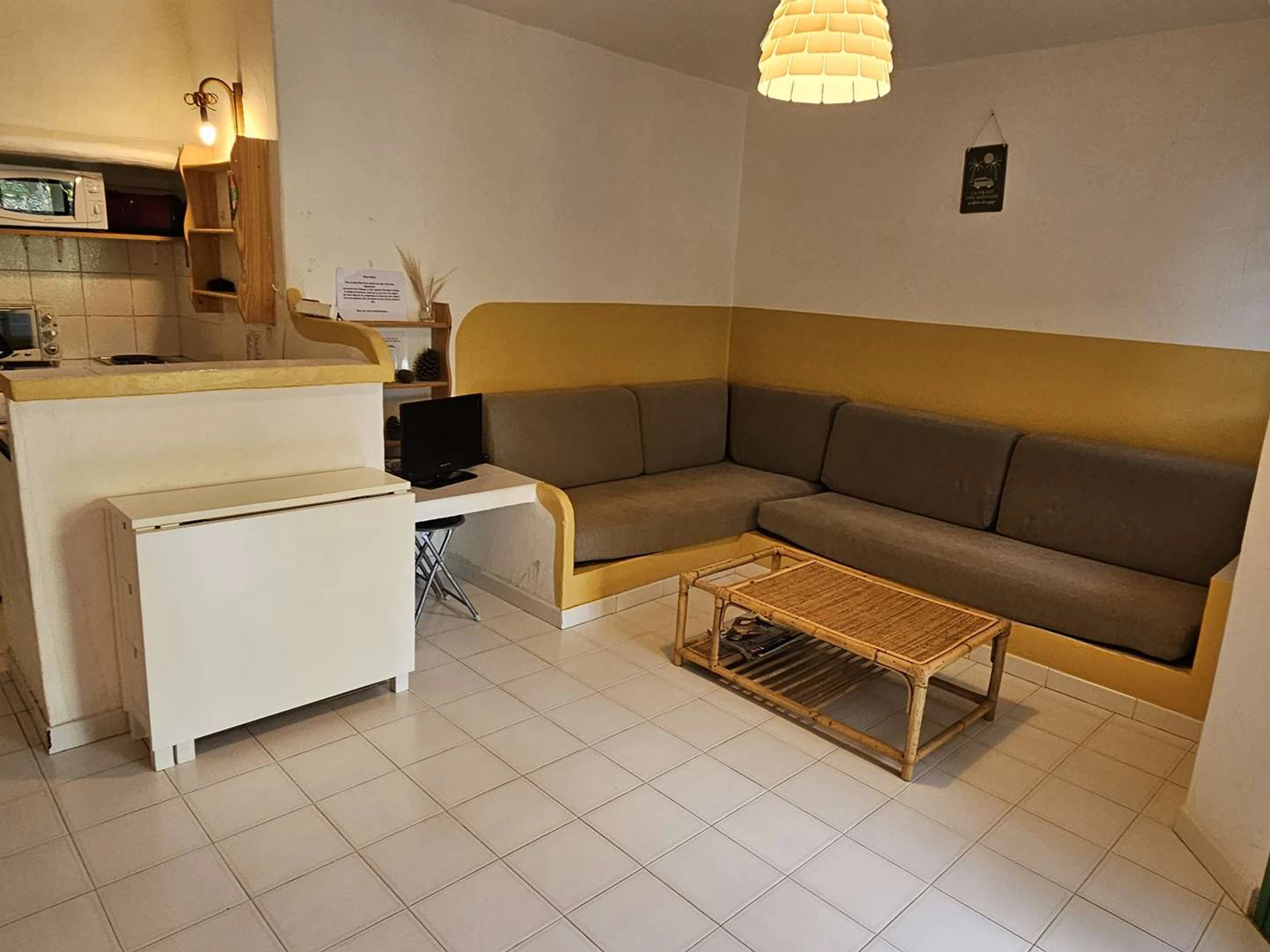 Séjour/kitchenette : clim : banquette d'angle, télévision, réfrigérateur combiné congélateur, plaques électrique, mini-four, four micro-onde, lave-linge, lave-vaisselle cafetière filtre, bouilloire, grille-pain...