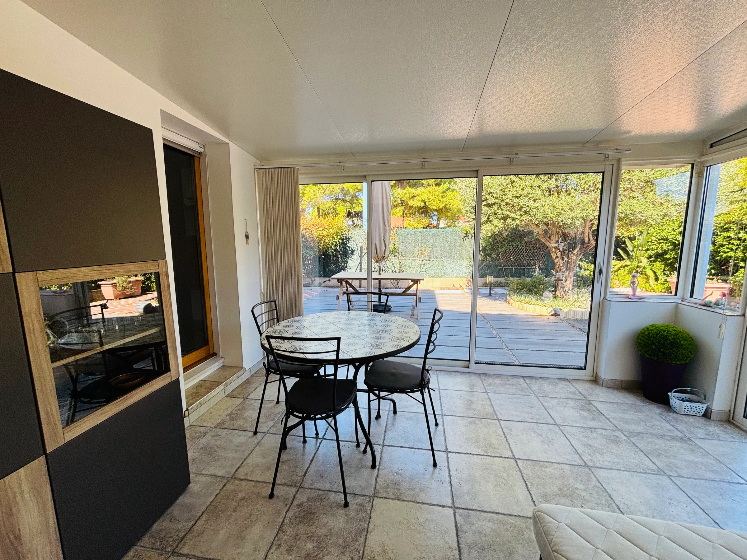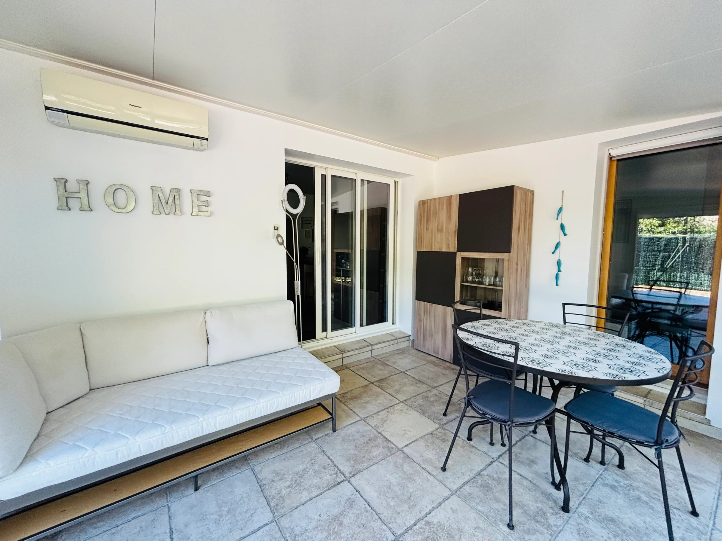 Idéal pour 4 personnes, l’appartement se compose d’une pièce à vivre climatisée avec un coin cuisine entièrement équipé. Une véranda, elle aussi climatisée, prolonge l’espace de vie et s’ouvre sur un vaste jardin privatif de 100 m², véritable atout pour profiter des beaux jours en toute intimité. La chambre dispose de nombreux rangements ainsi que d’un coffre-fort pour sécuriser vos effets personnels. La salle d’eau, moderne et fonctionnelle, comprend un WC.