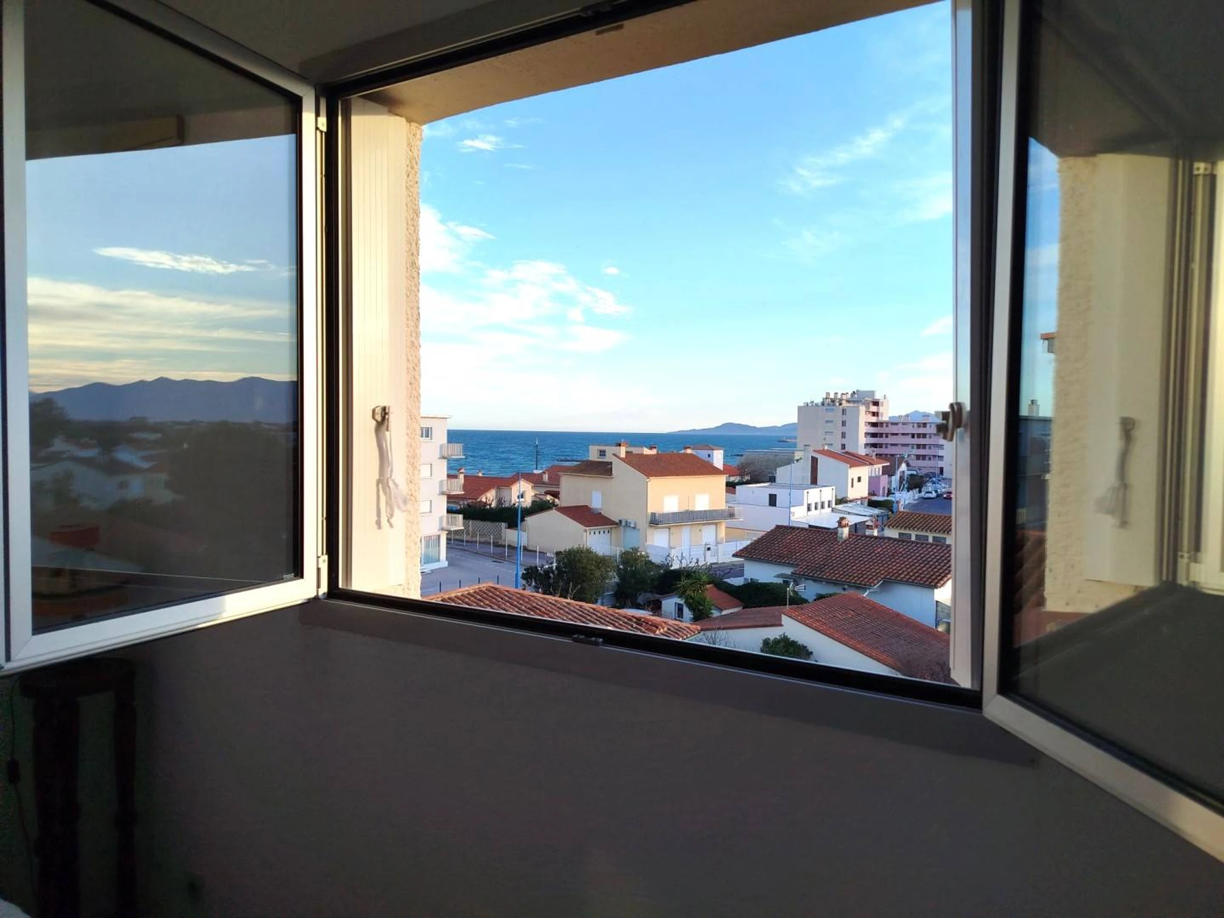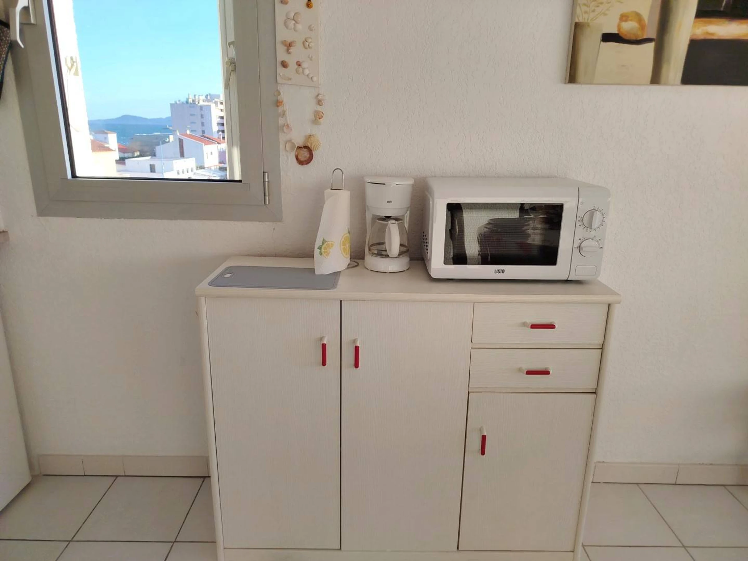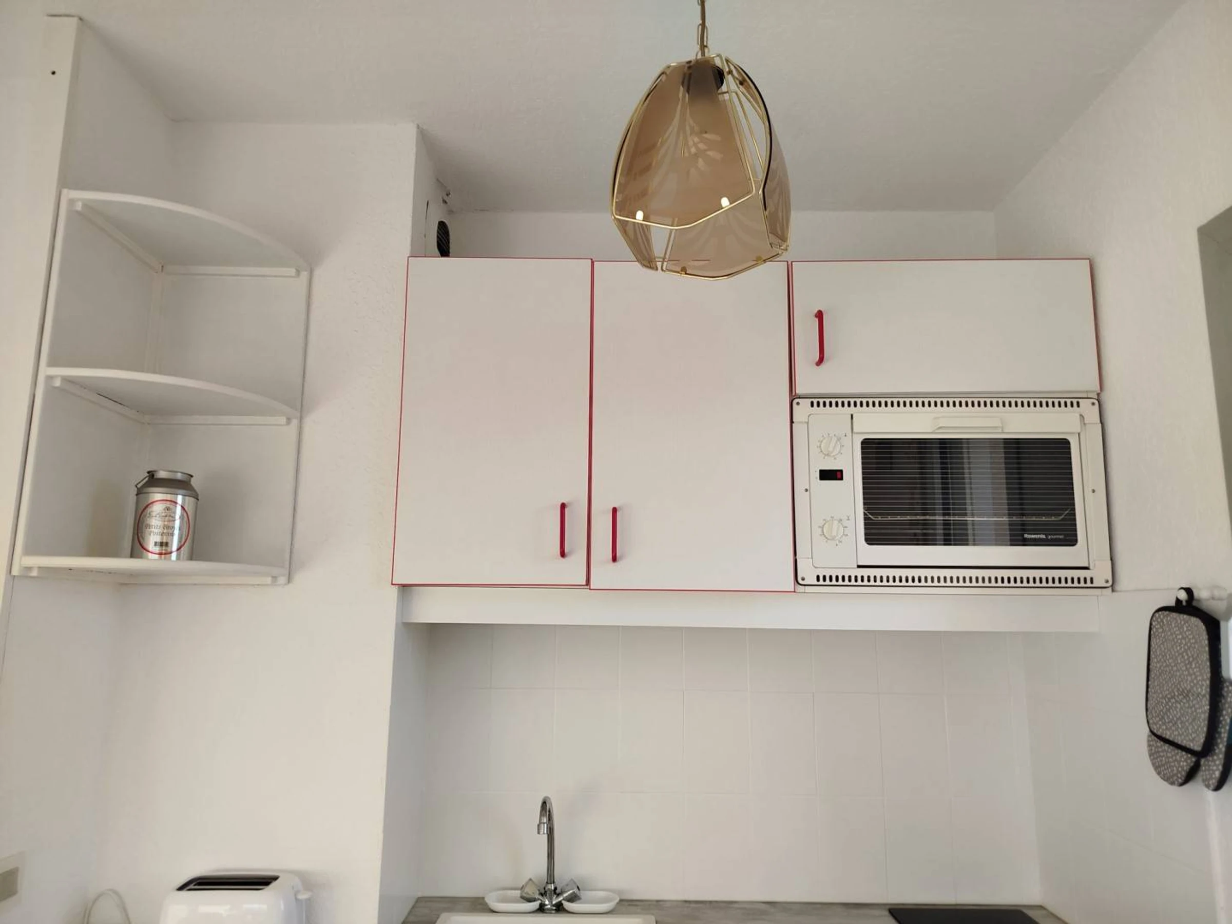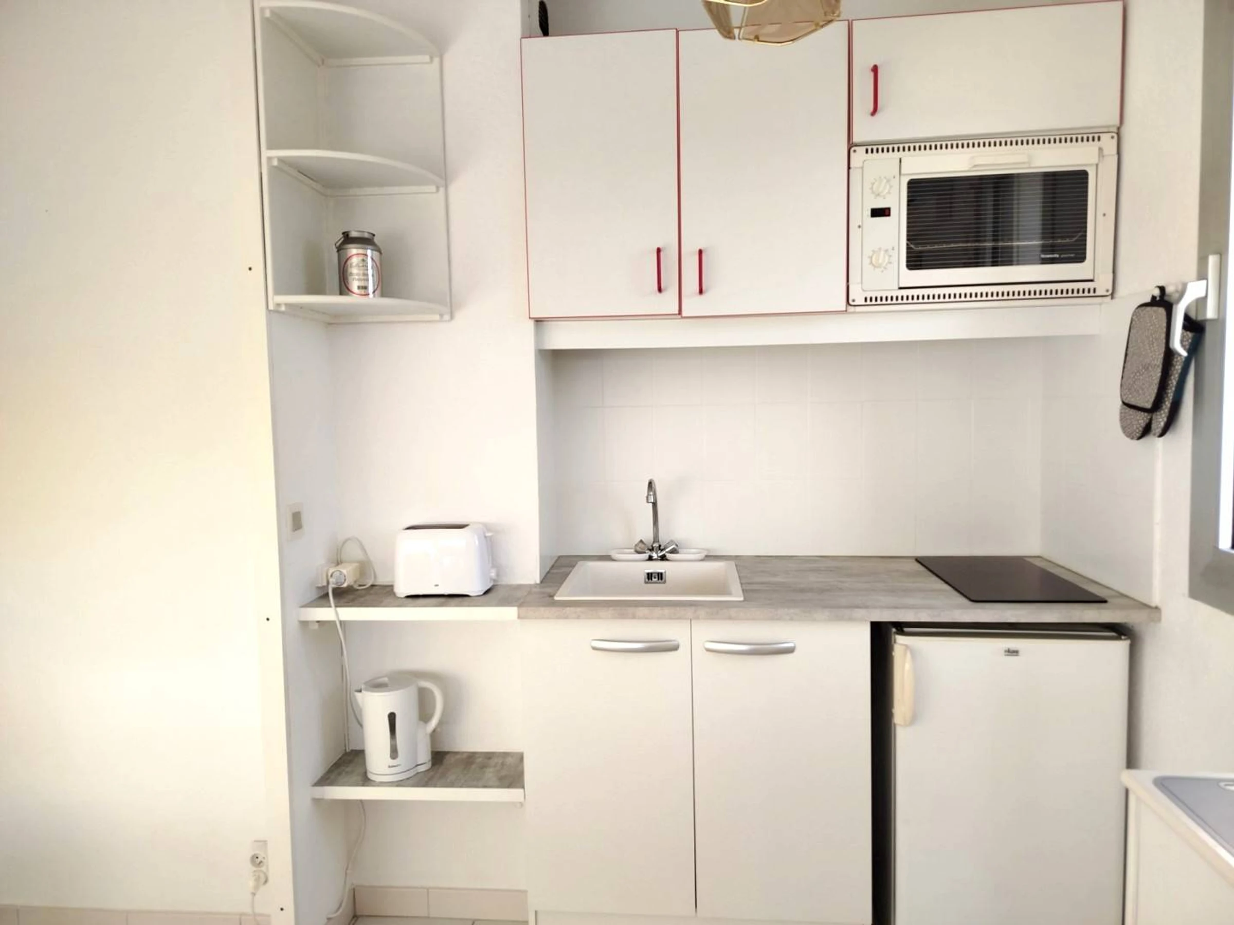 Entrée - Pièce de vie climatisée (coin repas, TV et canapé convertible) avec cuisine ouverte (plaque induction, four, micro onde, réfrigérateur TOP, cafetière filtres, grill pain, bouilloire..)- Cerise sur le gâteau vous pourrez contempler la mer tout en cuisinant !
