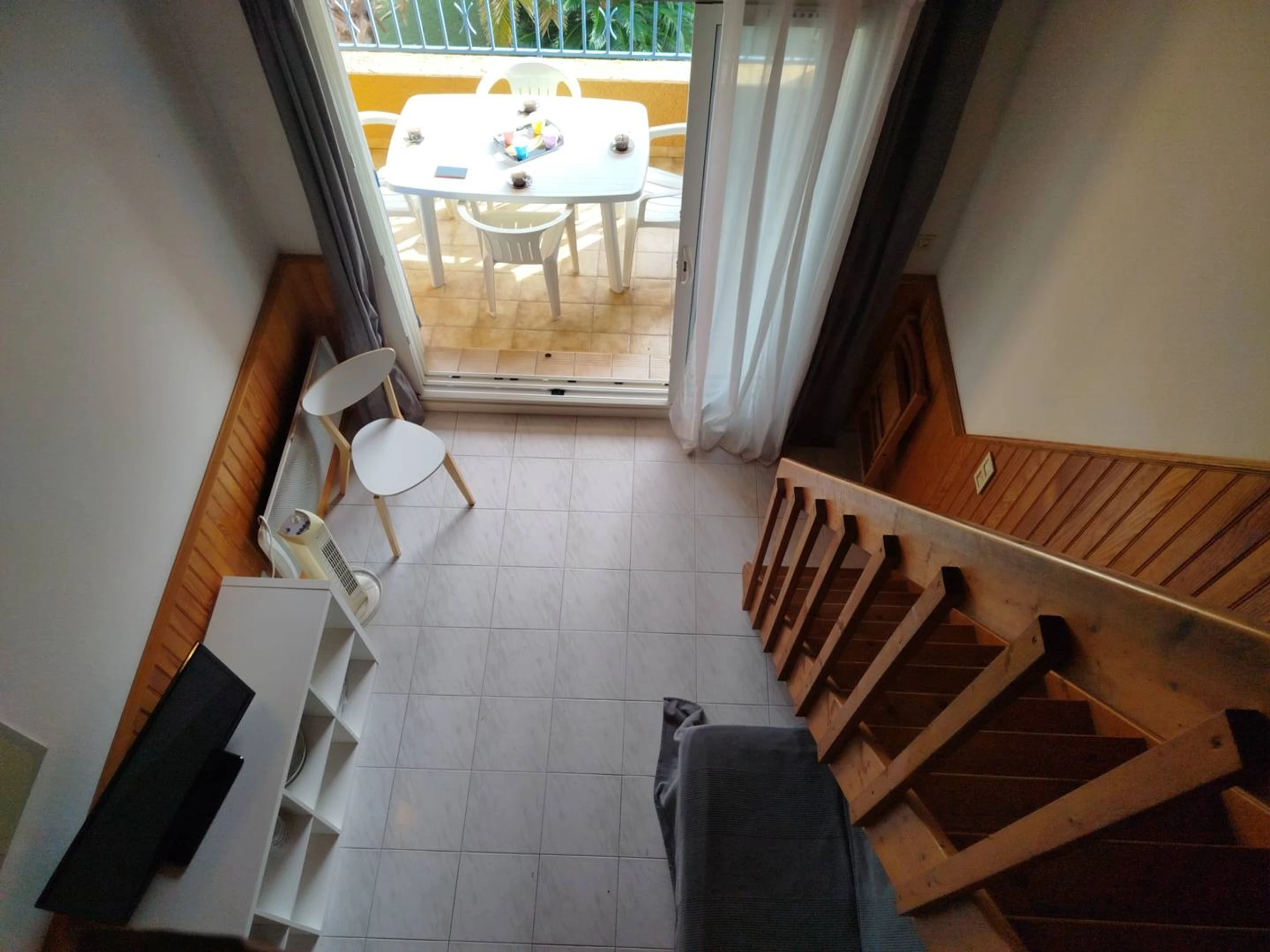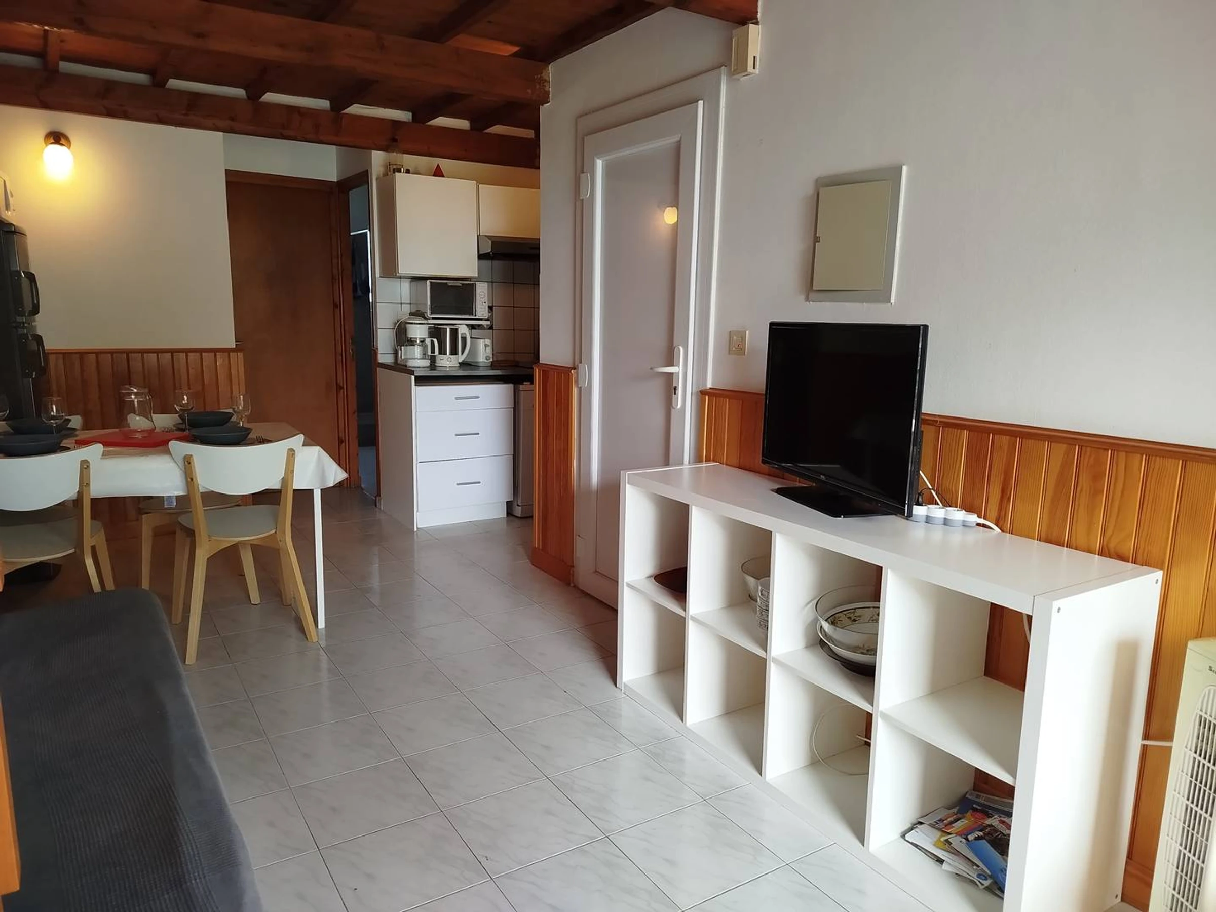 Entrée directe dans la pièce de vie équipée d'un coin salon avec canapé convertible en 140 et TV.