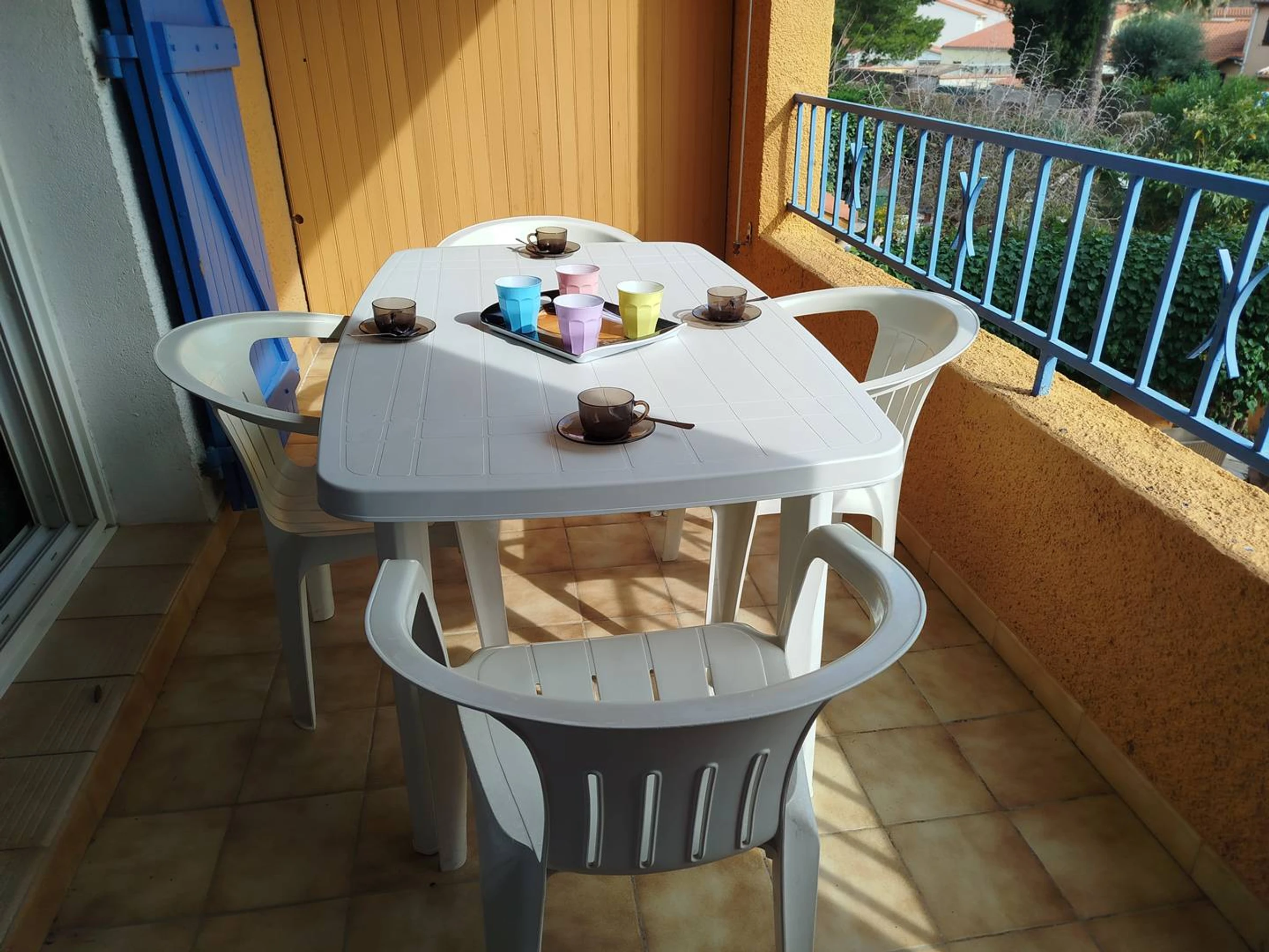 Belle terrasse couverte avec store banne et mobilier extérieur - Vue sur le jardin collectif de la propriété entièrement clôturée et fermée par un portail. Accessible aux différents locataires lors de votre séjour - idéal coin lecture & détente.