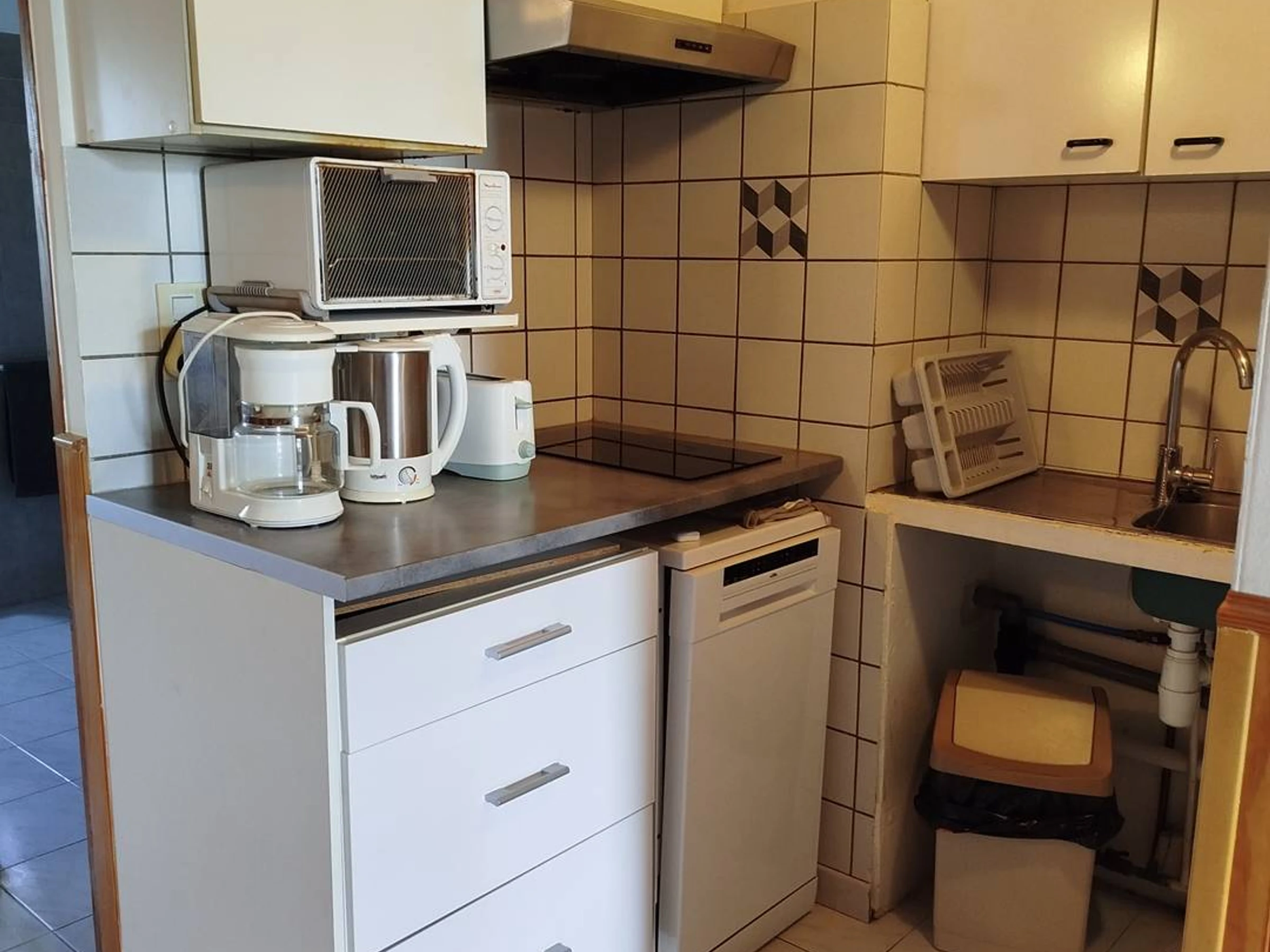 Coin repas et kitchenette (Réfrigérateur/congélateur, plaque de cuisson 2 feux induction,hotte, lave vaisselle, four, micro onde, cafetière filtres, bouilloire, grill pain..)