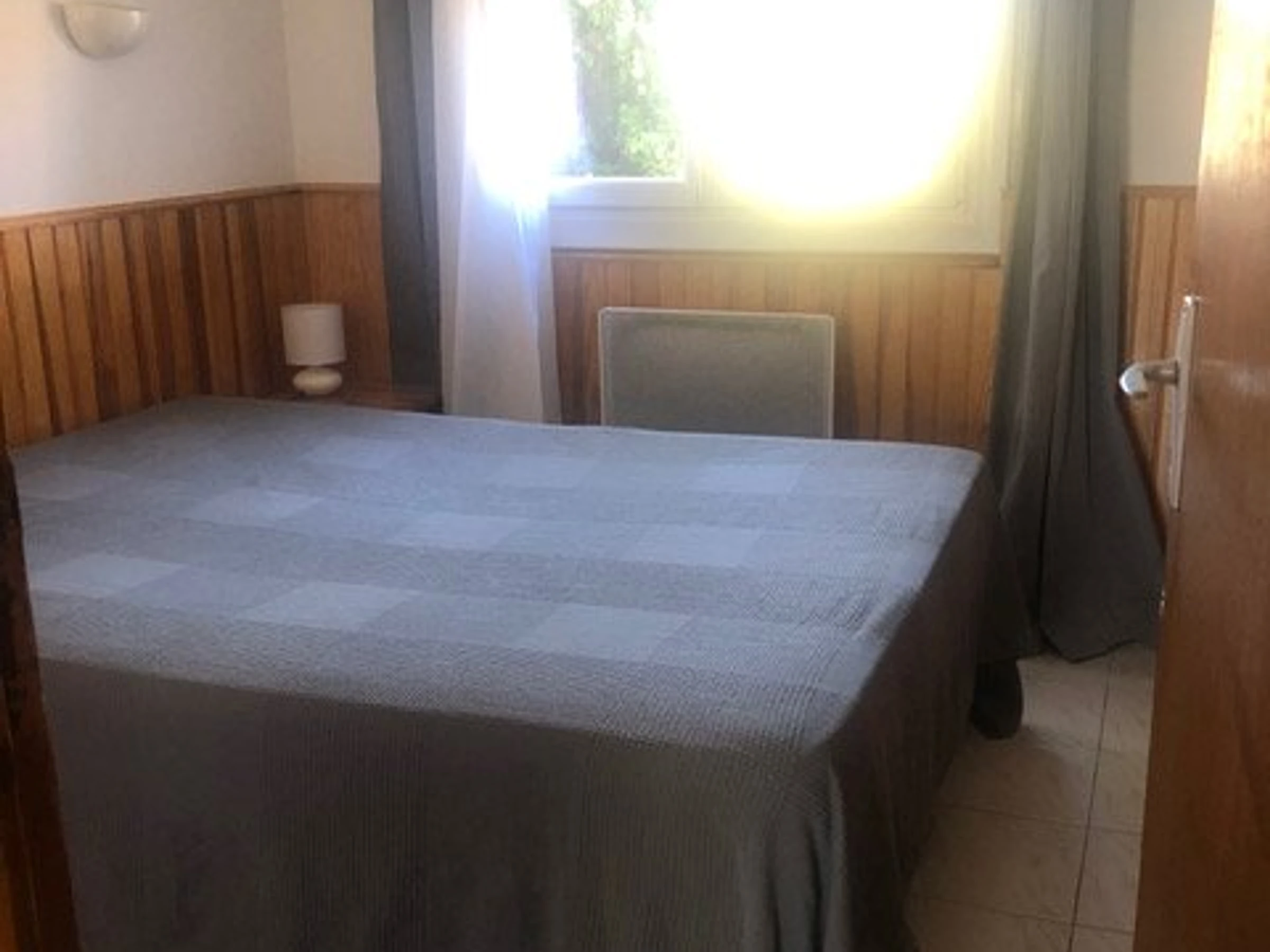 Chambre avec lit en 140 et rangements.