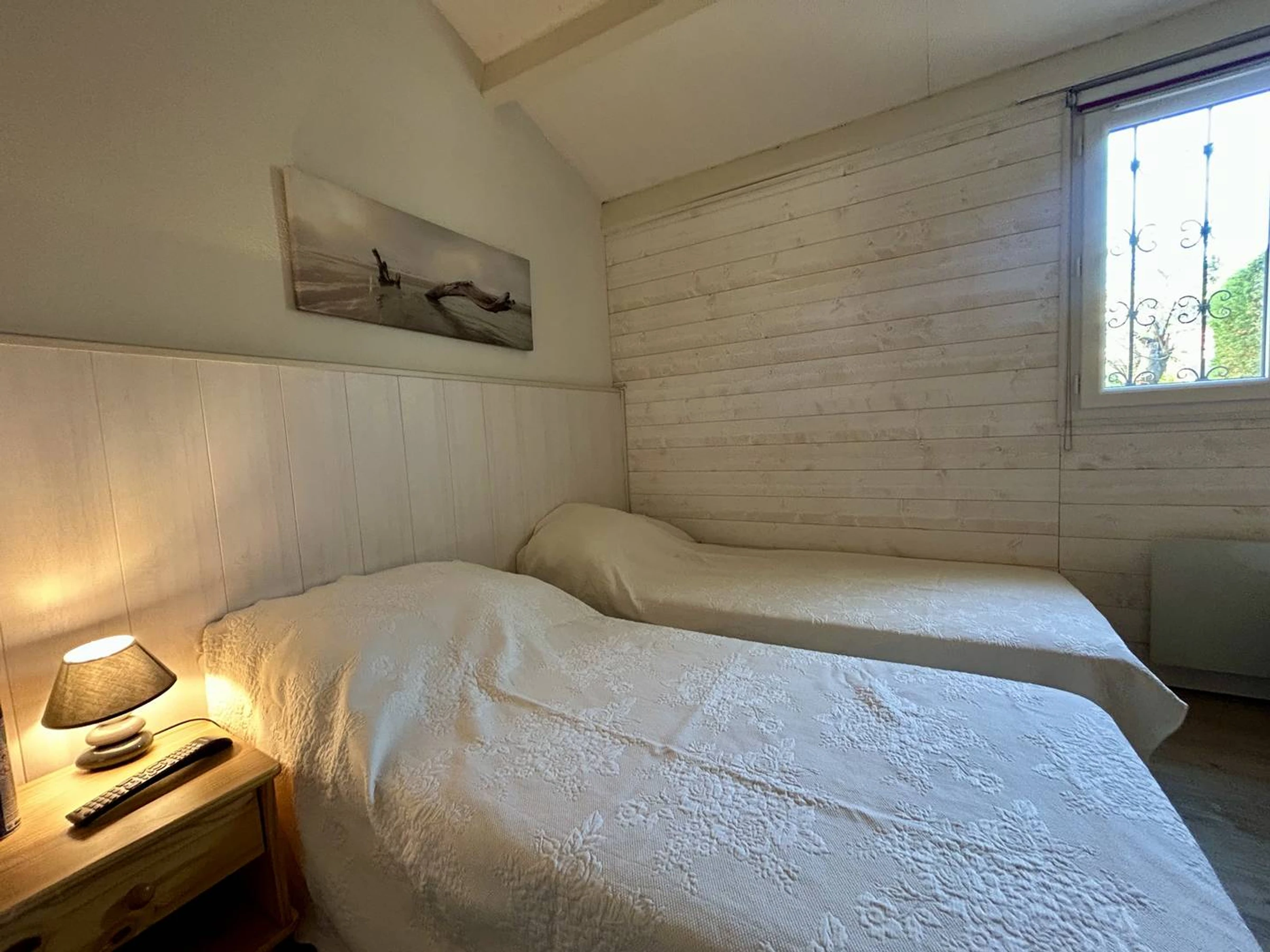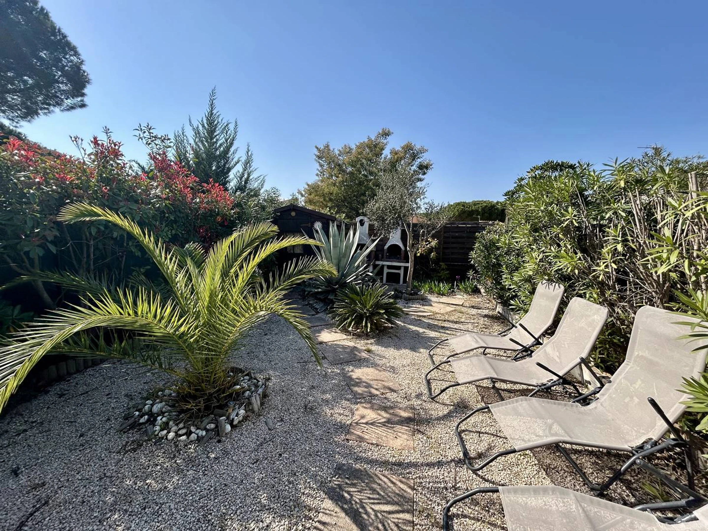 Cette maison de vacances climatisée dispose d'un séjour avec un canapé banquette, la télévision, et un coin cuisine, une chambre avec 2 lits simple, une mezzanine avec un lit double, d'une salle d'eau avec douche et des WC. Enfin, vous disposerez d'un grand jardin à l'abri des regards avec barbecue et d'une grande terrasse.