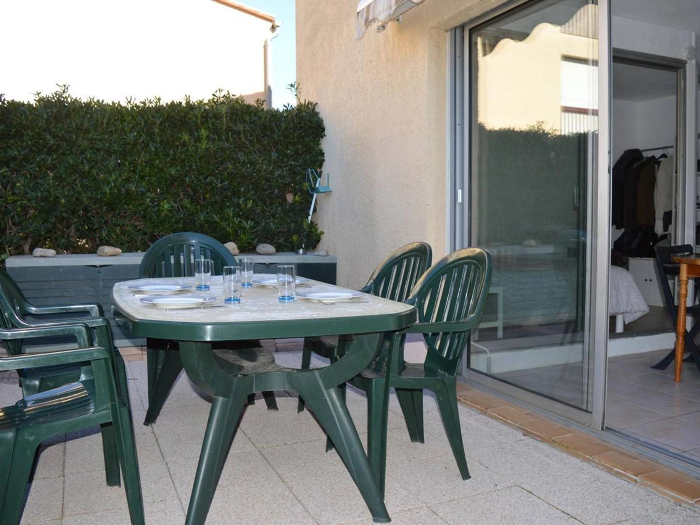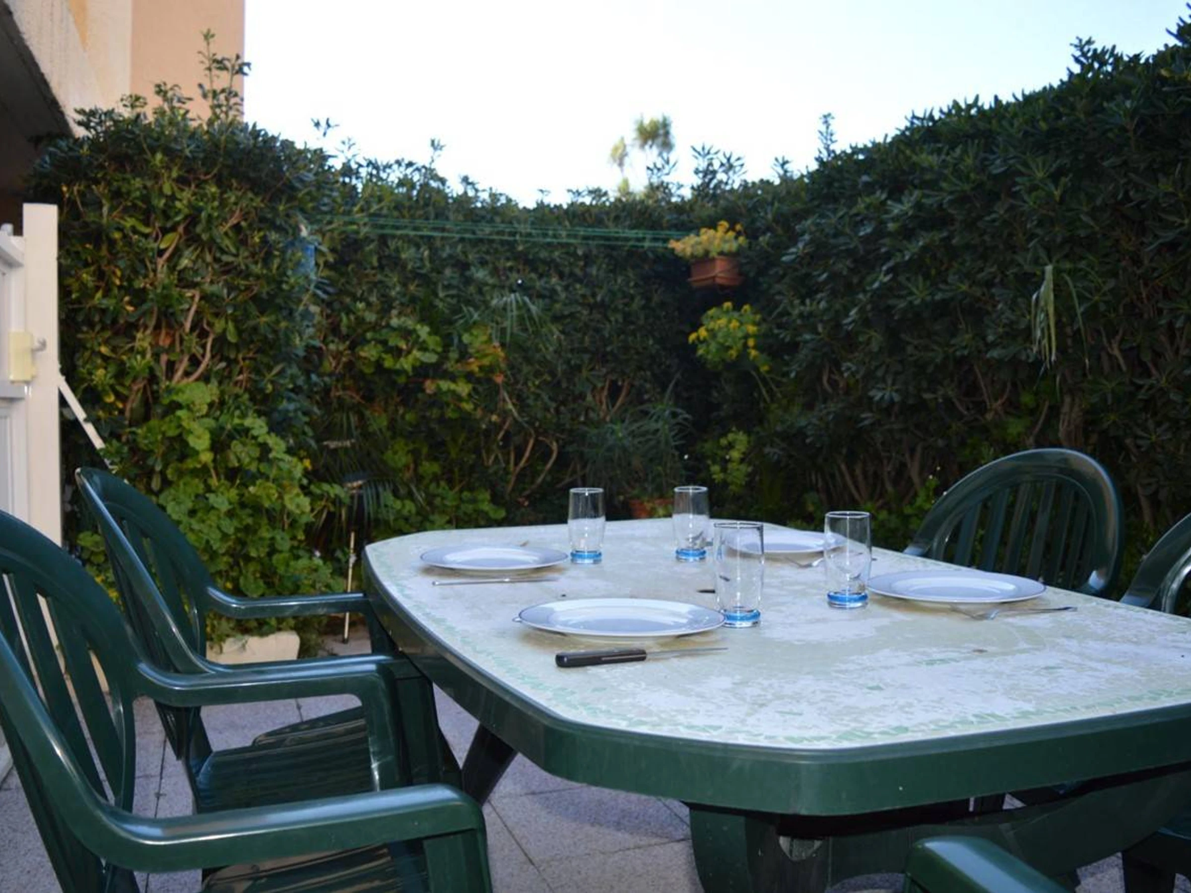Pour déjeuner au soleil, une jolie terrasse avec salon de jardin, barbecue et store.