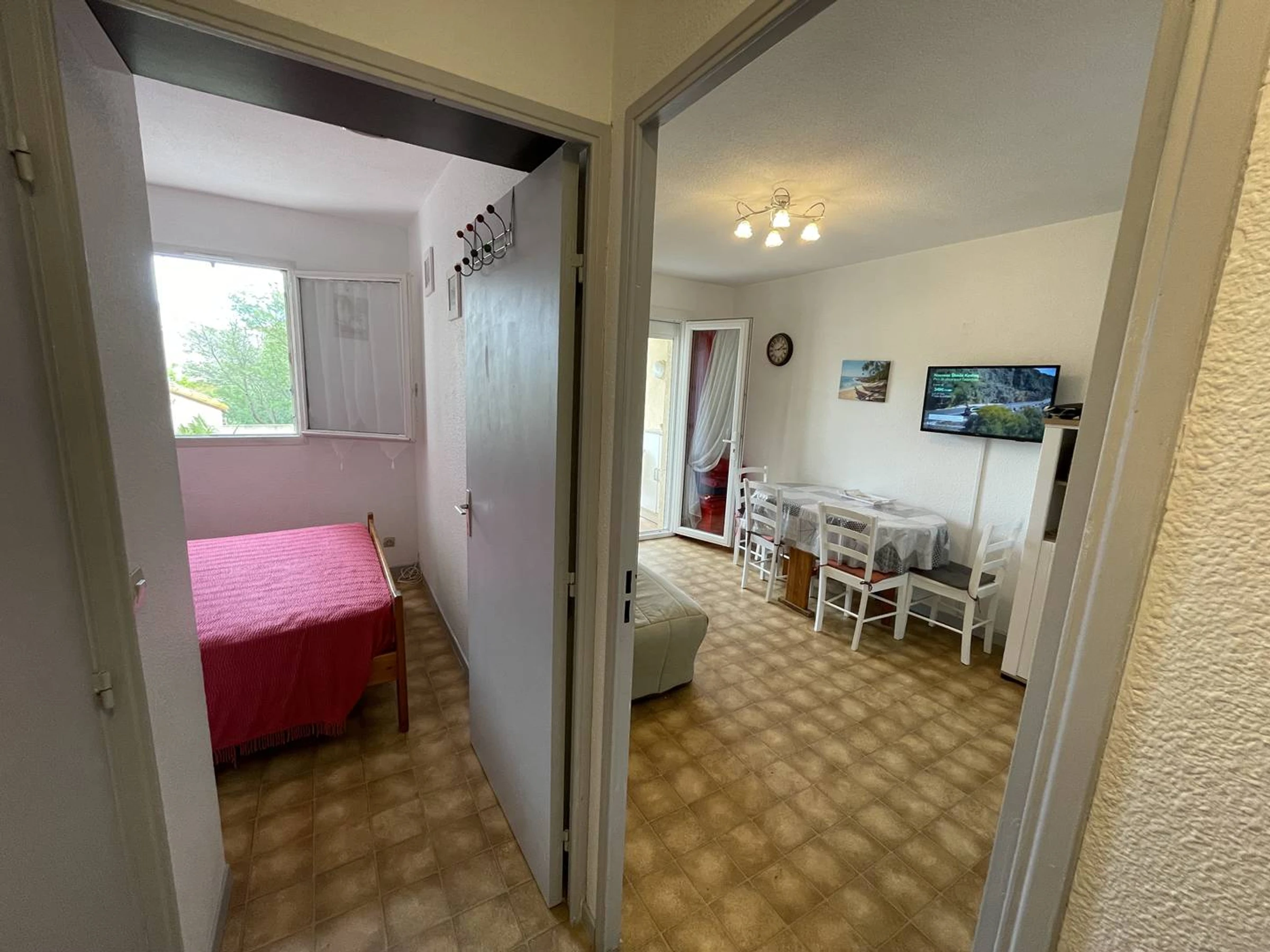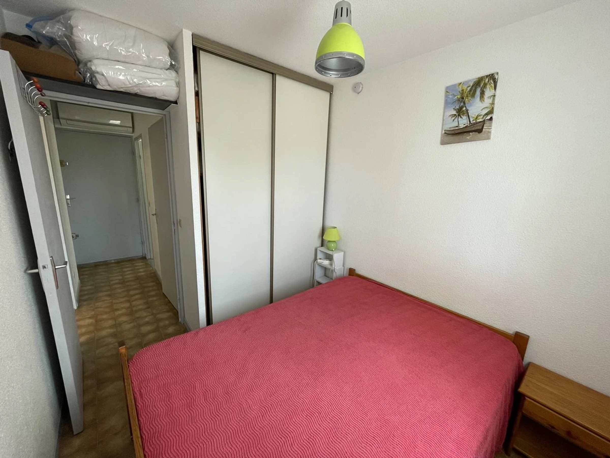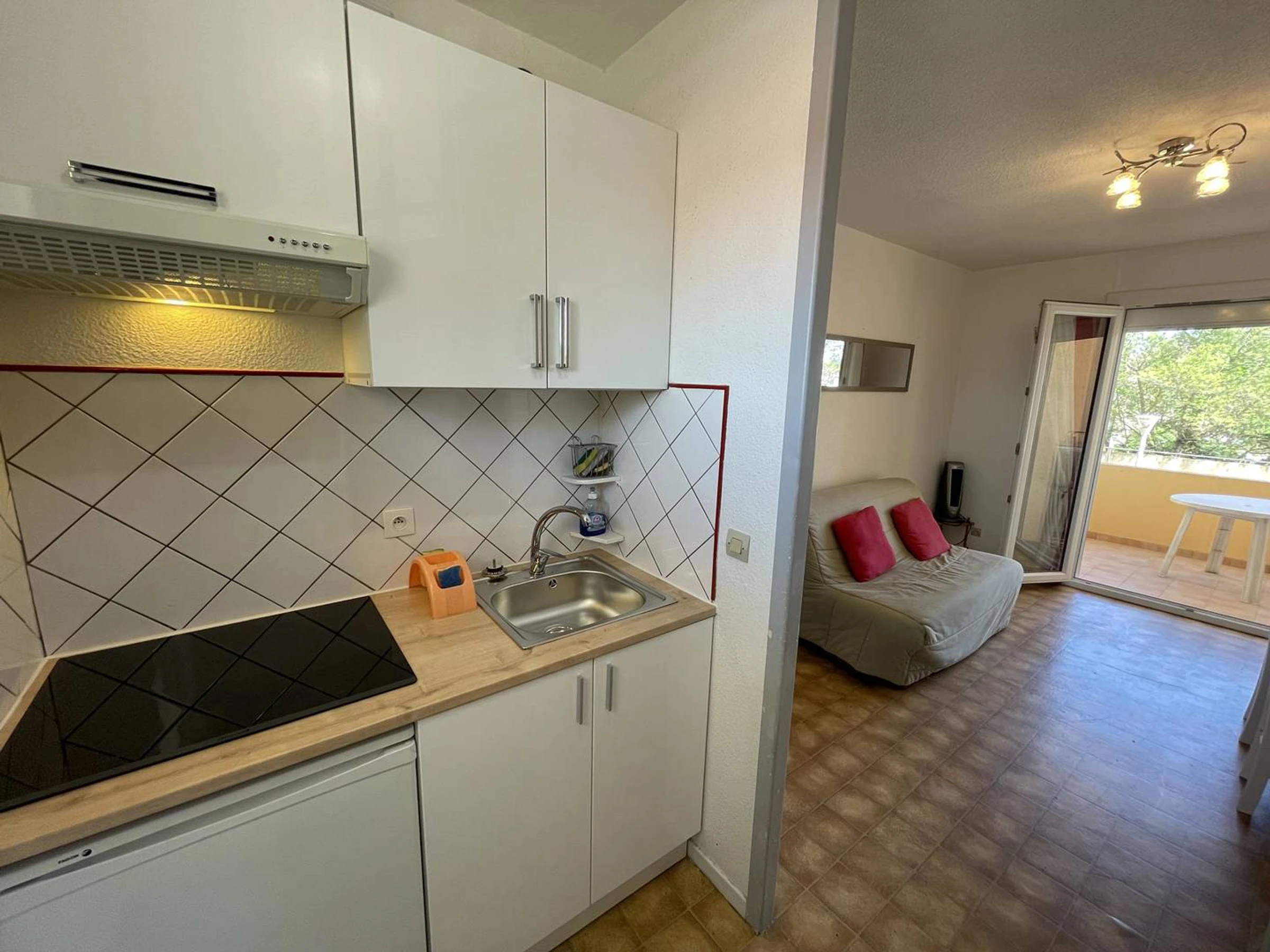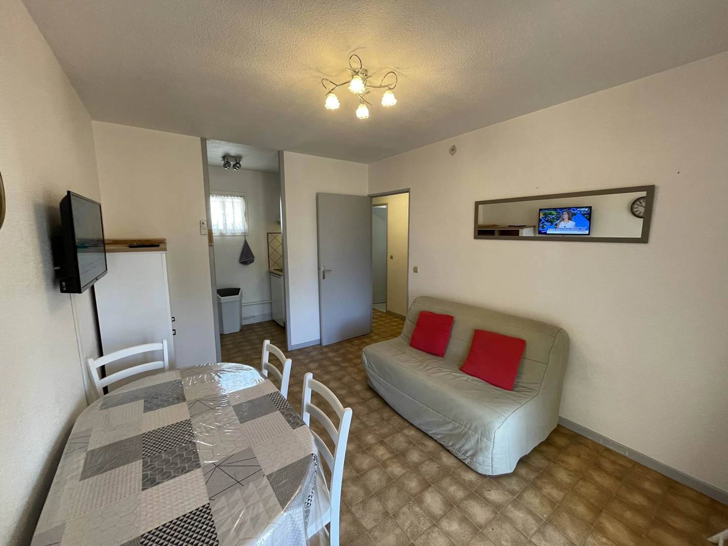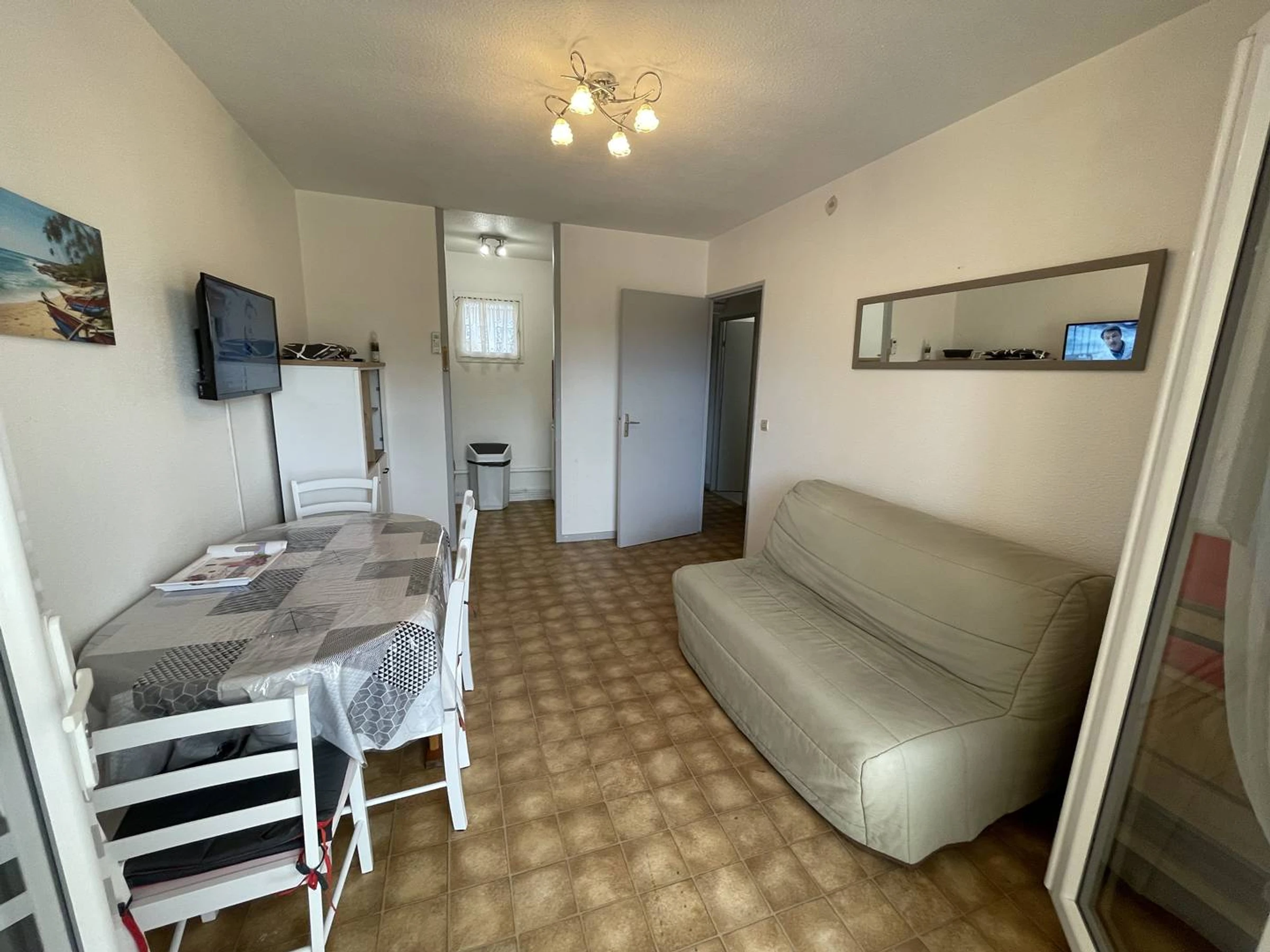 Sur le Port, Joli T2 climatisé traversant d'env.28m2, situé au 1er étage d'une petite copropriété en L avec piscine et parkings. Comprenant : entrée climatisation réversible, séjour avec canapé BZ et TV LCD... Coin cuisine semi séparé rénové (2025) : 3 plaques vitrocéramique, hotte, lave-linge, frigo-top, congélateur-top, cafetière électrique, micro-ondes, mini-four... Une chambre avec 1 lit 140 et placard donnant sur la piscine et le port. Salle d'eau (refaite en 2023) avec cabine douche, sèche serviettes élect. Wc séparés. kit de repassage, aspirateur. Terrasse carrelée (5m2) avec salon de jardin, vue piscine et port. Appartement clair et bien situé. Commerces, animations et restaurants à proximité. Sur 2 faces, Expo Est/ouest. Parking libre sécurisé au pied de la résidence. Idéal pour les vacances. RES. AVEC PISCINE SECURISEE, ouverte du 01/07 AU 31/08/26. PETITS ANIMAUX ADMIS.