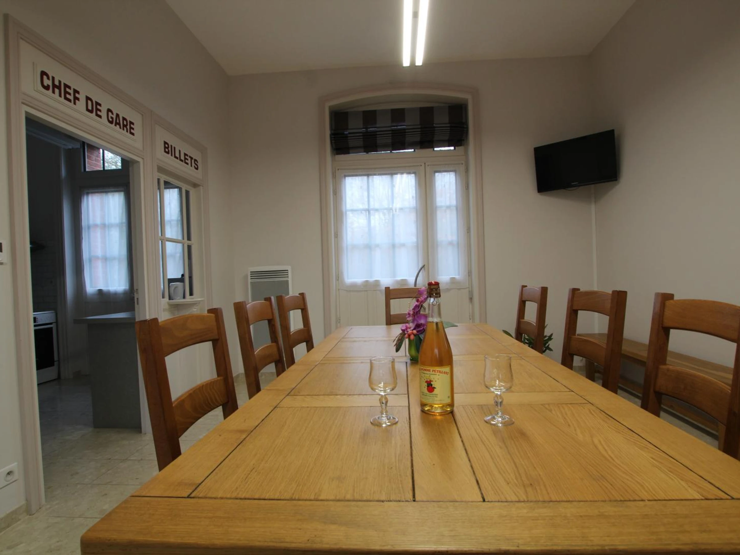 Maison indépendante. Cuisine (four, lave-vaisselle, réfrigérateur avec congélateur, micro-ondes). Buanderie (Lave-linge, sèche-linge). Séjour (TV, internet). Chambre 1 (lit 140x190) avec salle d'eau et wc (accessible PMR). Wc. Au 1er étage: salon avec TV. Chambre 2 (lit 140x190) avec salle de bains privative. Chambre 3 (2 lits 80x190 jumelables). Chambre 4 (2 lits 80x190 jumelables). Salle d'eau. Wc. Equipement bébé sur demande. Draps en location. Service ménage en supplément. Chauffage électrique compris. Terrain non clos privé. Terrasse. Table pique-nique. Barbecue. Parking. Abri. Label Accueil Vélo. Cette magnifique ancienne gare de campagne a retrouvé une nouvelle vie! Réhabilitée avec soin, elle arbore fièrement les traces de son glorieux passé: de l'ancien guichet à la signalétique! Un esprit décalé fort appréciable! Le gîte est parfait pour les pratiques de randonnées puisque située au bord de la Voie Verte! Aux portes du PNR Normandie Maine, de nombreux sites naturels et produits du terroir sont à découvrir le temps de votre séjour.