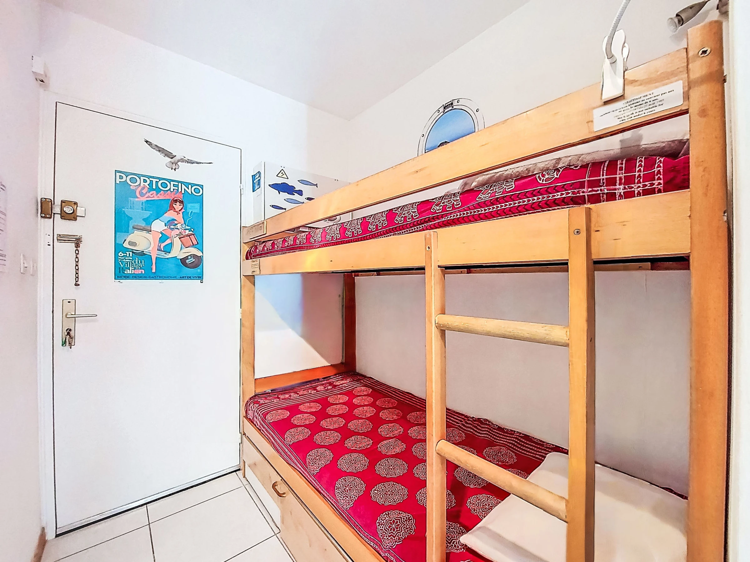 Studio 23 m2 au 1er étage, situation sud. Clair, aménagement fonctionnel: entrée, sans fenêtre avec 1 x 2 lits superposés (80 cm, longueur 190 cm). Séjour/salle à manger avec 1 divan-lit double (140 cm, longueur 200 cm), TV et DVD. Sortie sur la terrasse. Coin cuisine (2 plaques de cuisson, mini-four, grille-pain, bouilloire électrique, micro-ondes, cafetière électrique). Douche/WC. Chauffage électrique. Terrasse 6 m2, couverte, situation sud. Meubles de terrasse. A disposition: lave-linge, fer à repasser. Internet (Connexion WIFI, en sus). Place de parking No 633. Veuillez noter: adapté(e) aux familles. Maximum 1 animal/ chien de petite taille autorisé. TV seulement FR. Détecteur de fumée. [hidden]