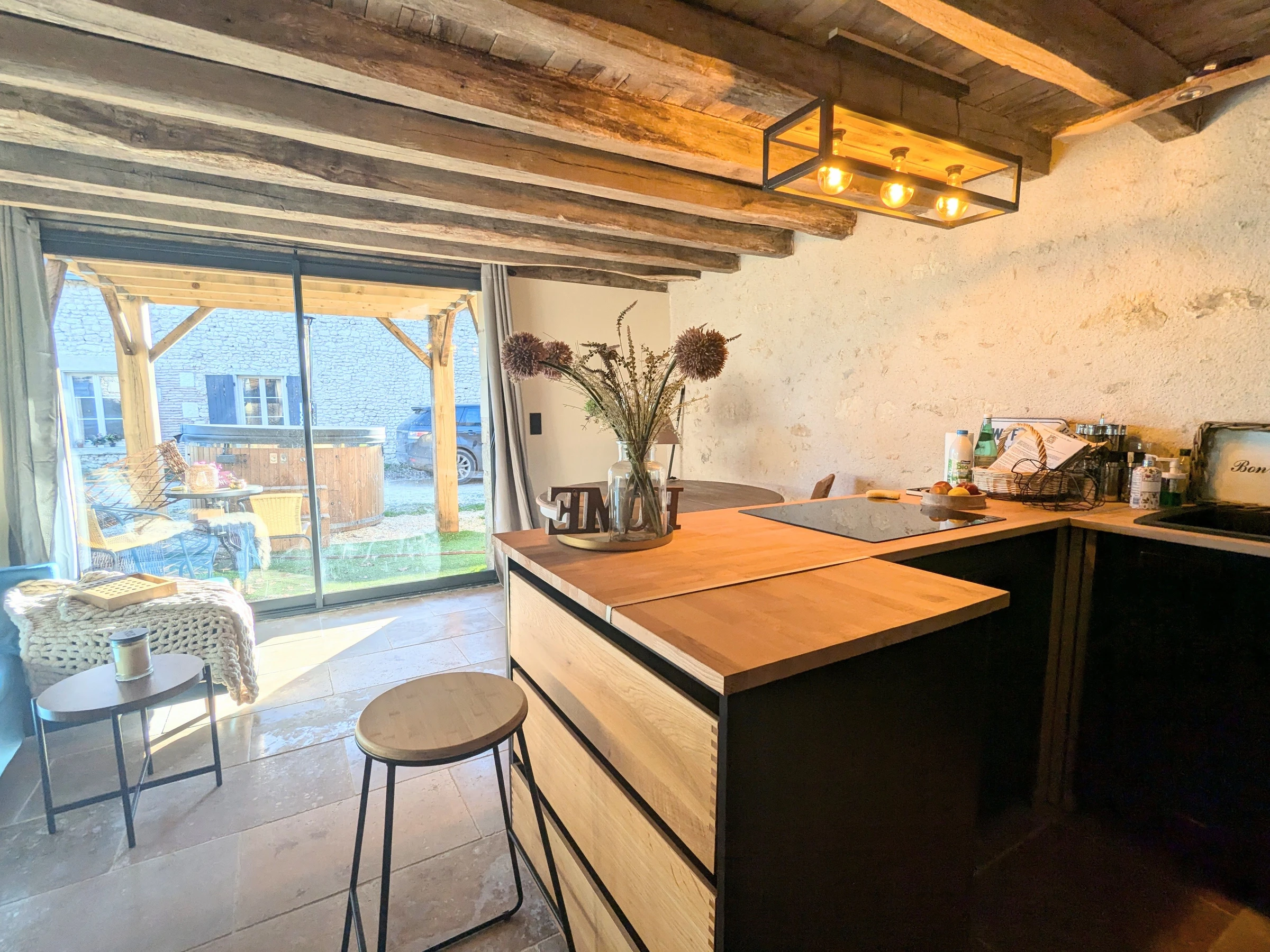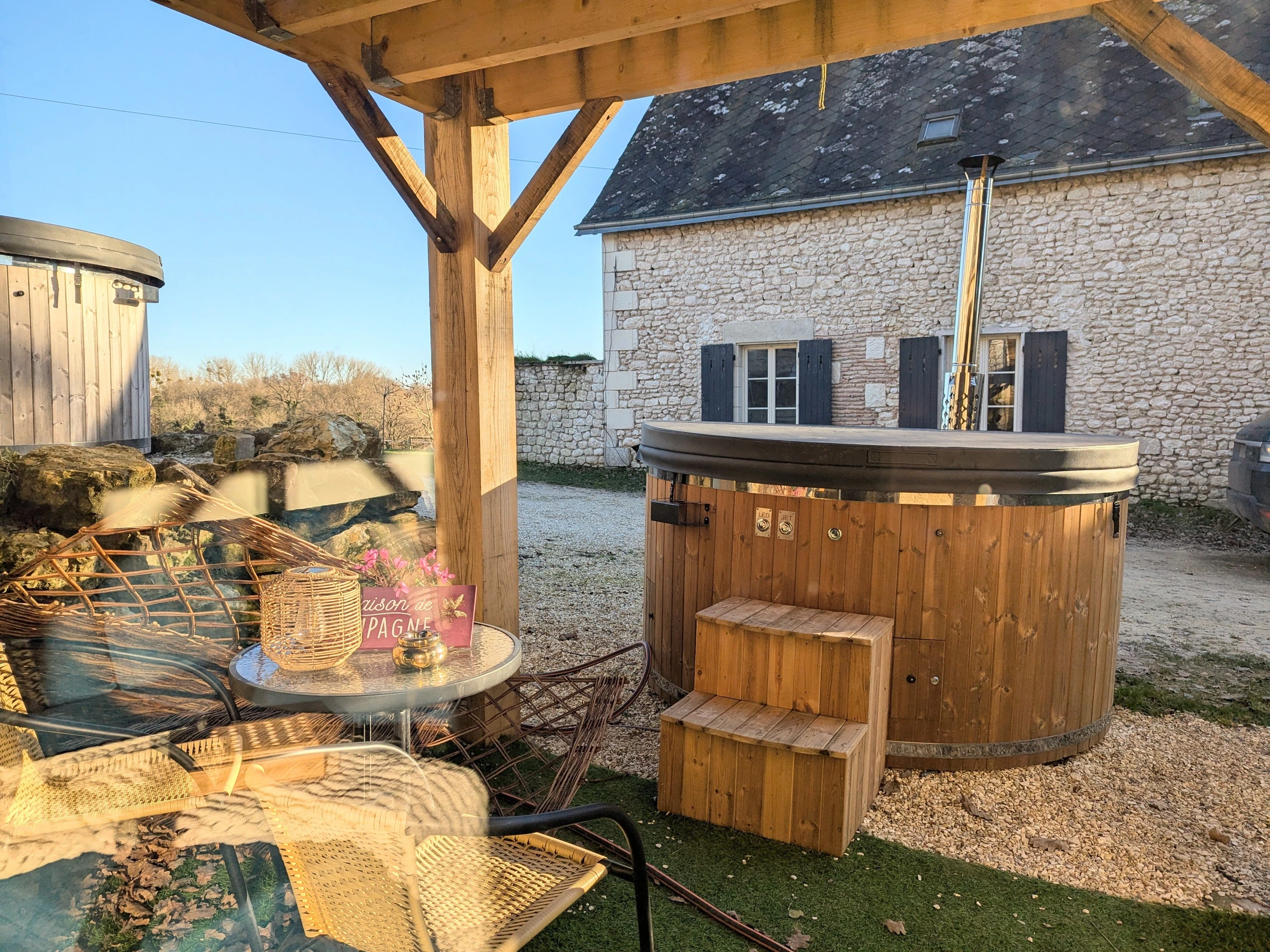 A l'extérieur une terrasse avec salon de jardin, un barbecue à gaz et un bain nordique privatif.
