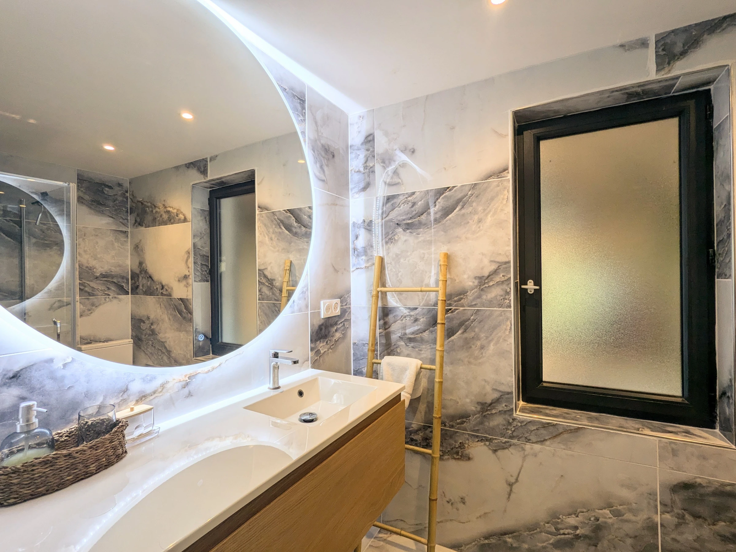 Un escalier en colimaçon assez étroit permet d'accéder à l'espace nuit avec une comprenant 1 lit 2 personnes de 180 x 20 cm et des rangements et l'accès à une terrasse, une salle d'eau avec douche, lavabos, sèche-serviettes et wc et un palier avec un accès à l'extérieur.