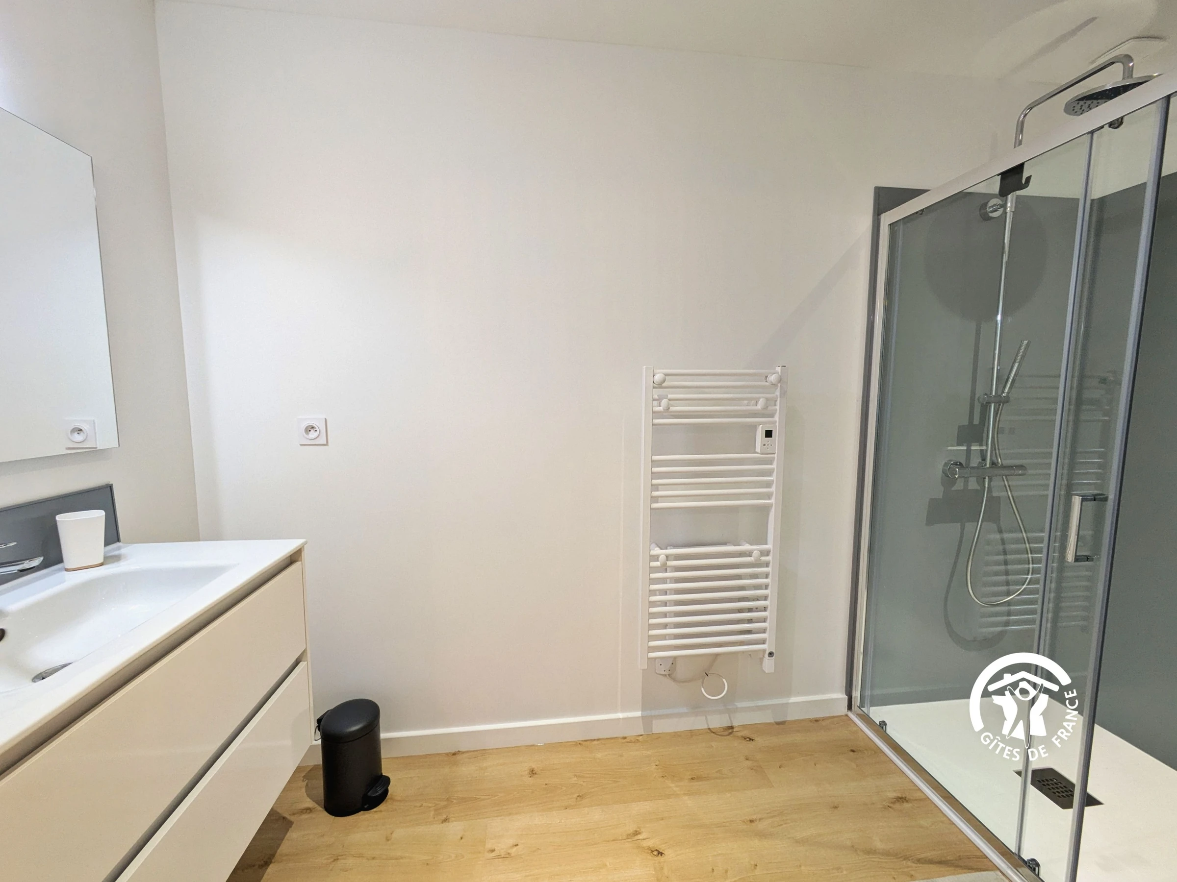 Animal non accepté, sauf chevaux en paddock. L'hébergement n'est pas réellement de plain-pied : quelques marches entre le séjour et l'espace chambre du RDC, salle d'eau et wc indépendant.