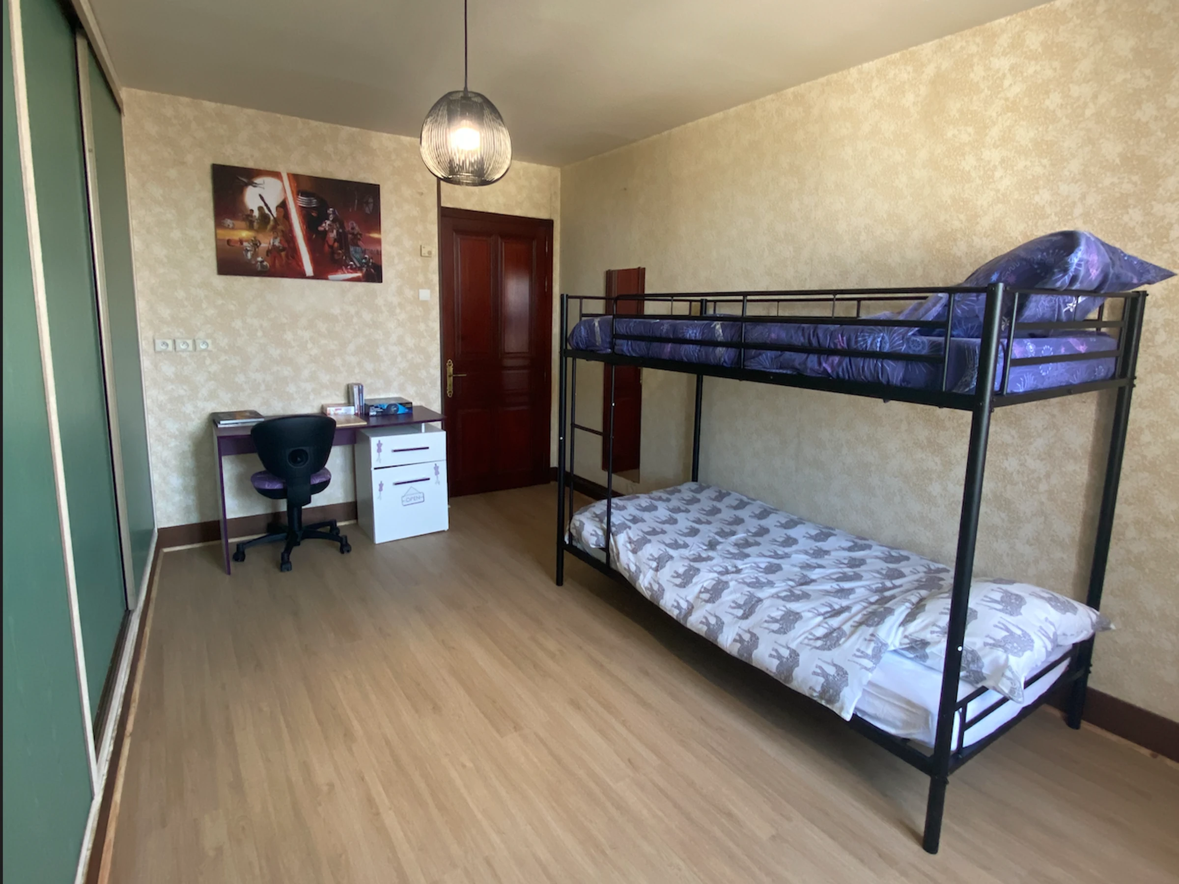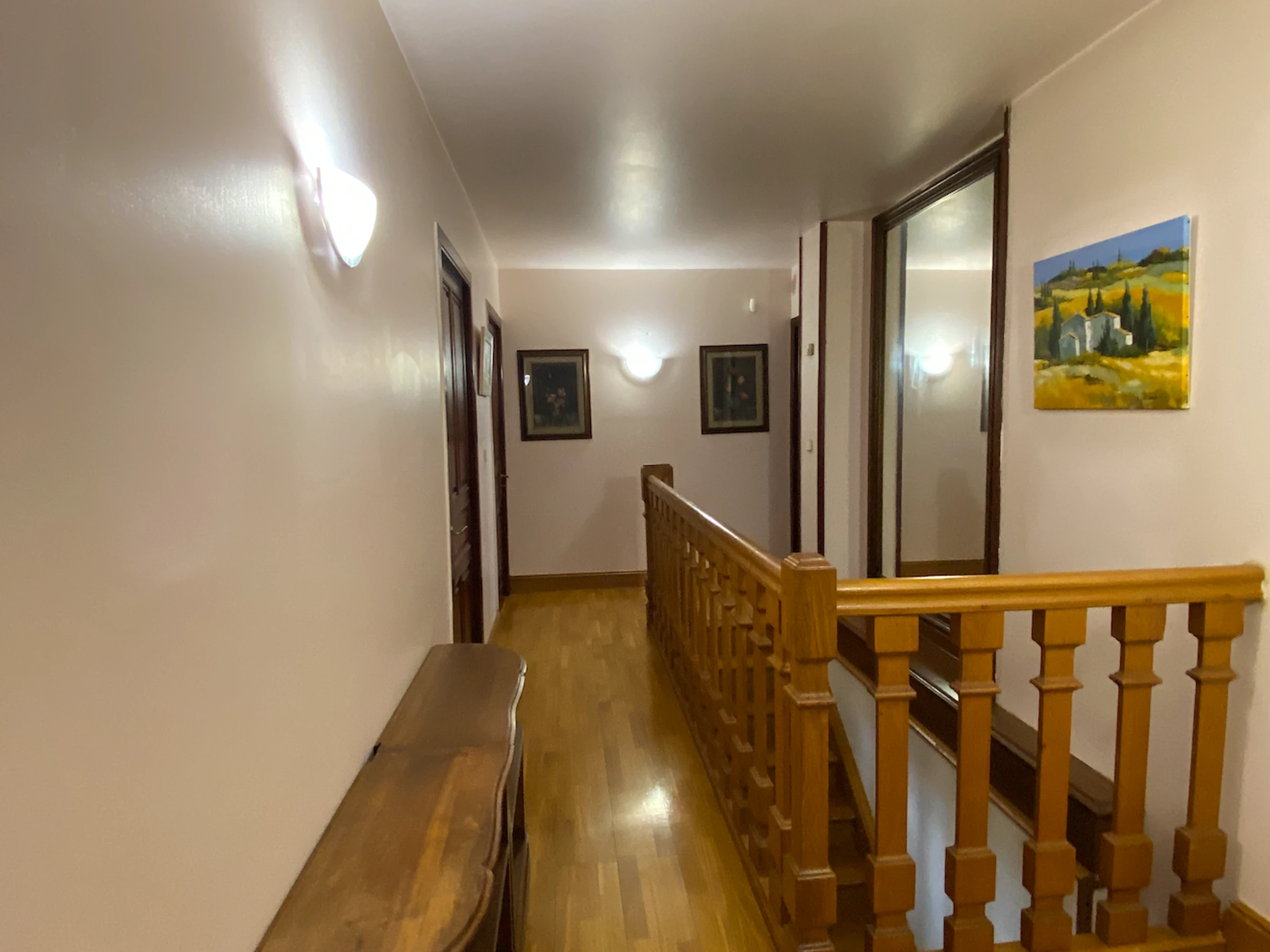 A l'étage : 1 chambre avec un lit 1 personne (120 cm), une chambre avec un lit 2 personnes, une chambre avec 2 lits superposés et un lit une personne, une suite familiale avec un lit 2 personnes et une salle de bain privative, wc et salle d'eau. Une mezzanine avec deux couchages d'appoint sur un canapé convertible et une banquette convertible et une suite familiale avec un lit 2 personnes (160 cm), wc et salle d'eau