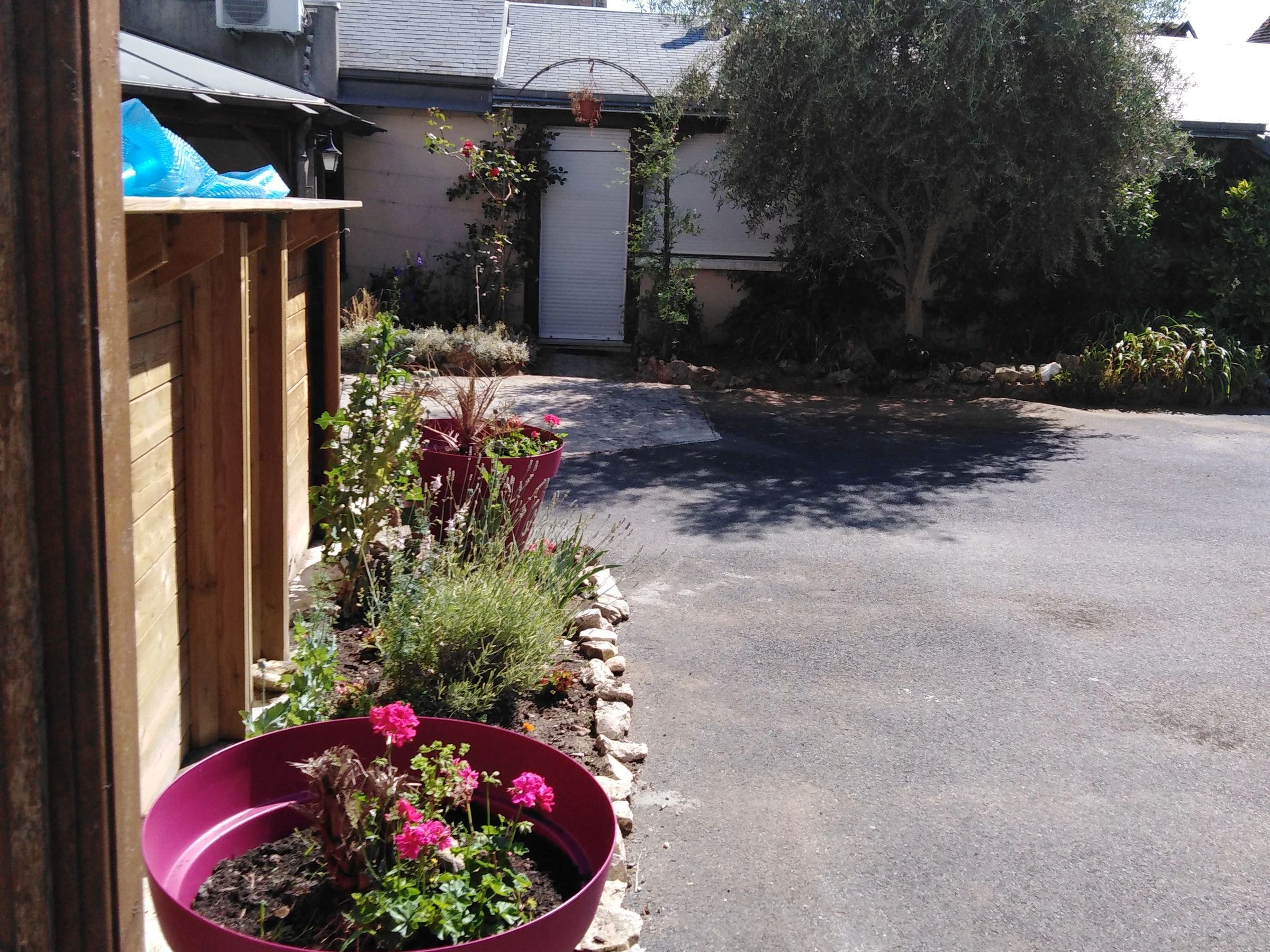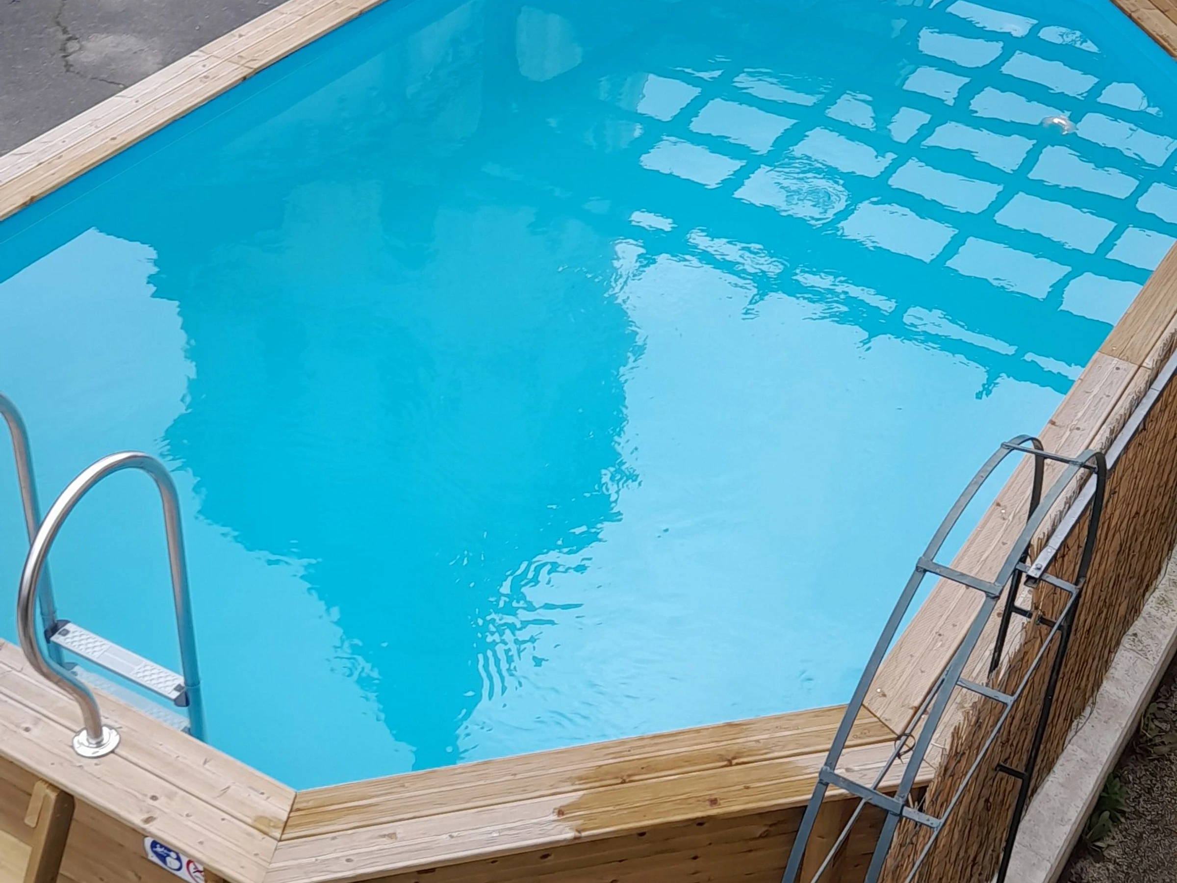 En extérieur : un garage où il est possible de garer une voiture et une cour avec piscine hors-sol privative de 5,90 x 3,60 m.