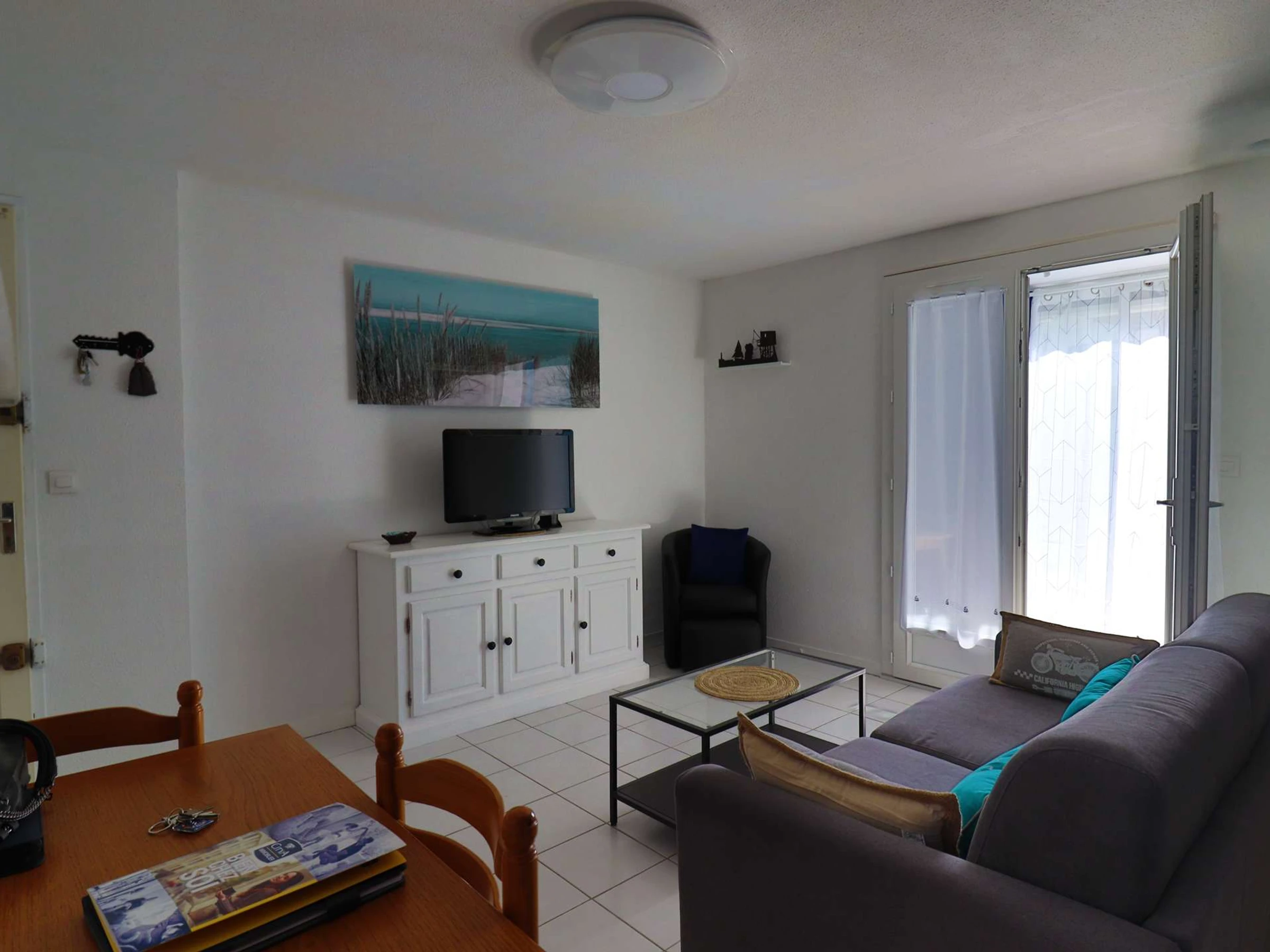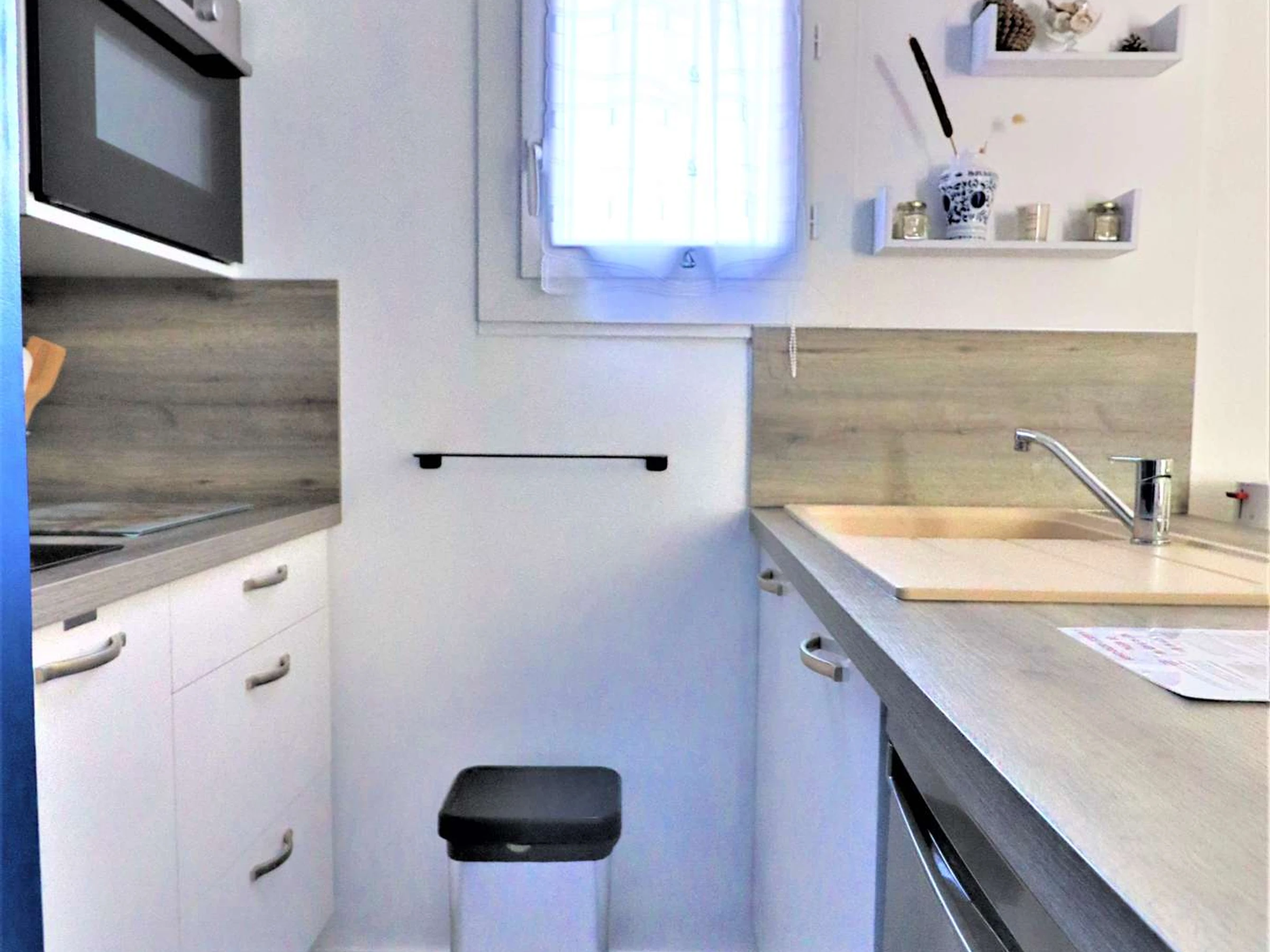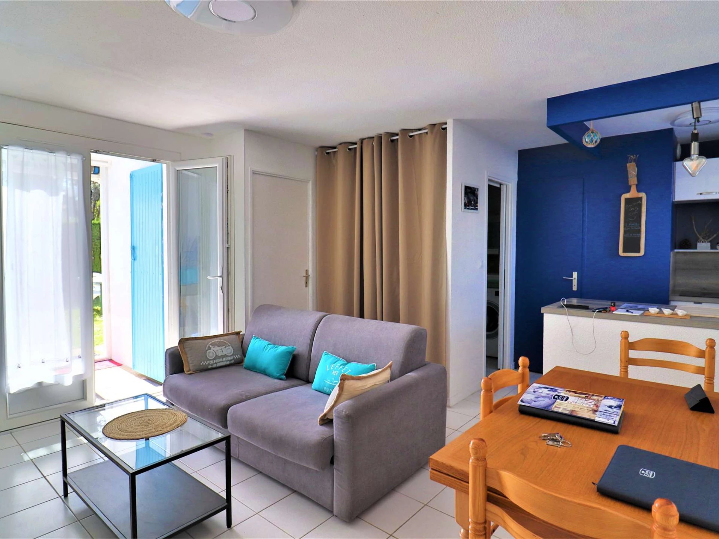Comprenant un séjour avec un canapé lit convertible côté jardin, une partie salle à manger et une partie séjour, une cuisine ouverte bien équipée et aménagée de meubles et électroménager, une chambre avec 1 lit double de 140 et une armoire, une salle d'eau avec douche, une sèche serviettes, un WC indépendant.