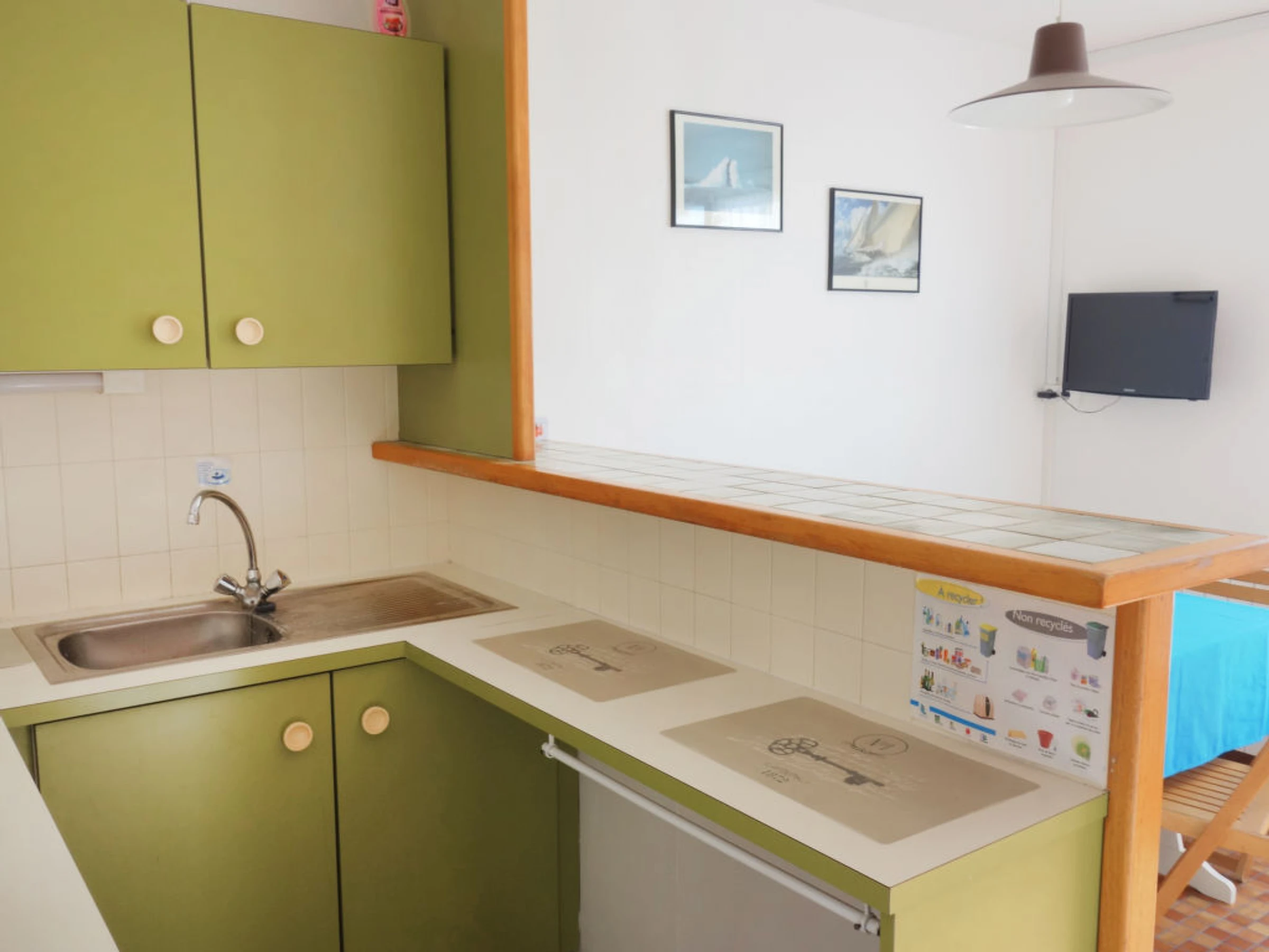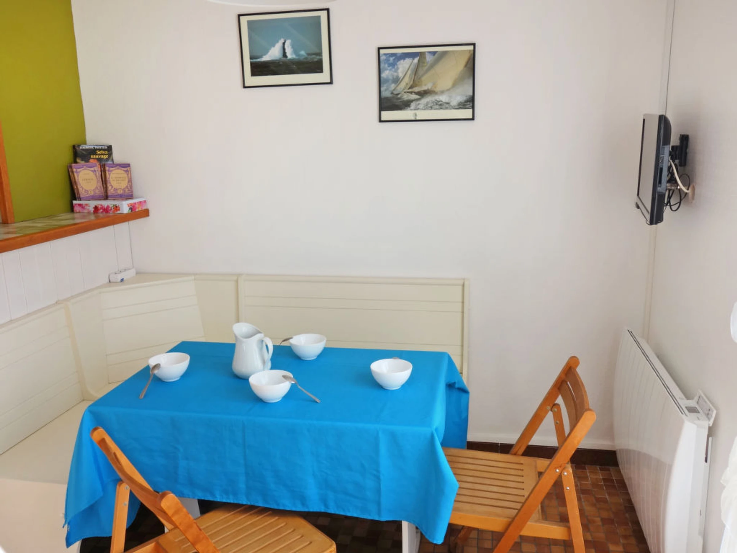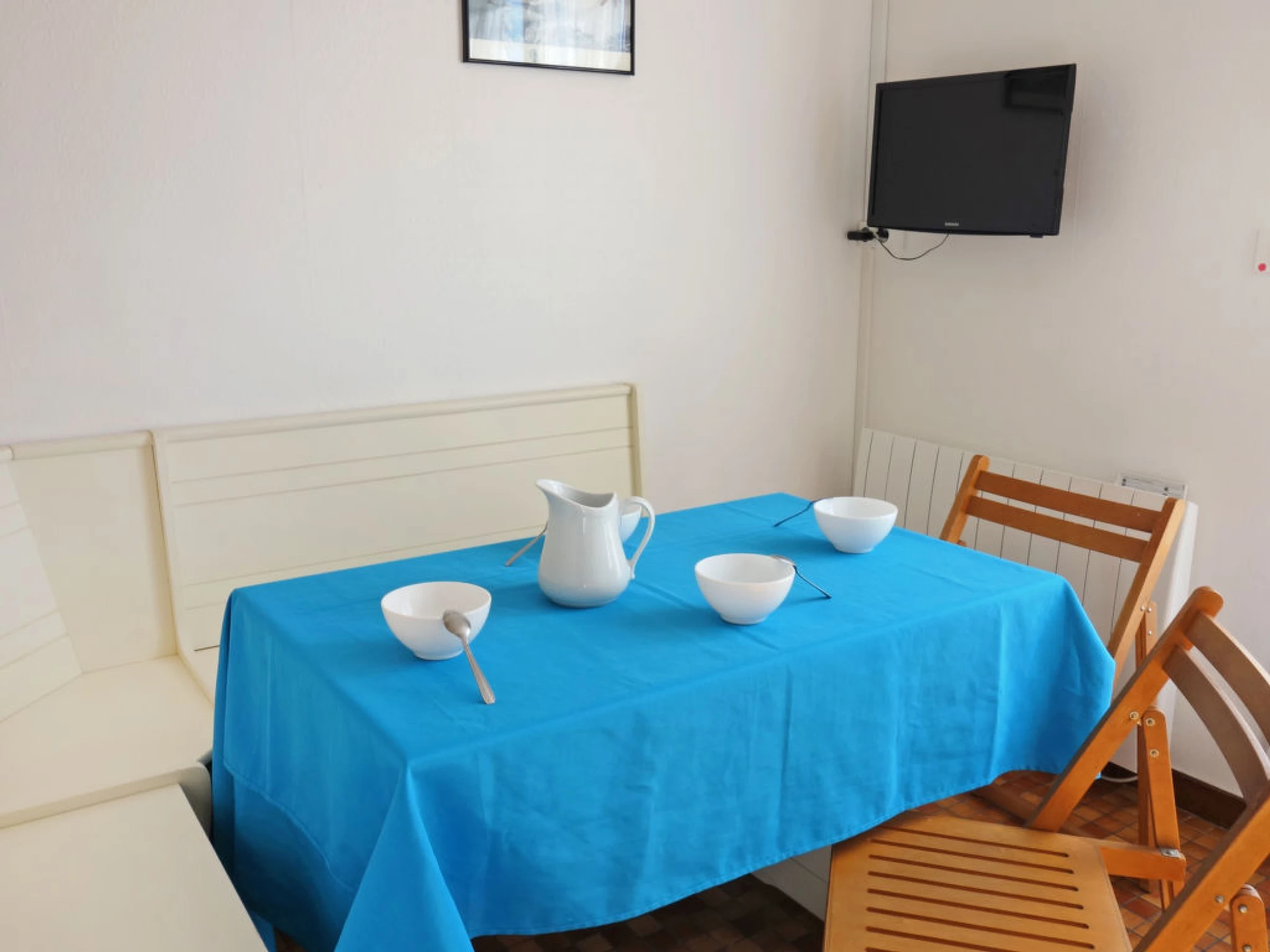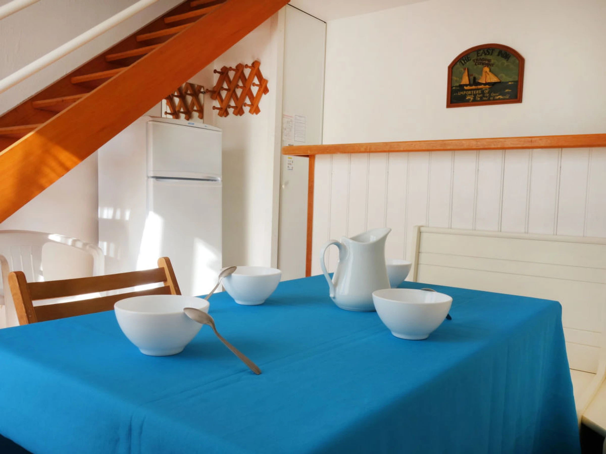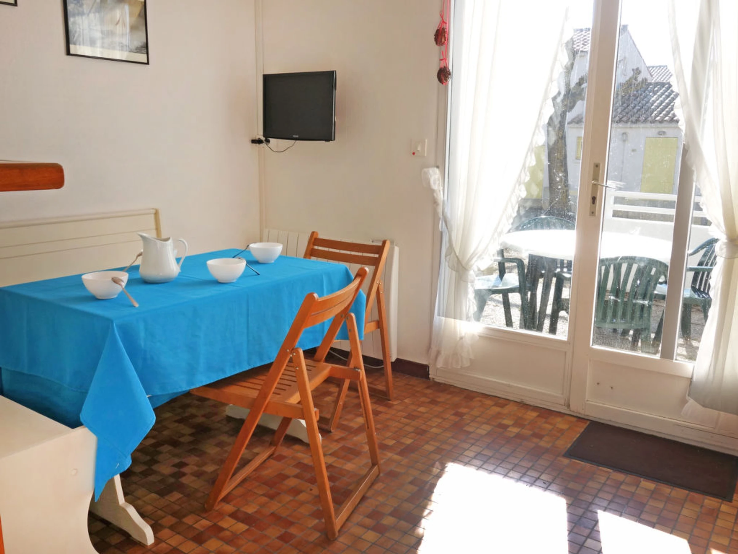 Appartement sur 2 niveaux 3 pièces 36 m2, au rez-de-chaussée. Séjour/salle à manger avec TV. Sortie sur la terrasse. Coin cuisine (3 plaques de cuisson, congélateur, combiné micro-ondes). À l'étage supérieur: 1 chambre avec 2 lits (80 cm). 1 chambre avec 1 lit (80 cm), 1 x 2 lits superposés (80 cm). Douche, WC séparé. Terrasse 10 m2. Meubles de terrasse. Place de parking No P44. Veuillez noter: logement côté cour. Maximum 1 animal/ chien autorisé. Inclus: Place de stationnement, Nettoyage final Disponible sur le site avec supplément: Réhausseur bébé (pour enfants) 3.0EUR par jour, Linge de lit (premier jeu) 8.0EUR par personne, Serviettes (premier jeu) 4.0EUR par personne, Lit bébé (jusqu'à 2 ans) 3.0EUR par jour Services supplémentaires obligatoires sur le site: Taxe de séjour enfants (par personne et par jour), Taxe de séjour bébés (0-2) (par personne et par jour), Taxe de séjour 0.4EUR par personne et par jour, Taxe de séjour 0.8EUR par personne et par jour, Taxe de séjour 0.55EUR par personne et par jour