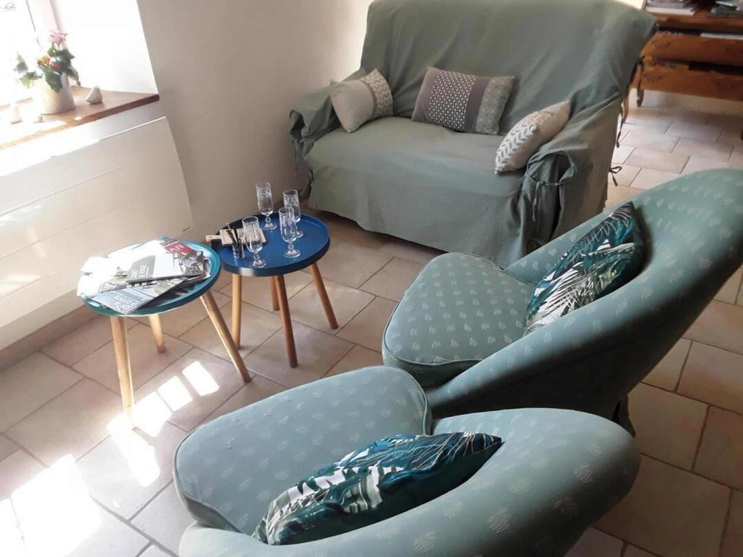 Maison mitoyenne au propriétaire. Séjour avec poêle à bois (TV, poste-radio, Internet). Coin-cuisine (plaque gaz/électrique, machine Expresso, four, lave-vaisselle, micro-ondes). Buanderie (lave-linge, mini-congélateur). WC. A l'étage : Chambre 1 (1 lit 140X190). Chambre 2 (1 lit 140X190). Salle d'eau avec WC (2 lavabos, cabine de douche, sèche-cheveux, sèche-serviettes). Cour privée. Terrain clos commun sécurisé par un portail. Salon de jardin. Transats. Barbecue. Abri couvert. Parking. Recharge véhicule électrique non possible. Jeux extérieurs (pétanque, raquettes, ..) et jeux de société. Boulodrome et aire de jeux pour enfants à 300m du gîte. Chauffage électrique. Toutes charges comprises. Linge de lit et de toilette en location (offerts pour les séjours de 2 et 3 nuits uniquement nuits). Service ménage en option. Bois payant. Équipement bébé sur demande. Ce paisible village est situé entre Valognes (connu pour son ses hôtels particuliers) et la côte Est du Cotentin. Au sein d'une authentique demeure de caractère, ce gîte bénéficie d'une configuration idéale étant exposé au Sud à l'arrière de la maison des propriétaires et entouré d'un mur en pierre. Intimiste et douillet, ce bien est idéalement positionné pour découvrir les sites incontournables de la presqu'île, des plages du Débarquement à Cherbourg, de l'île Tatihou aux vertes prairies du PNR des marais du Cotentin. Selon la saison, vous pourrez profiter de la cour fleurie ou du poêle à bois.