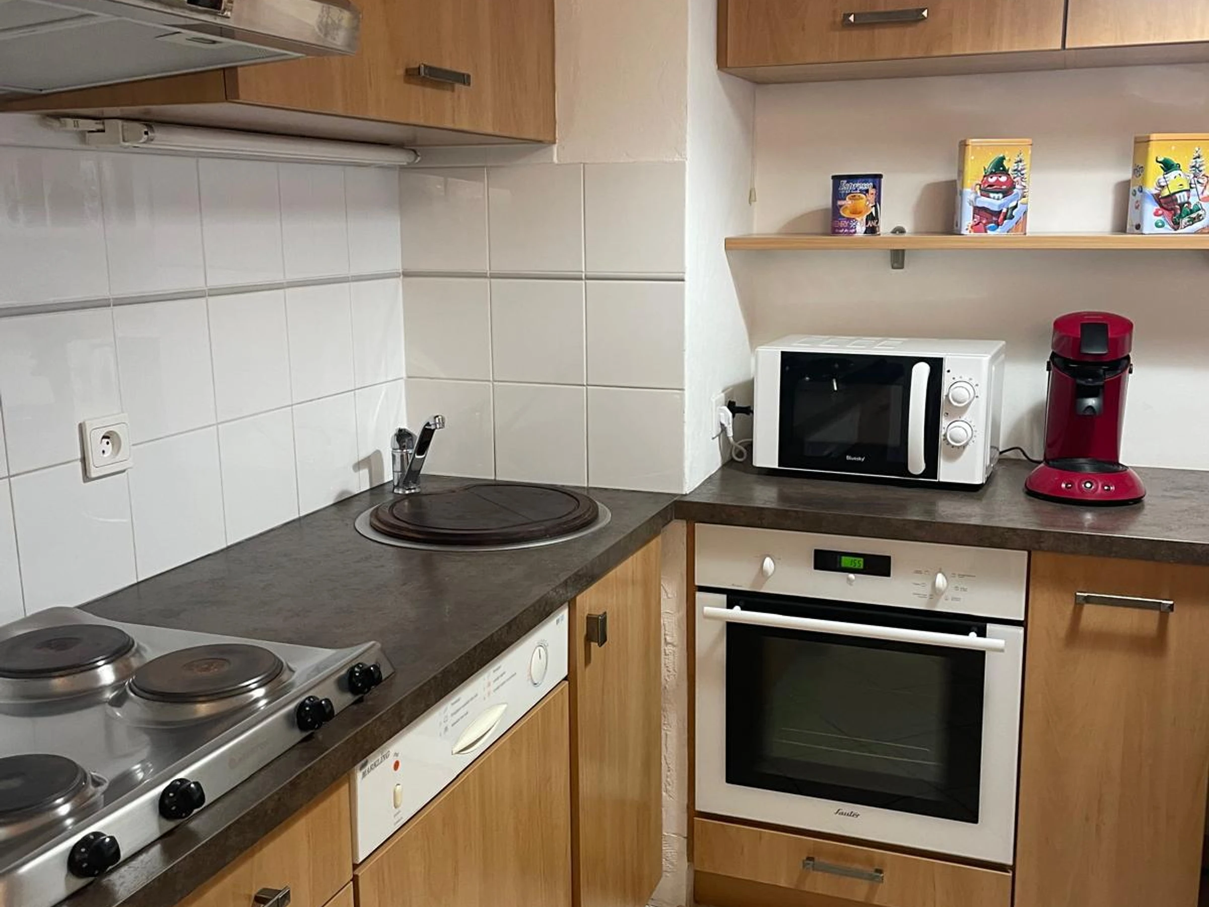 -Cuisine équipée d'un lave-vaisselle, plaques de cuisson electriques, four, micro-onde, cafetière, réfrégirateur, et bouilloire électrique.