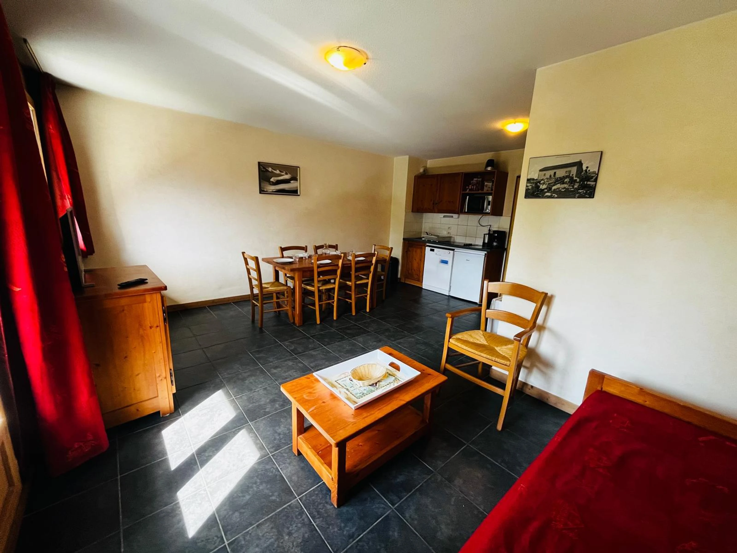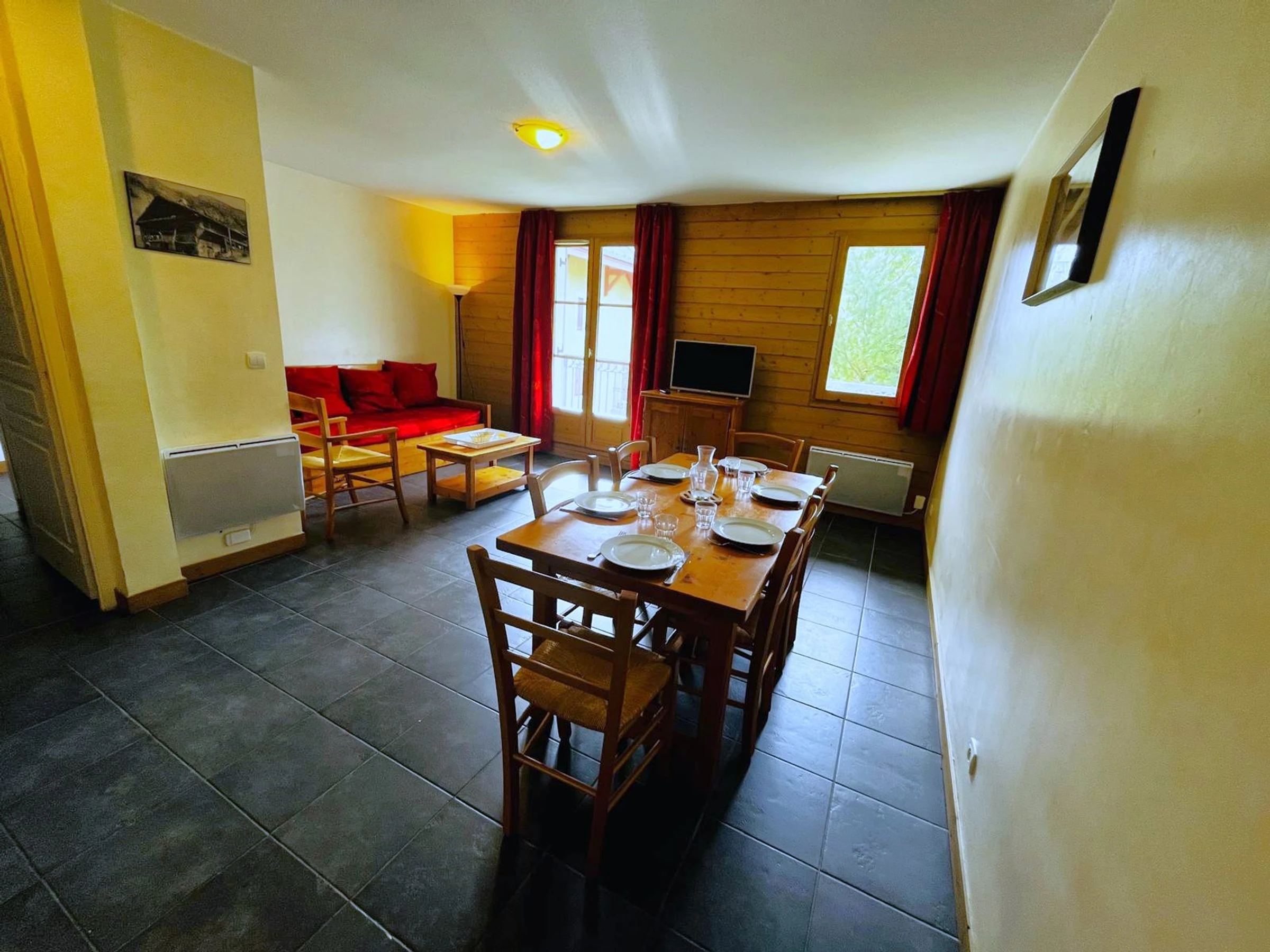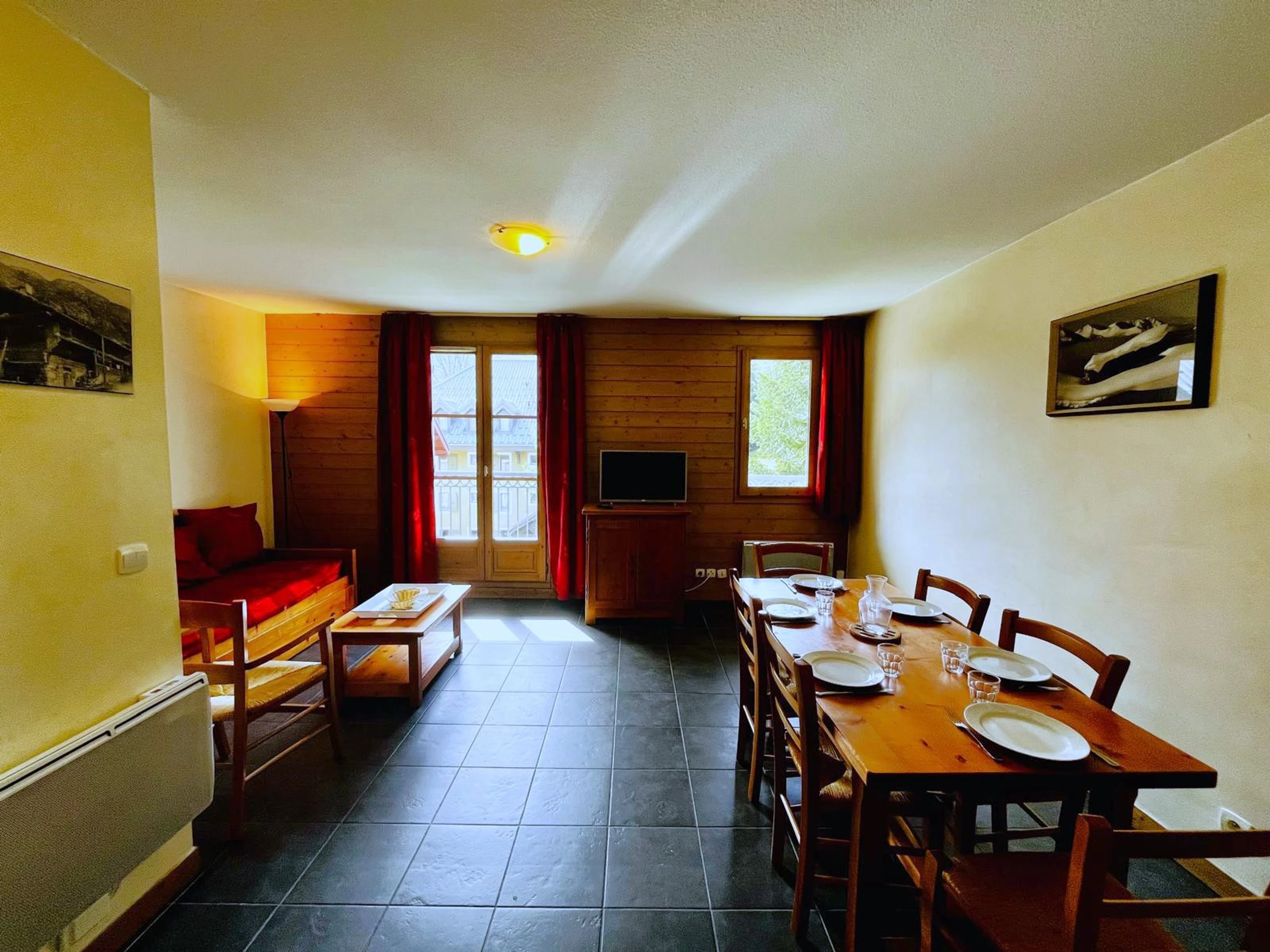 - Salon avec canapé-lit convertible (90 x 180 x 2), télévision, table et 6 chaises.