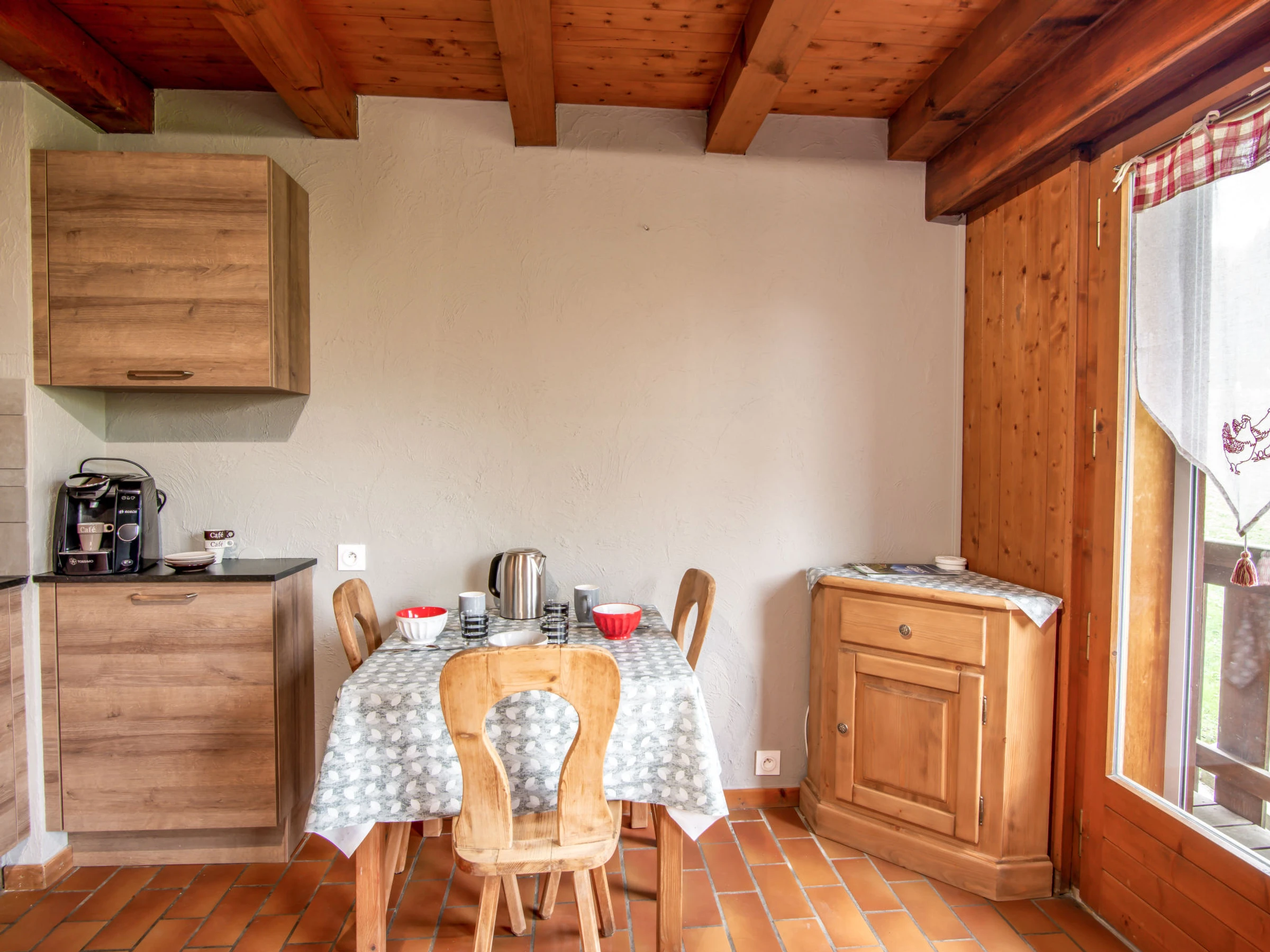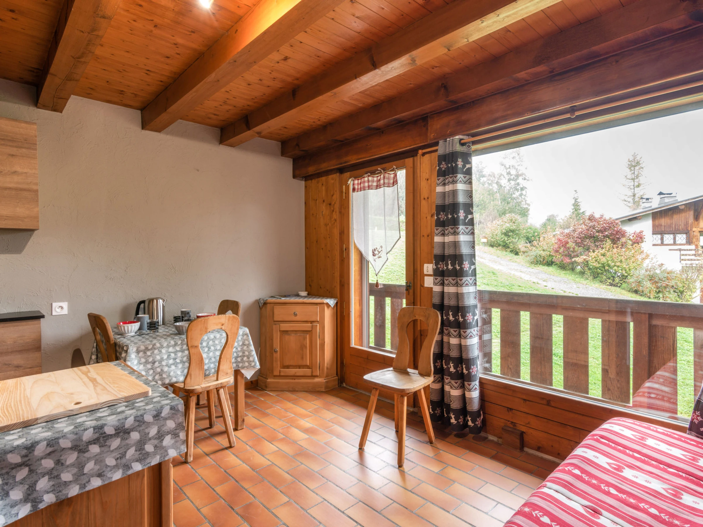 "Les G'rets" studio 22 m2 au 1er étage. Entrée avec 1 x 2 lits superposés (80 cm, longueur 190 cm). Séjour/chambre à coucher avec 1 divan-lit (140 cm, longueur 190 cm), TV (écran plat). Coin cuisine (2 plaques vitrocéramiques, grille-pain, bouilloire électrique, cafetière électrique, Capsules pour machine à café (tassimo) (NON INCLUSES), combiné micro-ondes). Bain/WC. Chauffage électrique. Petit balcon, situation nord et situation nord-est. Belle vue sur les montagnes. A disposition: Internet (Connexion WIFI, en sus). Veuillez noter: sans ascenseur.
