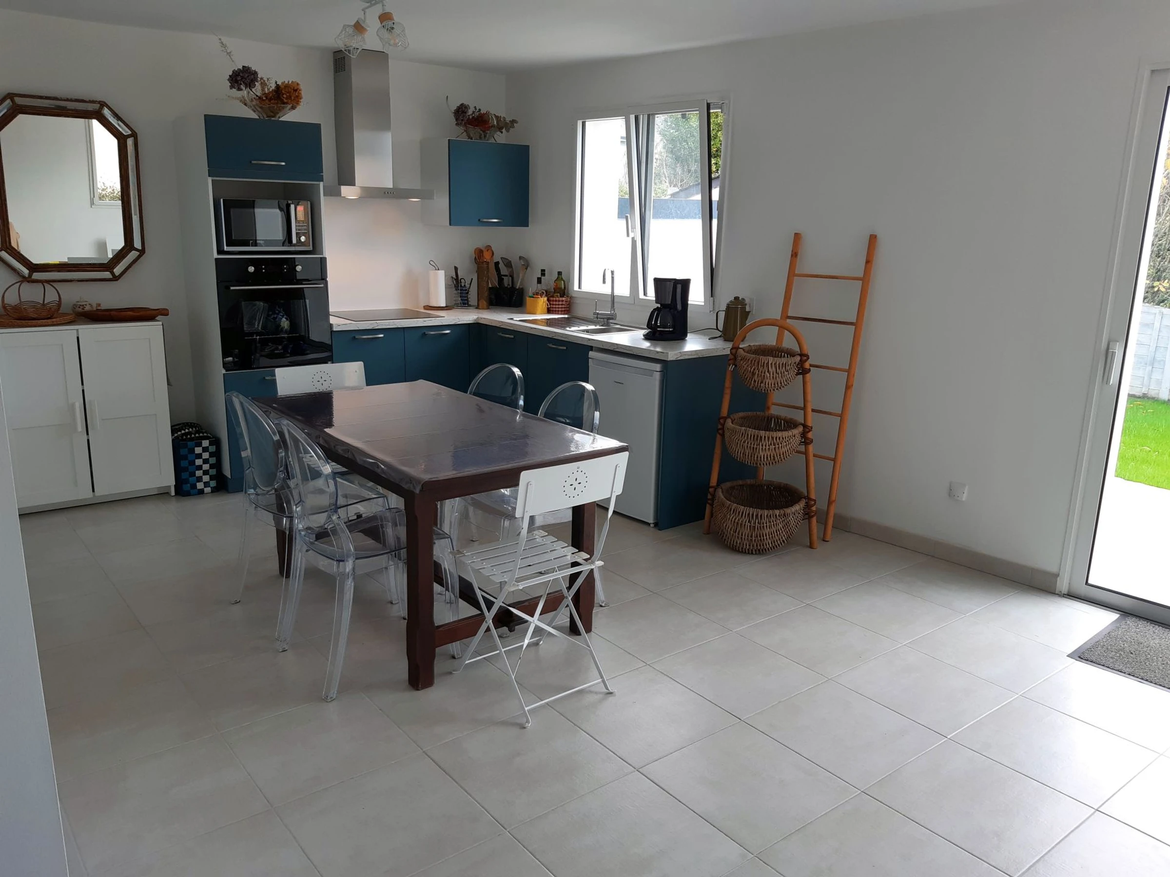 Maison récente, idéalement située pour passer de belles vacances comprenant au rez-de-chaussée : entrée, séjour-salon avec TV et poêle à granulés, coin cuisine équipé et aménagé (four électrique, micro-ondes, plaque à induction avec 3 feux, lave-vaisselle 6 couverts, 1 réfrigérateur "top", cafetière électrique à filtres), buanderie avec lave-linge, sèche-linge et réfrigérateur avec compartiment congélateur, toilettes avec lave-mains, salle de douche.