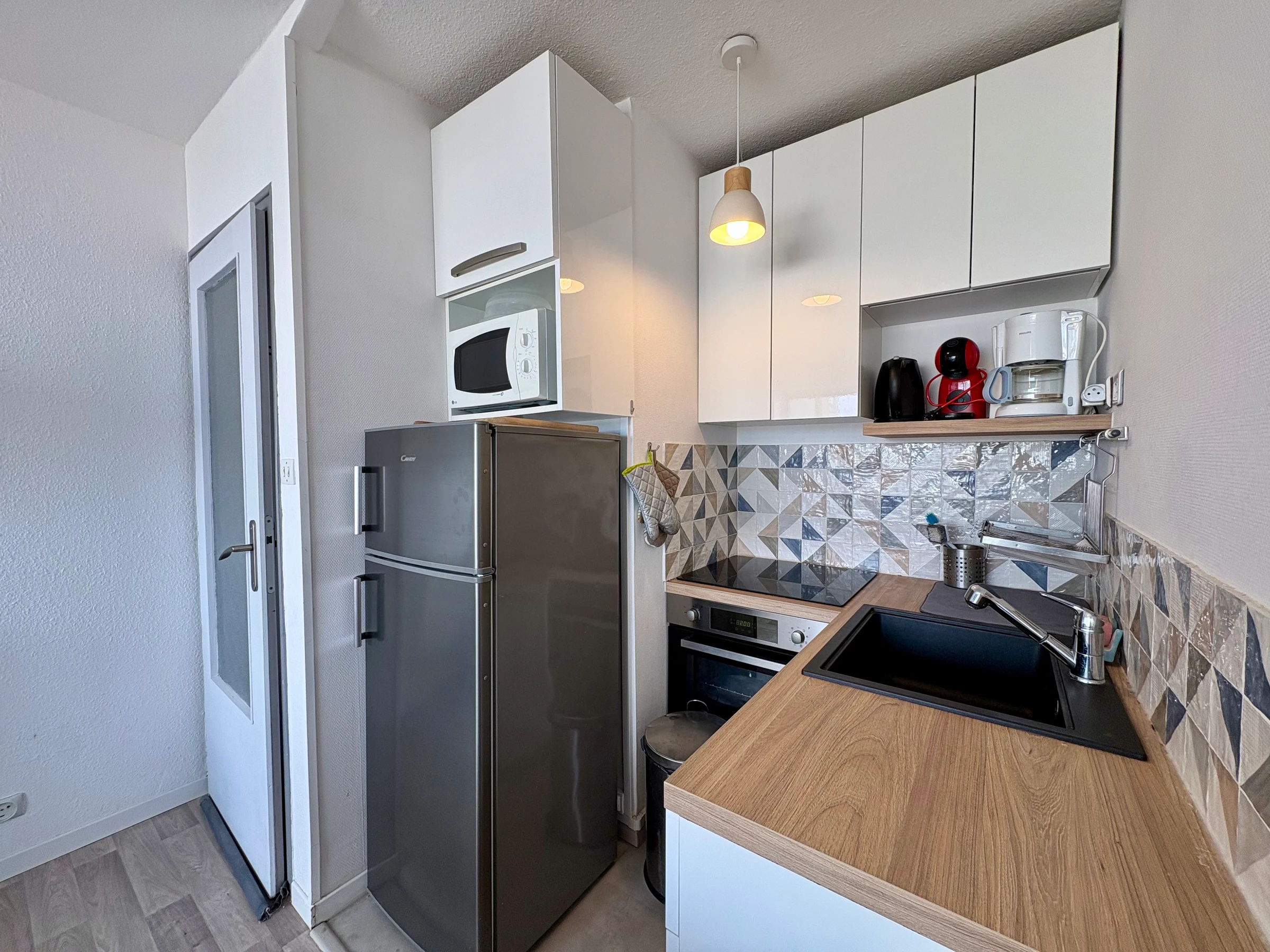 Cuisine fonctionnelle: Une cuisine équipée avec plaque induction, four, micro-ondes et réfrigérateur-congélateur, idéale pour préparer des repas.