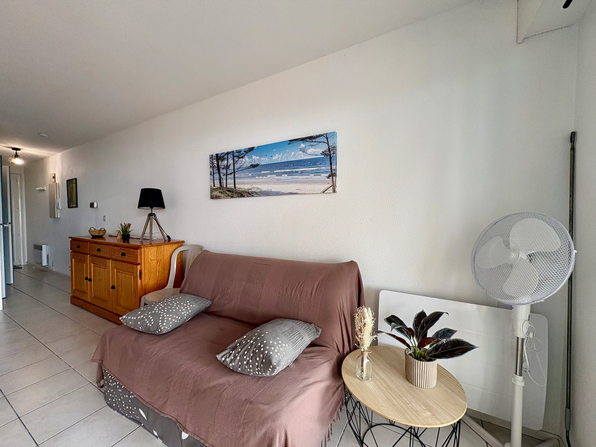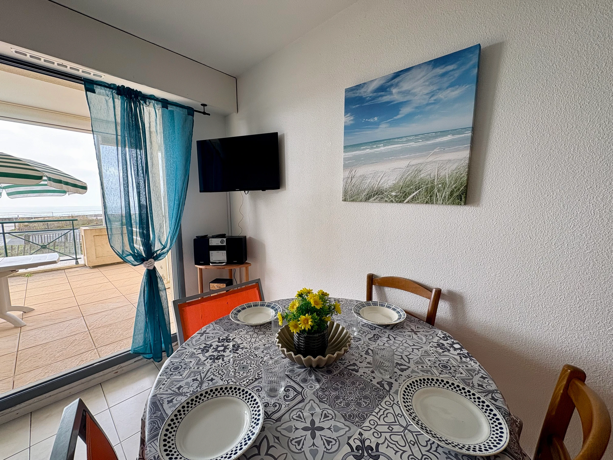- Salle de séjour de 17m² baie ouvrant sur terrasse face mer- 1 canapé-lit 2 places clic-clac TÉLÉVISION ÉCRAN PLAT