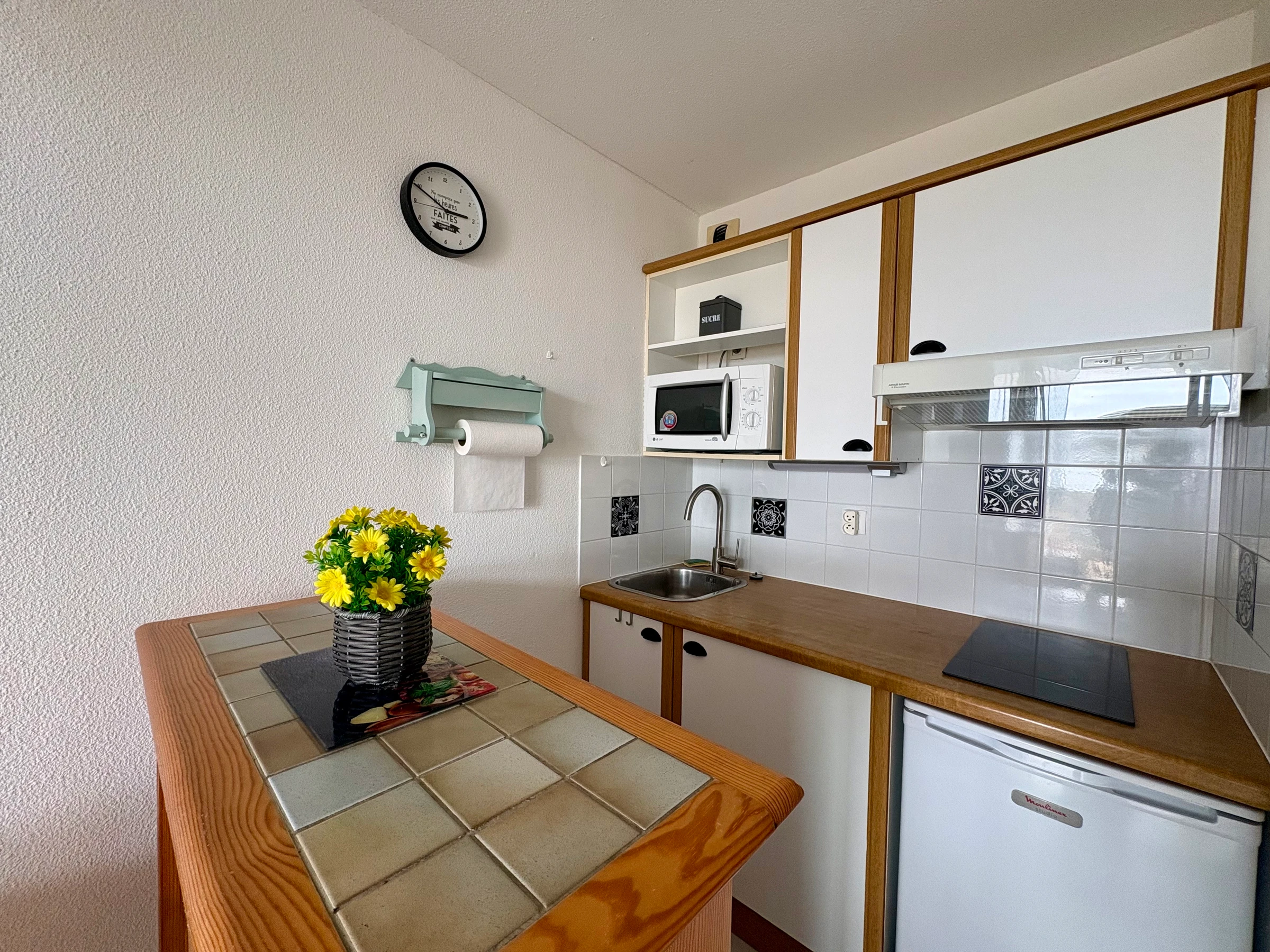 - Cuisine ouverte : 2 plaques inductions - mini-four électrique - réfrigérateur Top - MICRO-ONDES - cafetière - grille pain - b[hidden]lloire