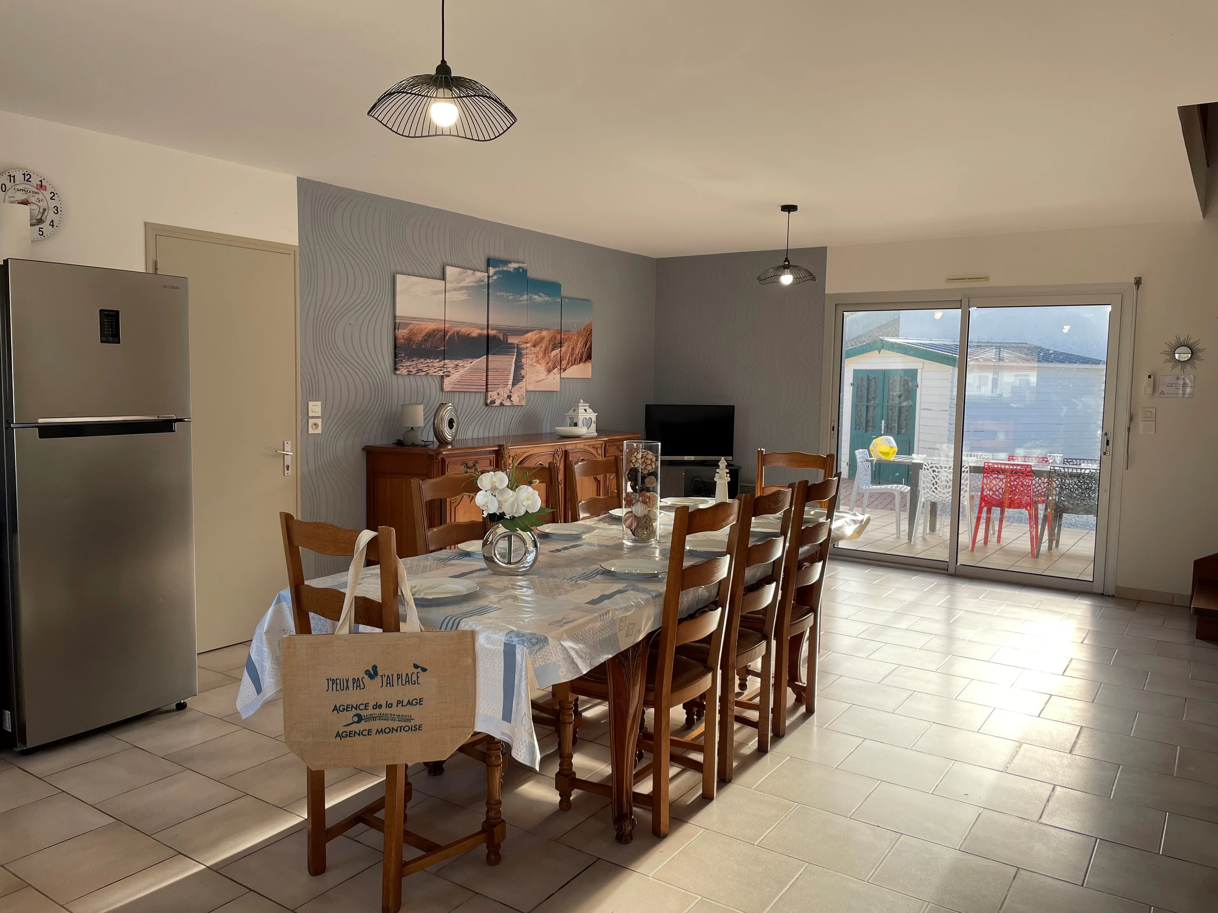 Salon/séjour : grande table dinatoire avec chaises, canapé, TV écran plat, baie vitrée donnant sur terrasse et cour clôturée