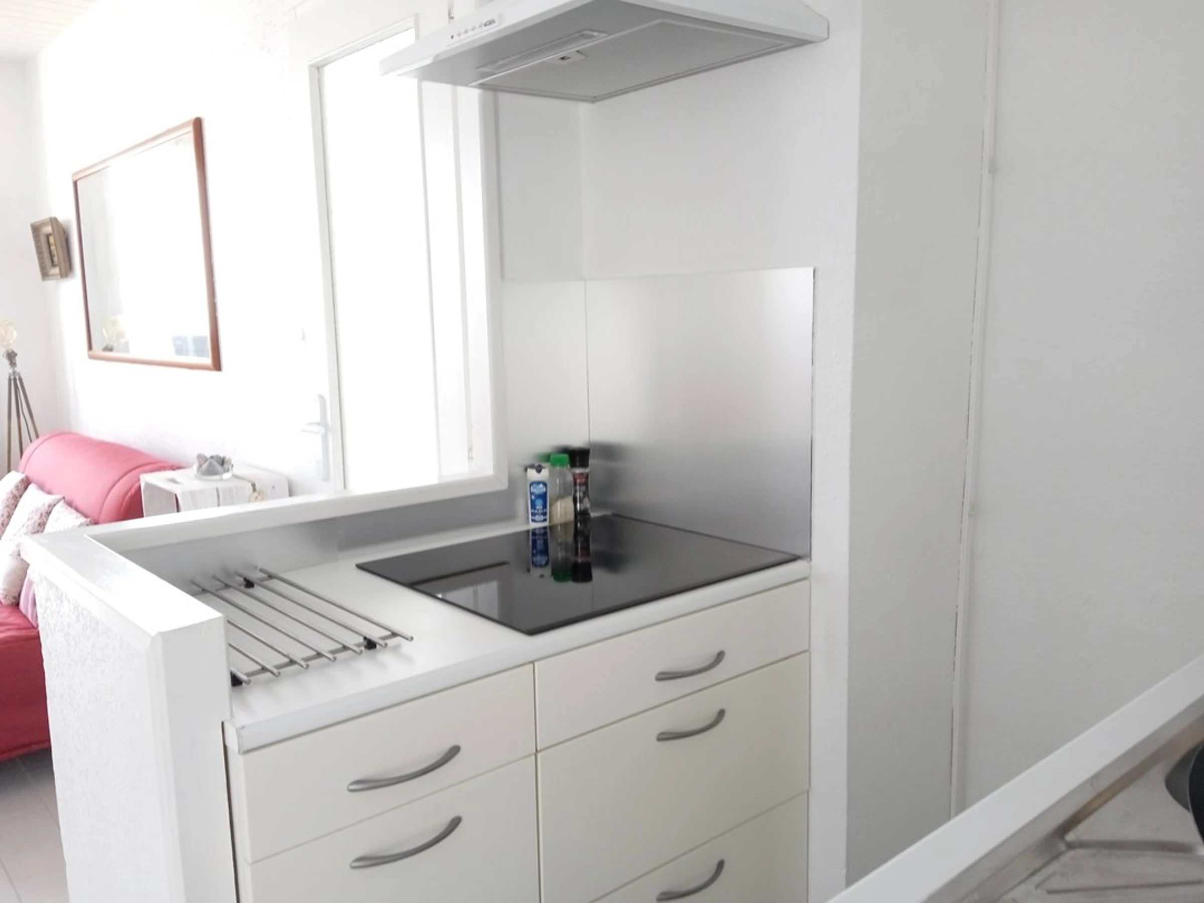 Une pièce de vie avec un coin cuisine aménagée et équipée (réfrigérateur top, plaques de cuisson induction, micro-onde, mini four et lave-vaisselle), un espace repas avec table et chaises, un coin salon avec canapé, table basse et une télévision. Un accès sur la loggia et sa splendide vue mer.