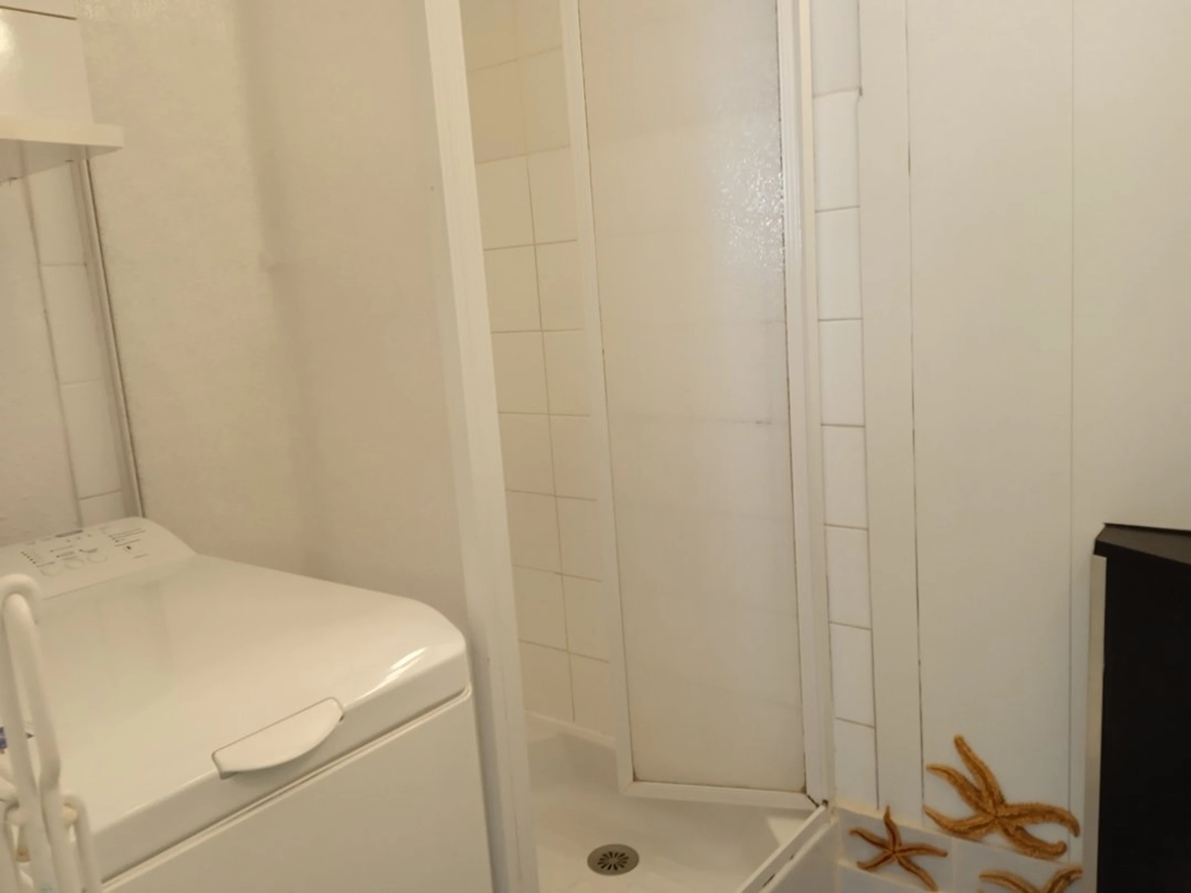 Une salle d'eau avec meuble vasque, douche et lave-linge.
