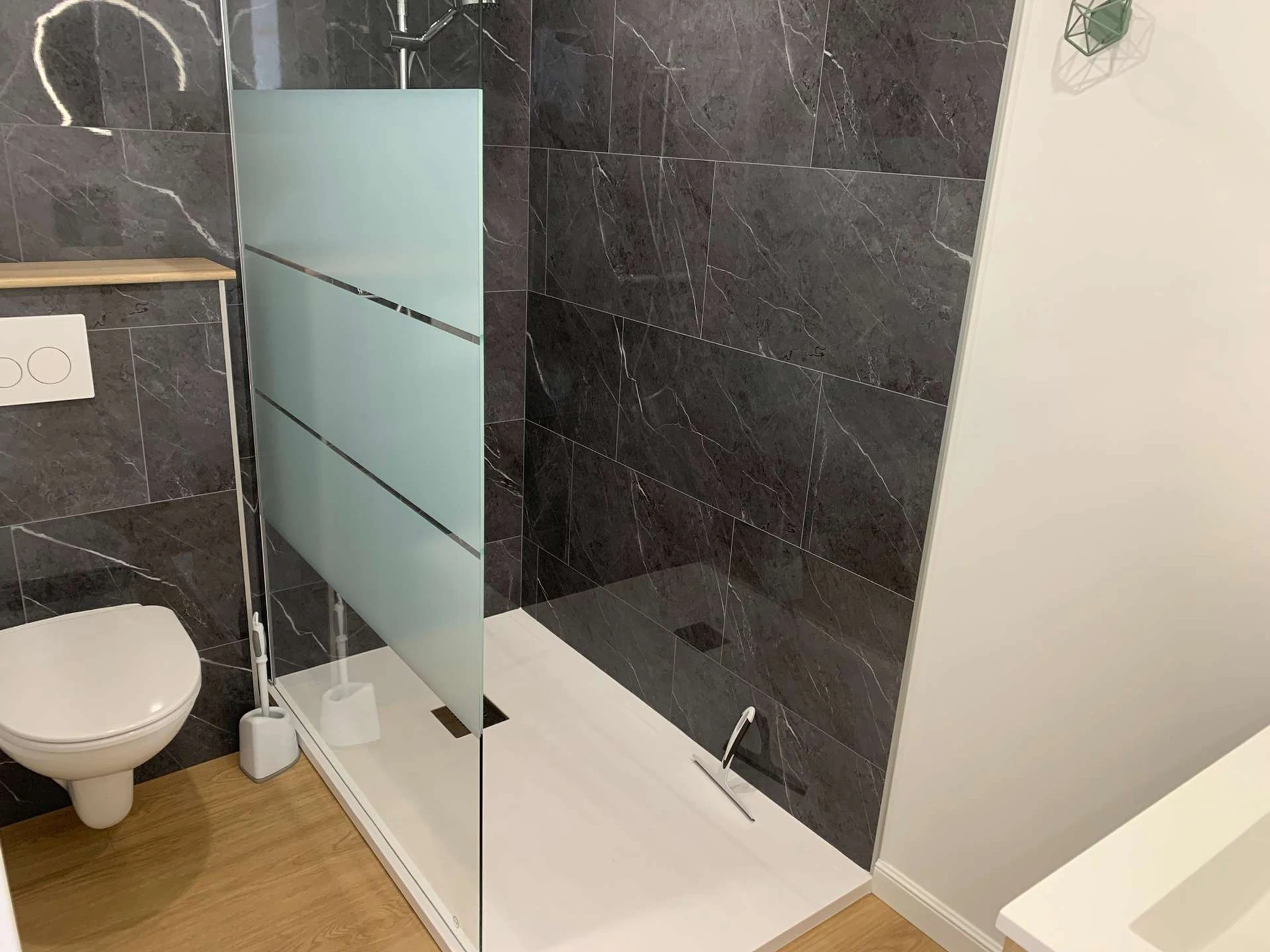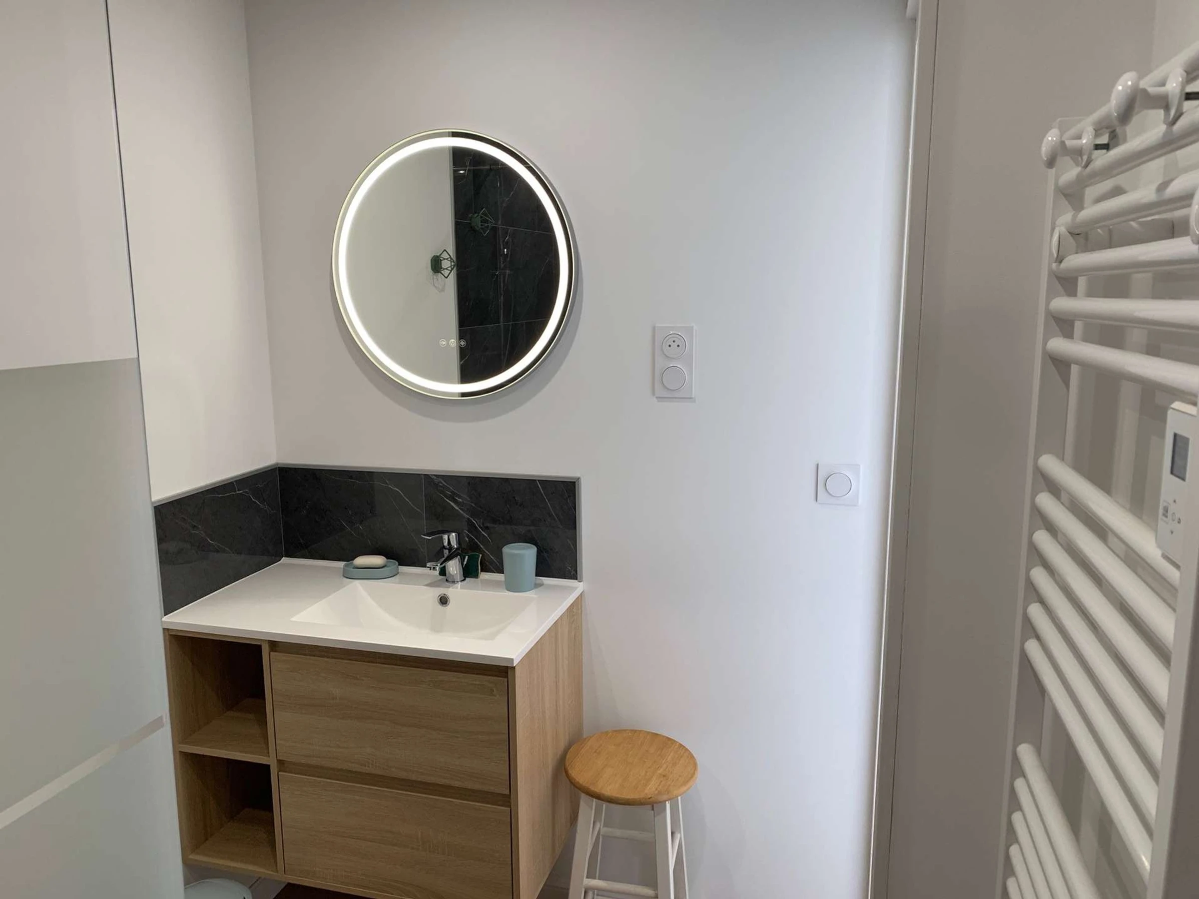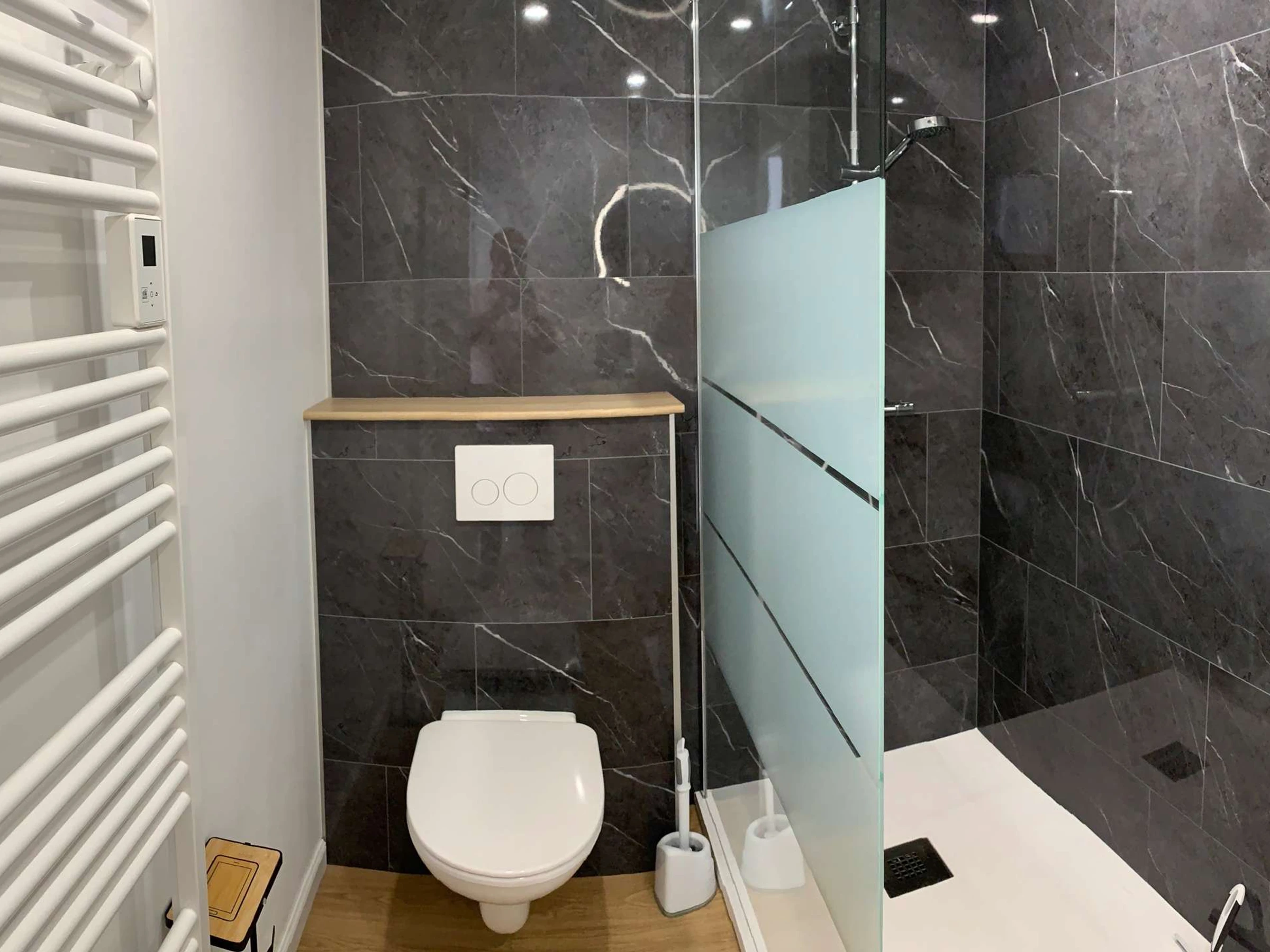 Une salle d'eau avec douche à l'italienne, vasque, sèche serviette et wc suspendu.